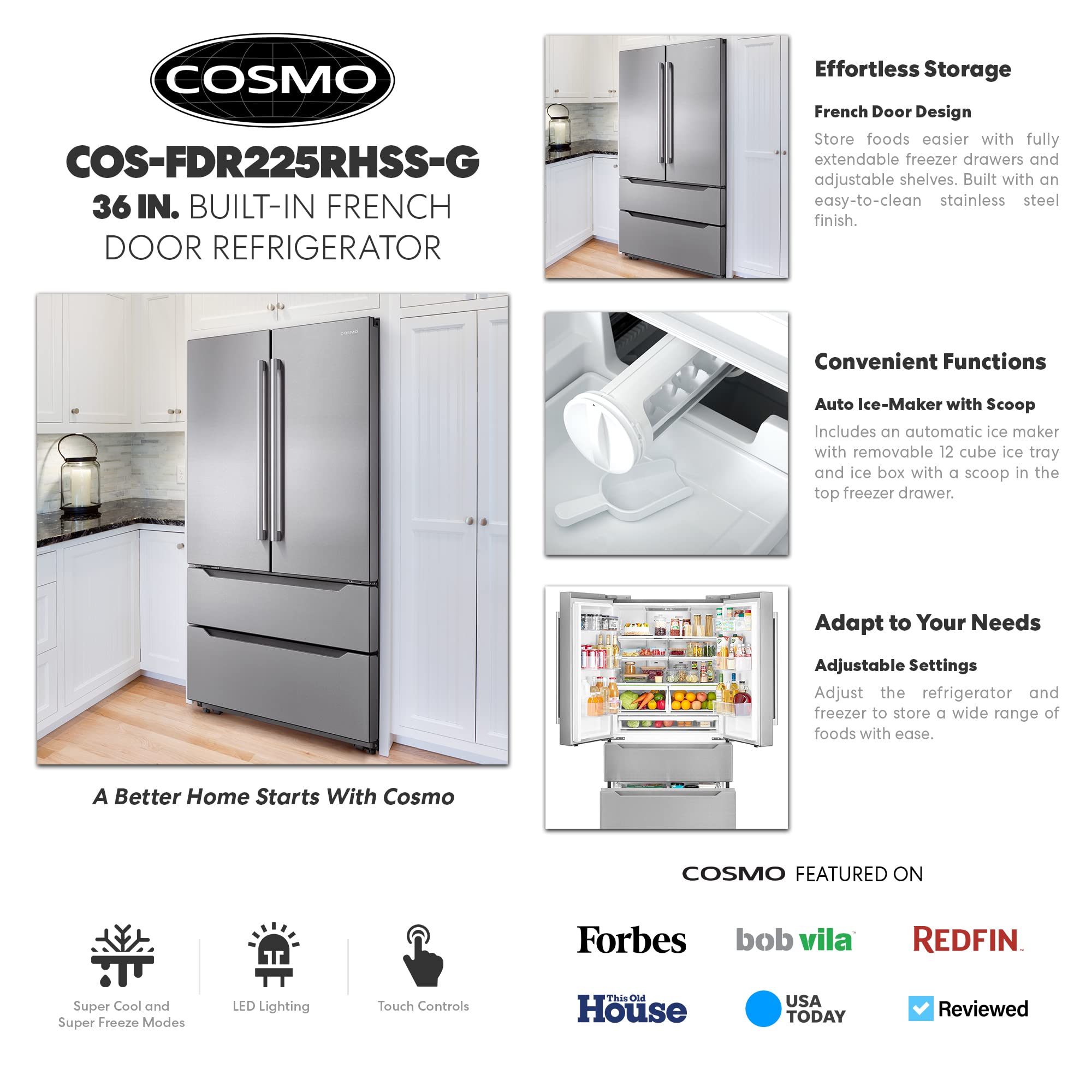 Cosmo’s Counter Depth French Door Refrigerator with 22.5 cu. ft. capacity has a sleek and smooth exterior design with impressive innovative features. Including a spacious bottom-freezer, this refrigerator offers organizational versatility for effortless storage and access to a wide range of foods from meats to fresh produce. Fully extendable freezer drawers, adjustable shelves and energy-efficient LED lights provide a clear view of all your fresh food. Our advanced preservation technology ensures you experience pleasure and convenience on a whole new level with perfect storage temperatures for maintaining fresher fruit, vegetables, fish, meat and dairy products. The Lumin Collection brings enhanced functionality and design, offering a well-rounded option for those looking for more convenience and style in an appliance.