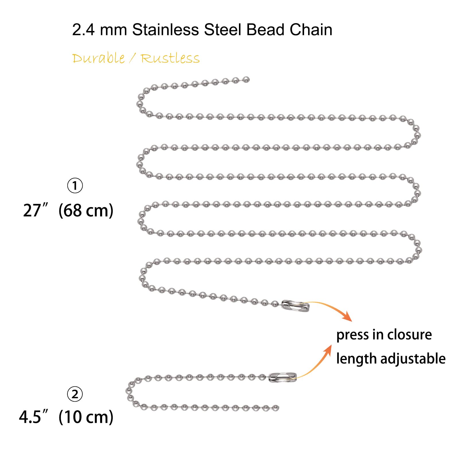 2.4 mm real stainless steel bead chains necklace for soldier wearing, short: 10cm(4.2"); Long: 68cm(27"), custom cut for wearing