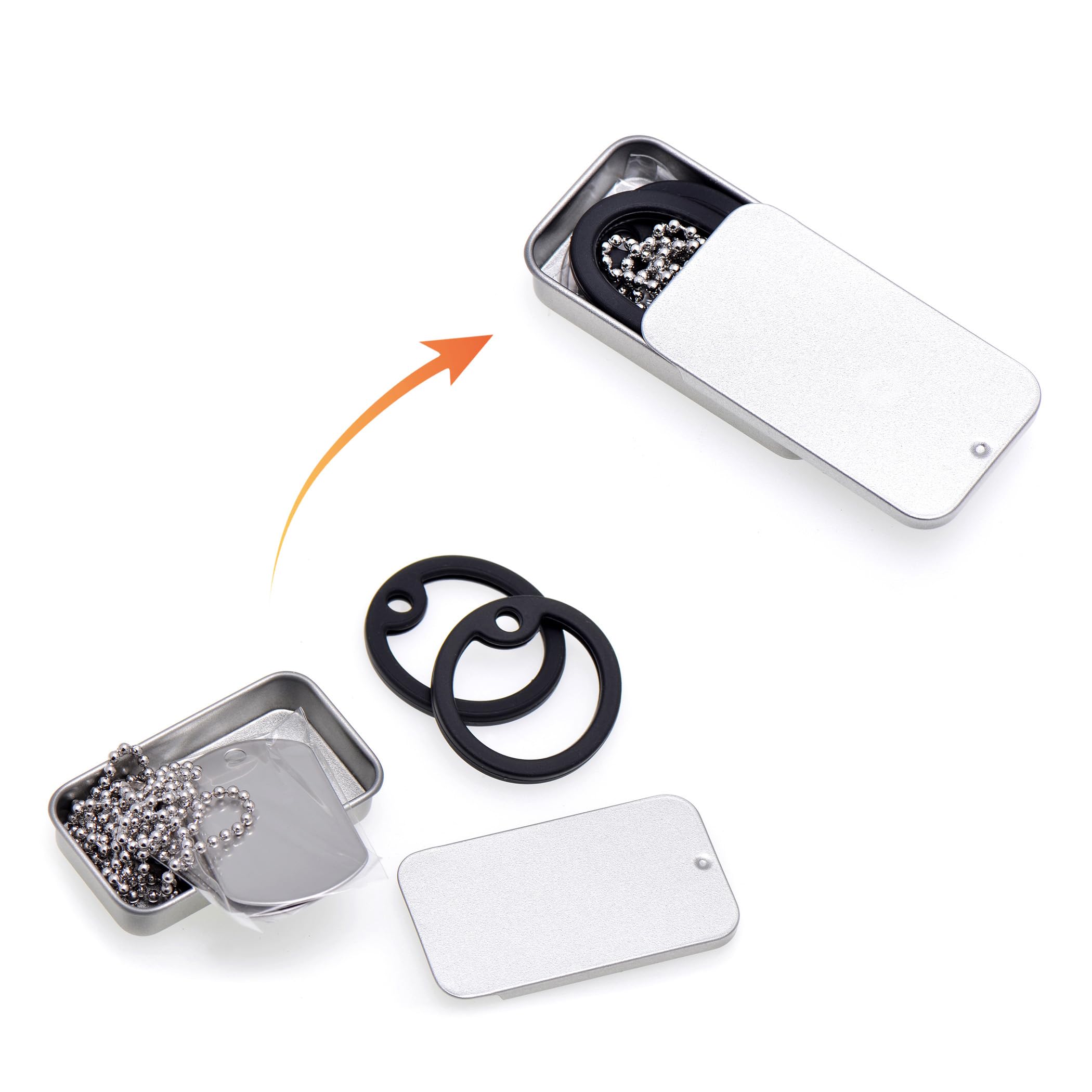 Stainless steel dog ID tags chain necklace set packed in a tin box Blank dogtags fitting for personalized engraving letters, numbers and patterns Two black color of rubber silencers attached 2.4mm ball chain / real stainless steel necklace for wearing, durable, not rust
