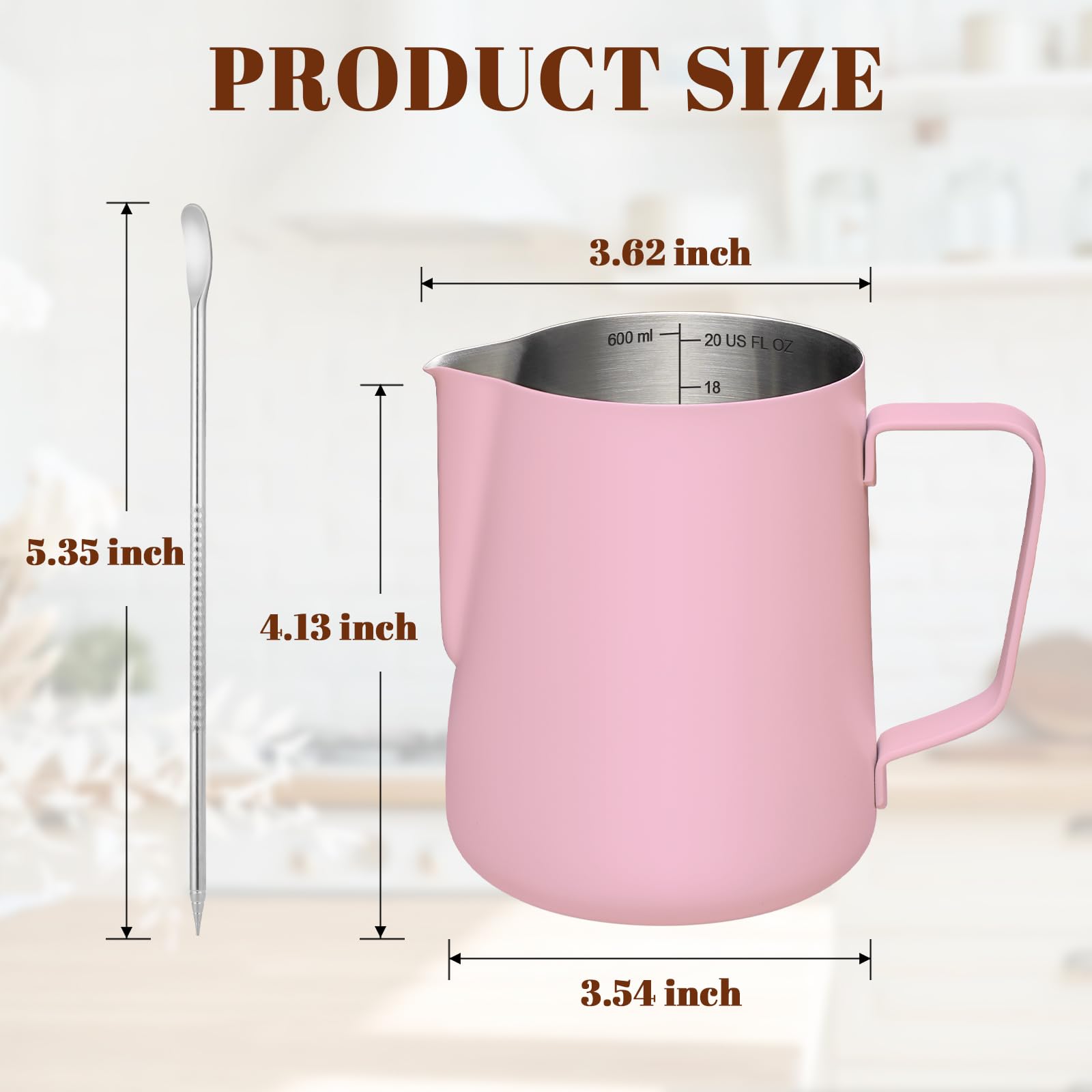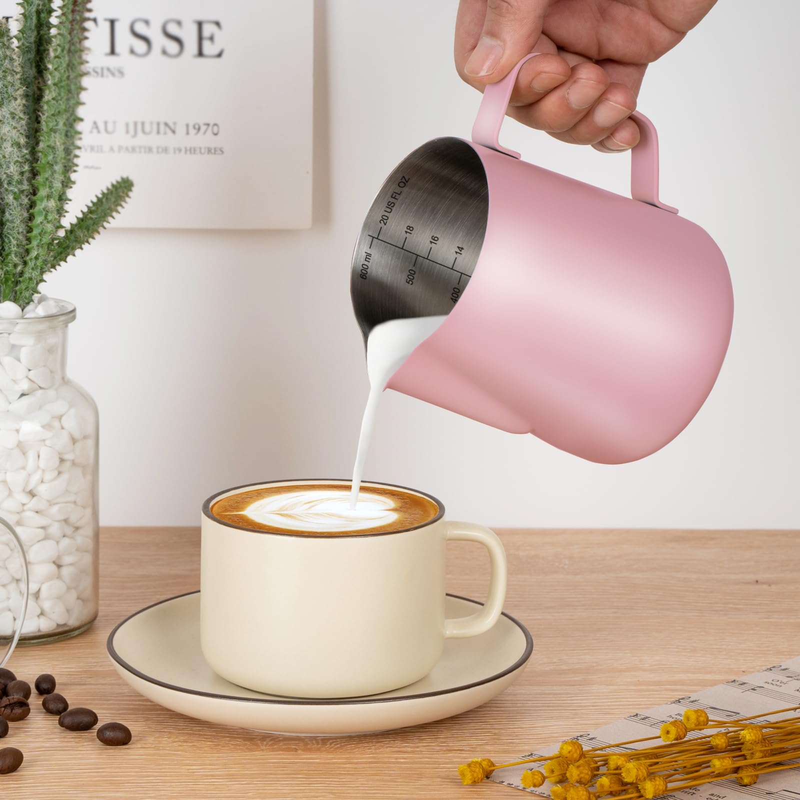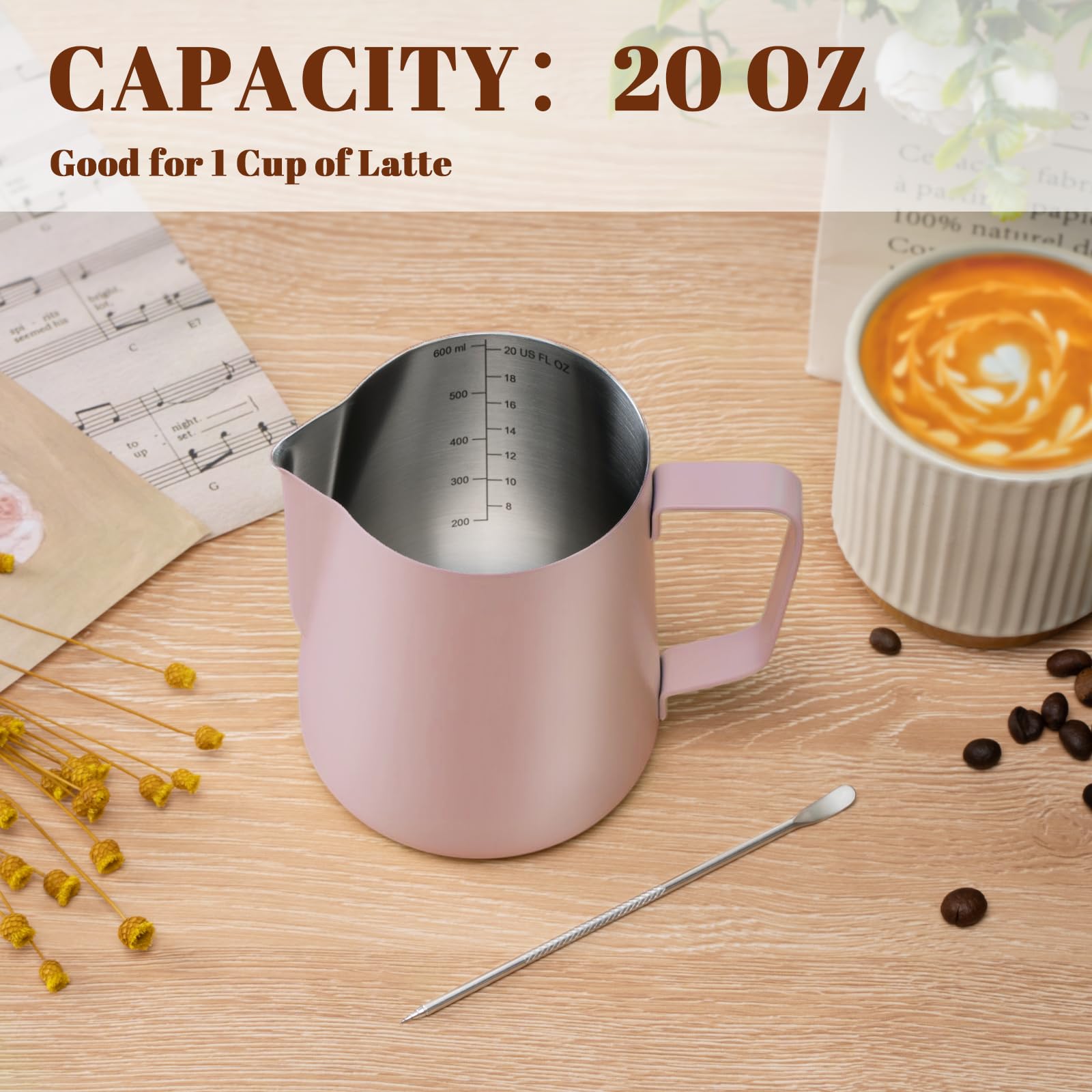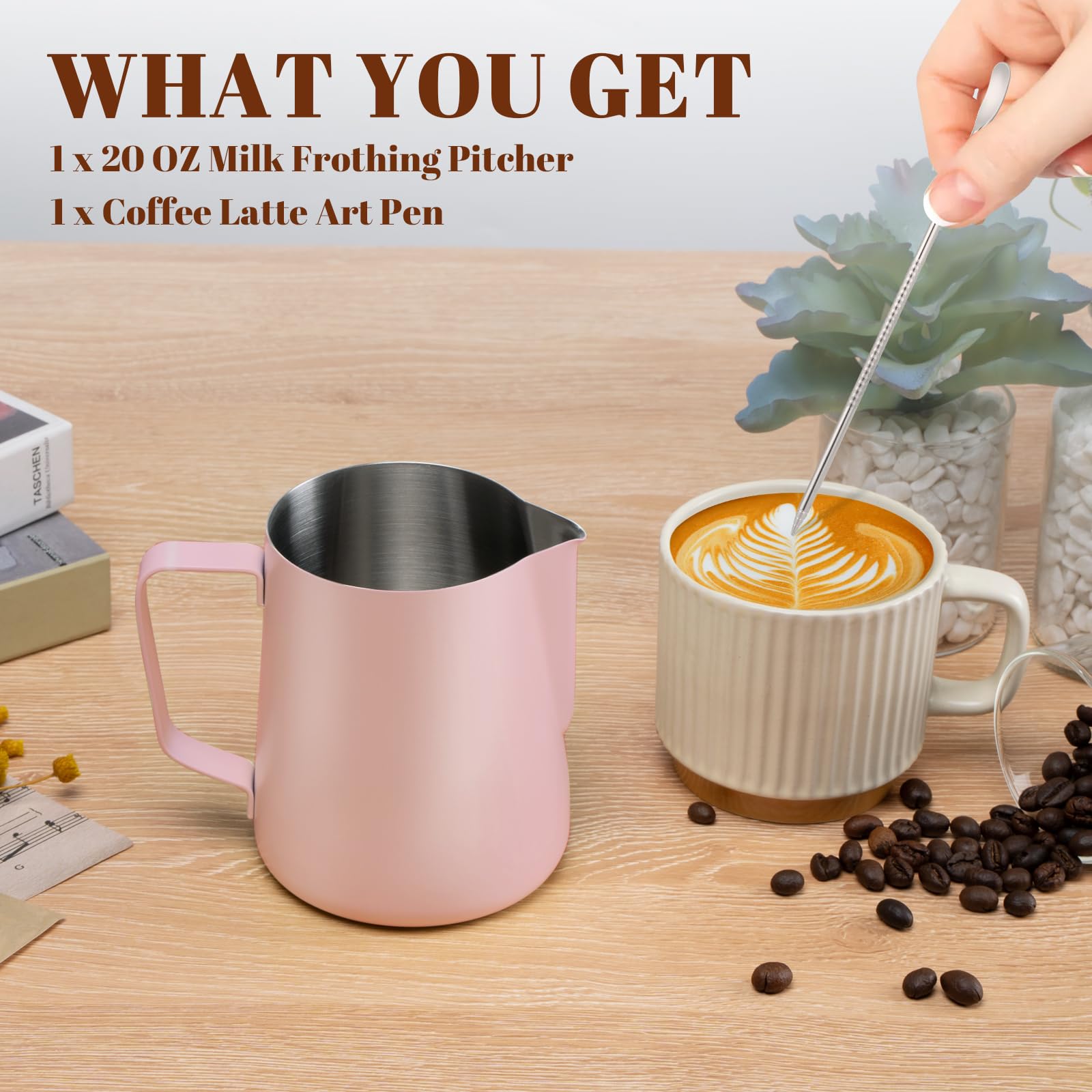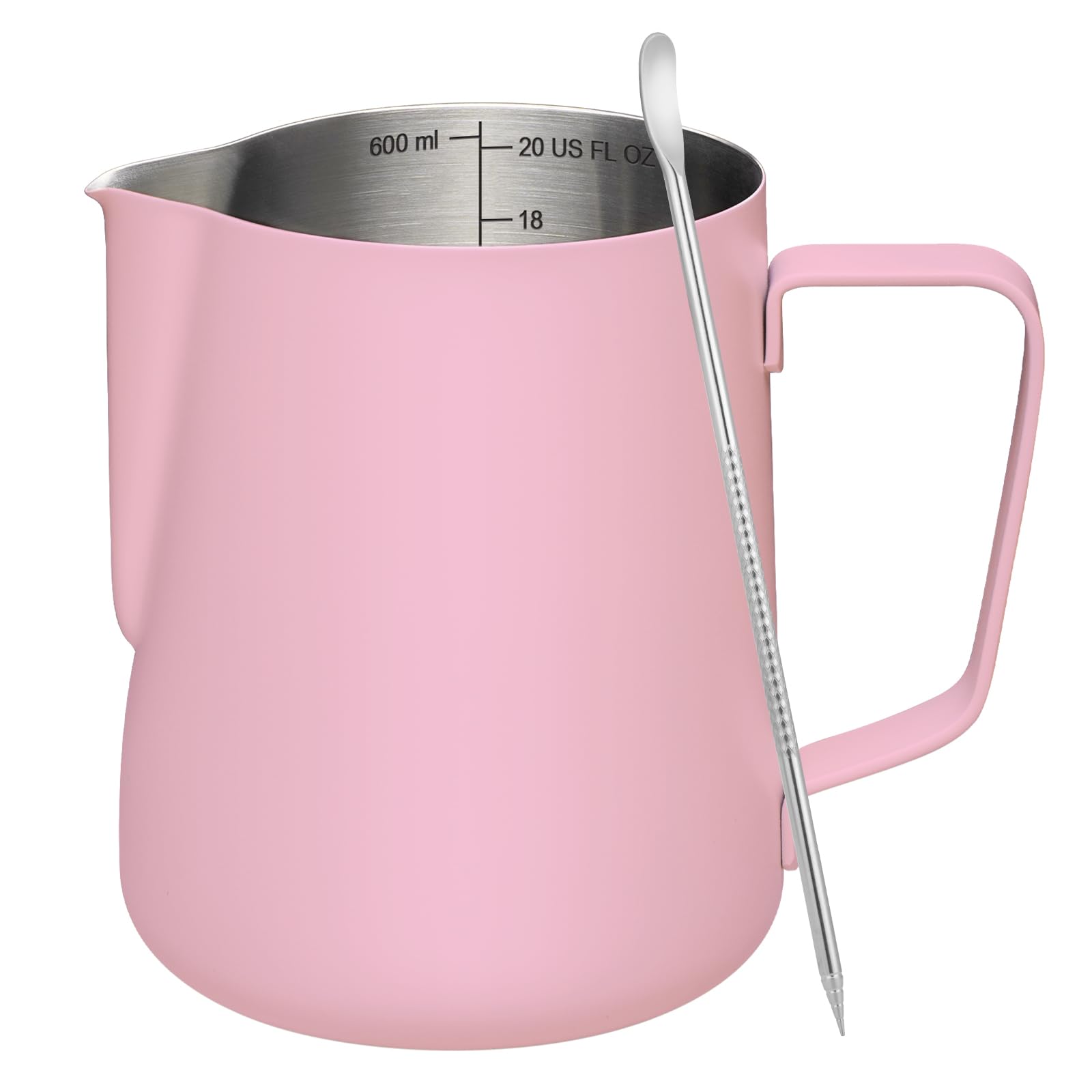 COMFORTABLE HANDLE: The handle of the milk frothing cup is ergonomically designed, with rounded top and bottom corners; easy to gripping and use, allowing you to make beautiful coffee art patterns with your hands