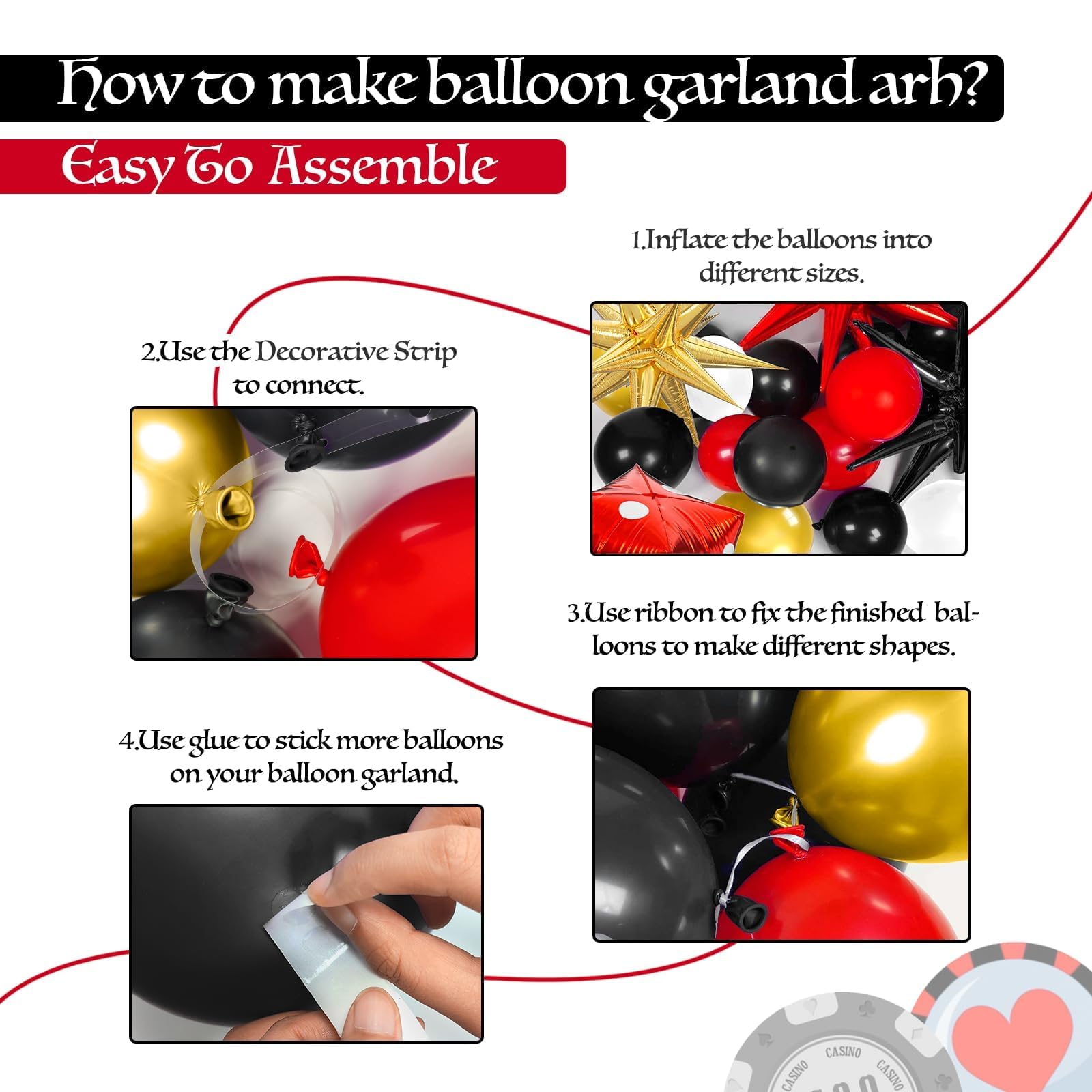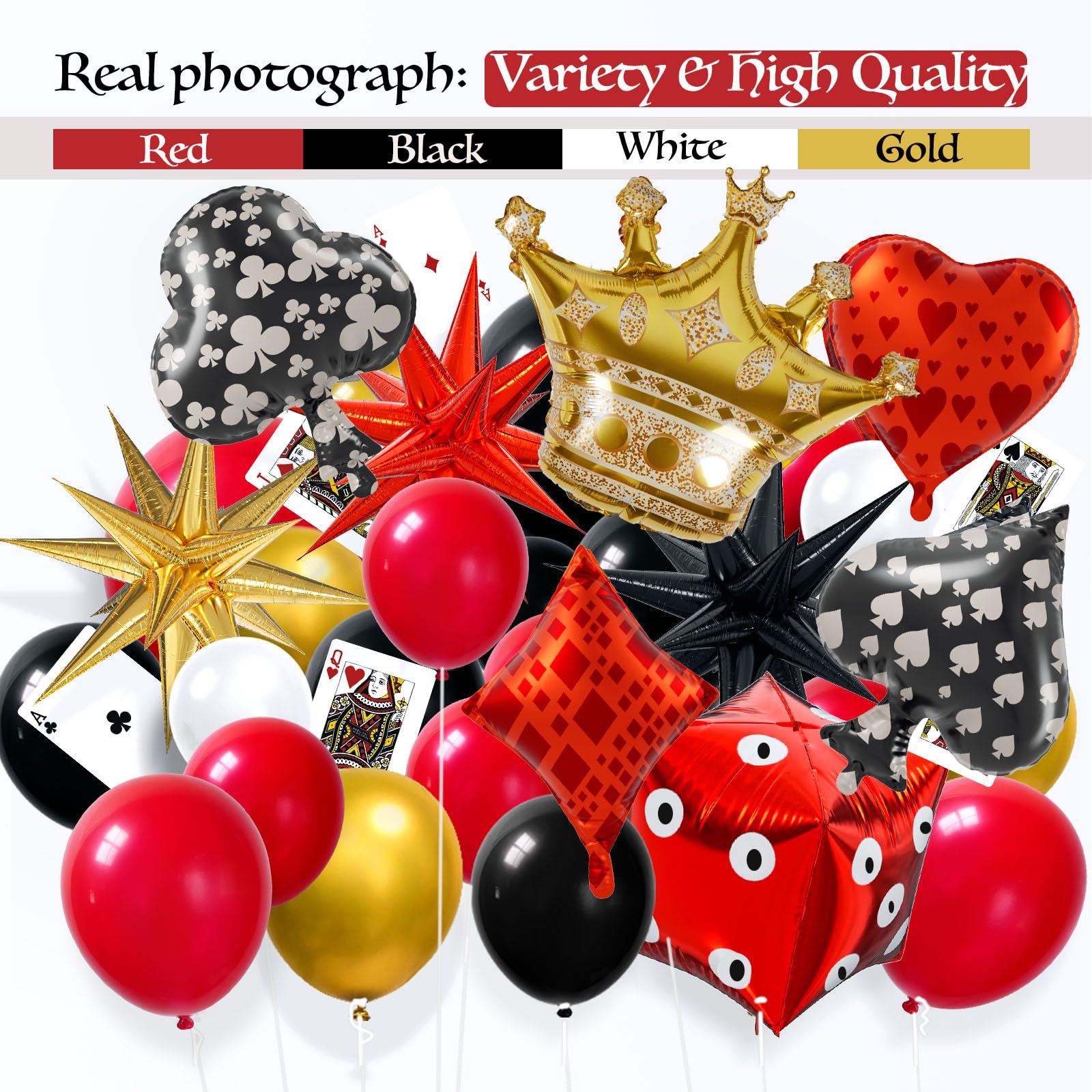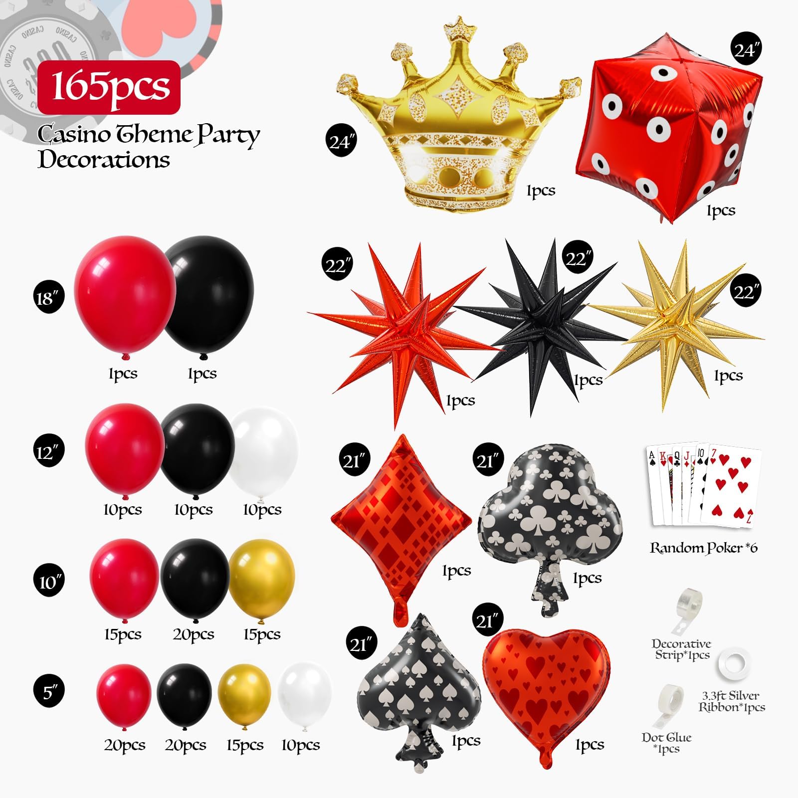 Package Include: The kit include 51pcs black balloons(18inchx1, 12inchx10, 10inchx20, 5inchx20), 36pcs red balloons(18inchx1, 12inchx10, 10inchx15, 5inchx20), 30pcs metallic gold balloons(10inchx15, 5inchx15), 20pcs white balloons(12inchx10, 5inchx10), 5pcs foil Balloons (24inch gold crown foil balloonsx1, 24inch red dice foil balloonsx1, star foil balloonsx3) , 4pcs poker foil balloons (heart, spade, club, diamond), glue dotx100, ribbonsx1, decorative stripx1, random pokerx5