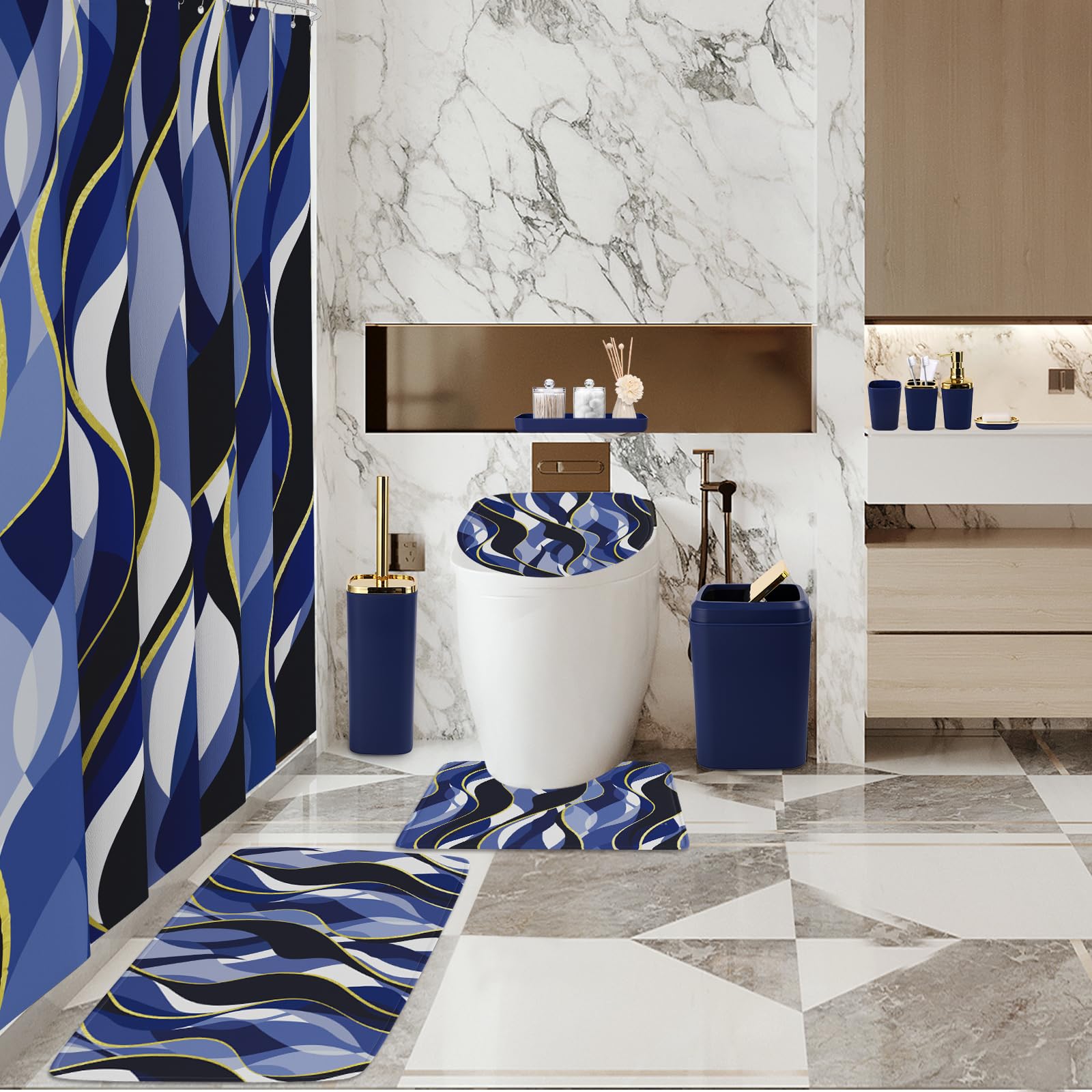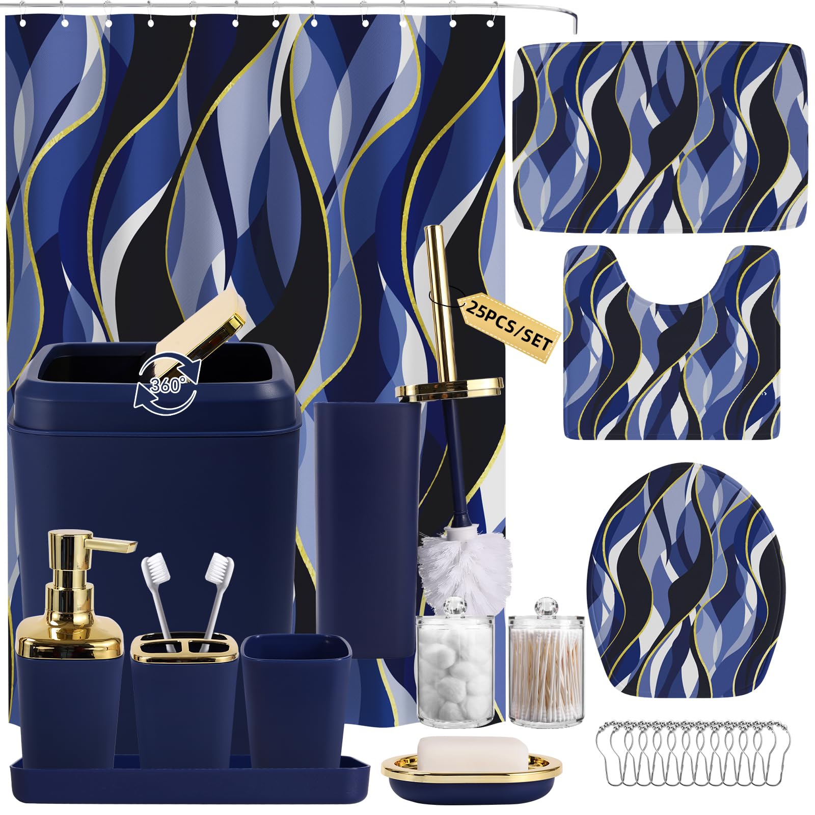 ใ๐๐๐ญ๐ก๐ซ๐จ๐จ๐ฆ ๐๐๐ญ๐ฌ ๐ฐ๐ข๐ญ๐ก ๐๐ก๐จ๐ฐ๐๐ซ ๐๐ฎ๐ซ๐ญ๐๐ข๐ง ๐๐ง๐ ๐๐ฎ๐ ๐ฌใIncludes 3 bathroom rugs, soap dispenser, toothbrush holder, tumbler, soap dish, bathroom trash can, toilet brush and holder set, bathroom tray, 2 qtip holders, 12 shower curtain hooks, and printed shower curtain set.