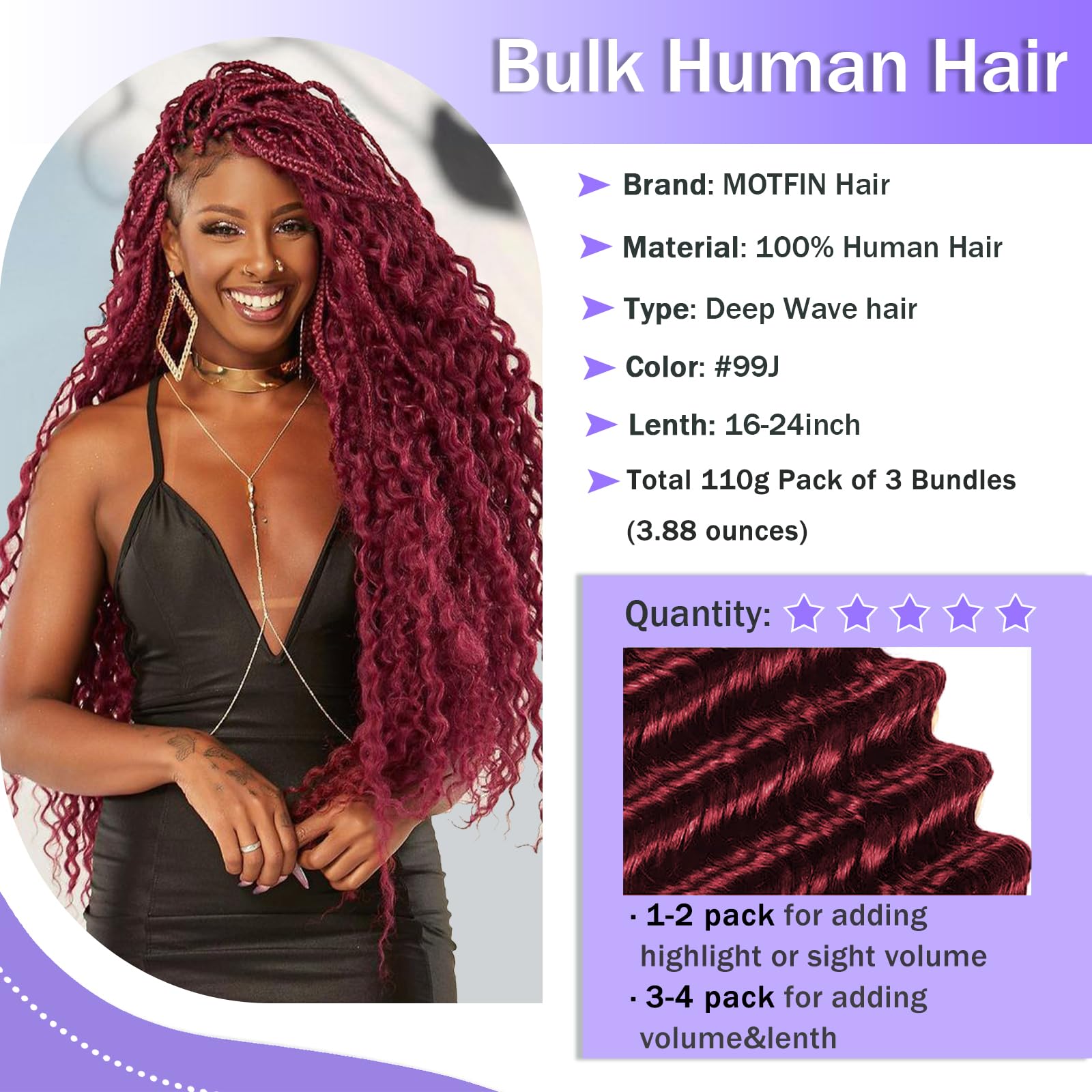 More Thoughtful Design: We've designed our water wave braiding hair with you in mind! Each pack contains 3 bundles, which is more convenient than 2 bundles. Our wet and wavy braiding hair is 110G per pack. We recommend using 2 packs to achieve perfect braids. This thoughtful design makes it easier for you to create your desired look.