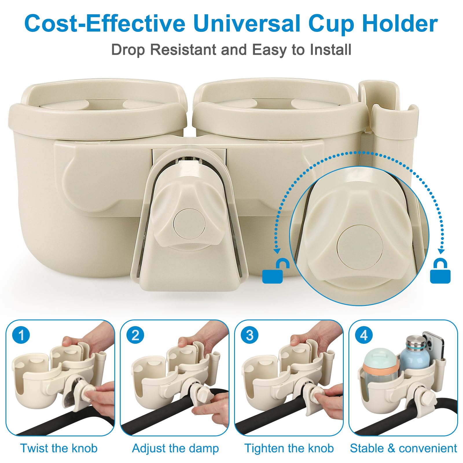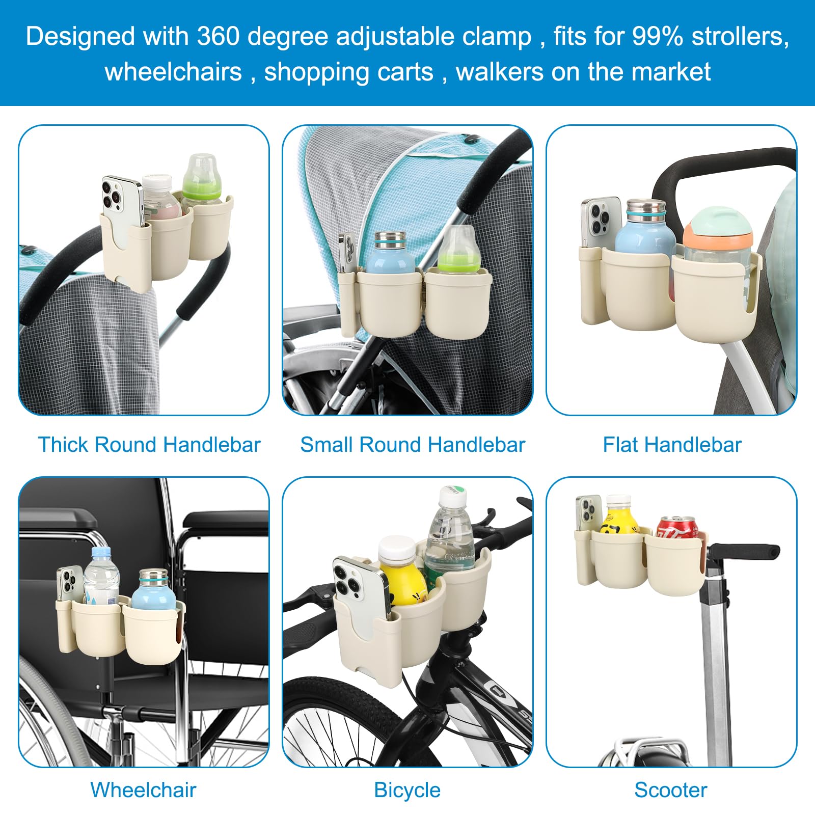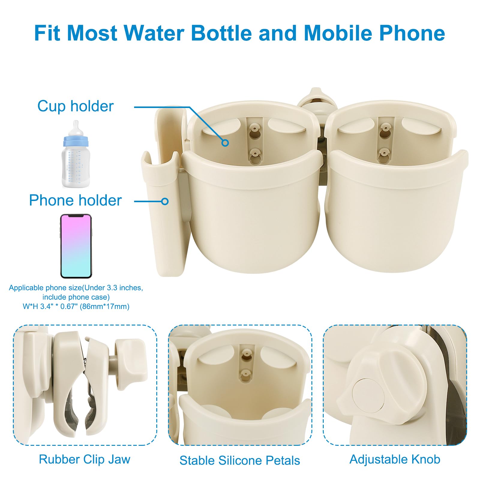 Wide Compatibility: This universal cup holder with phone holder compatible with most baby strollers, walker, wheelchair, rollator, bike, scooter, boat handle bar, shopping cart, kayak, ATV, lawnmowers, motorcycle, treadmill, golf push cart and so on.