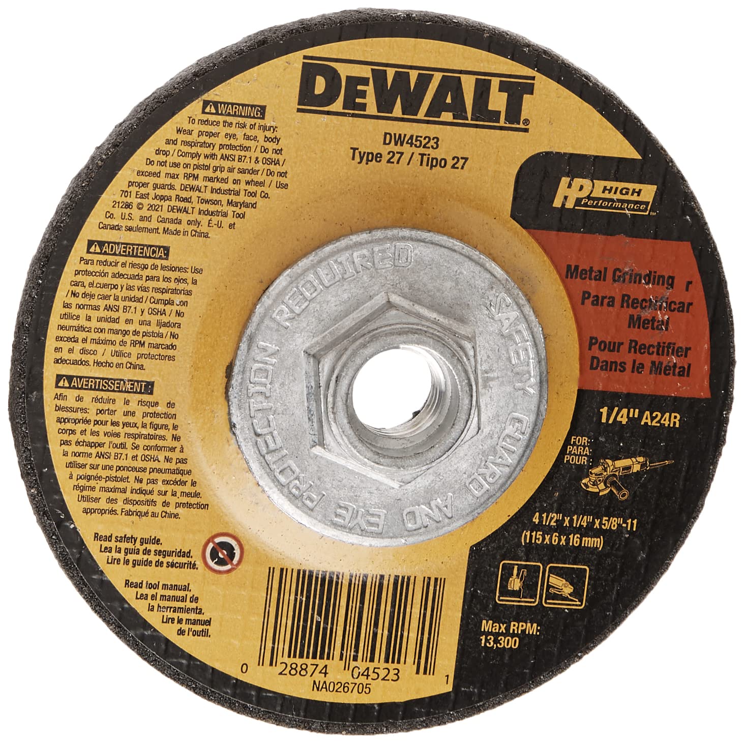 Product Description Crafted from high-performance aluminum oxide grain for durability and optimal material removal, DEWALT Type 27 HP Metal 4 1/2 Grinding Discs grind and shape a variety of metals and non-ferrous materials. High grain concentration of the grinder wheel is made for aggressive grinding action and smooth-running wheels. From the Manufacturer DEWALT DW4523 4-1/2-Inch X 1/4-Inch X 5/8-Inch General Purpose Metal Grinding Wheel