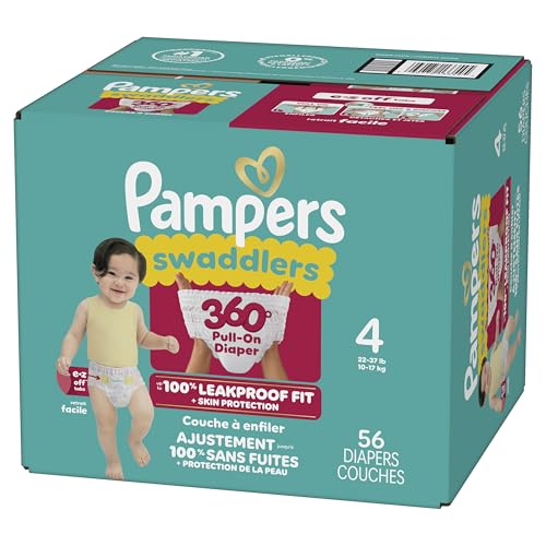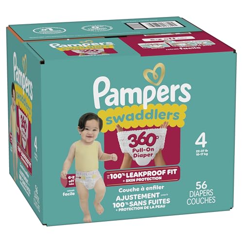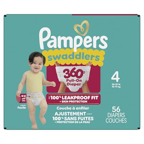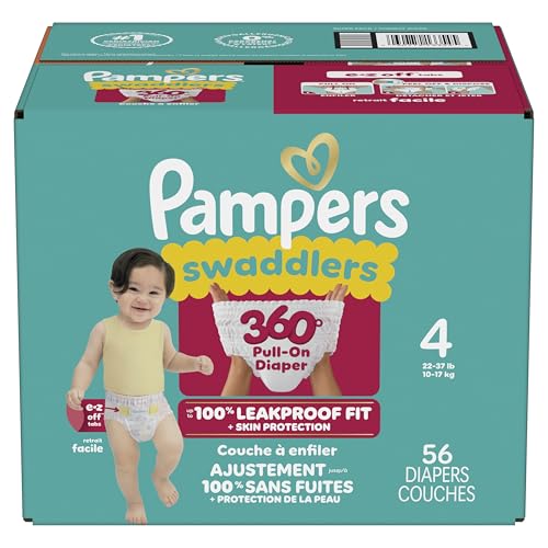The Pampers Swaddlers 360° comfy, dry protection you know and love just got updated—with E-Z Off tabs for even easier changes. Featuring ultrasoft absorbent layers and Dual-Leak Guard Barriers that help protect where leaks happen most, these diapers provide up to 100% leakproof skin protection for your little one! From the #1 Pediatrician Recommended Brand*, Pampers Swaddlers 360° are designed to support your toddler’s movement from crawling age to standing age with a 360-degree stretchy waistband. The new EZ-off tabs make changes stress-free and mess-free—whether your little one is lying down or standing up—just tab off, wrap up, and pull on a fresh diaper pant. Swaddlers 360° toddler diapers offer trusted protection you can count on: they’re hypoallergenic, dermatologically tested, and free of parabens and latex. Plus, Dual LeakGuard Barriers and a blowout barrier help prevent up to 100% of leaks—even blowouts! To find your baby’s ideal Comfy Dry Fit, just measure by weight and reference our available baby diaper sizes: • Size 3 diapers (16–28 lbs.) • Size 4 diapers (22–37 lbs.) • Size 5 diapers (27+ lbs.) • Size 6 diapers (35+ lbs.) • Size 7 diapers (41+ lbs.) Pair Pampers Swaddlers 360° with Pampers Sensitive Baby Wipes to help make changes quick, easy, and gentle on your baby’s skin. *Based on 2021 survey of U.S. and Canadian pediatriciansSwaddlers 360° pull on diapers offer our best skin protection for your baby! The waistband stretches comfortably around your baby's waist and adapts to their every move for a soft and comfy fit — no tape needed.