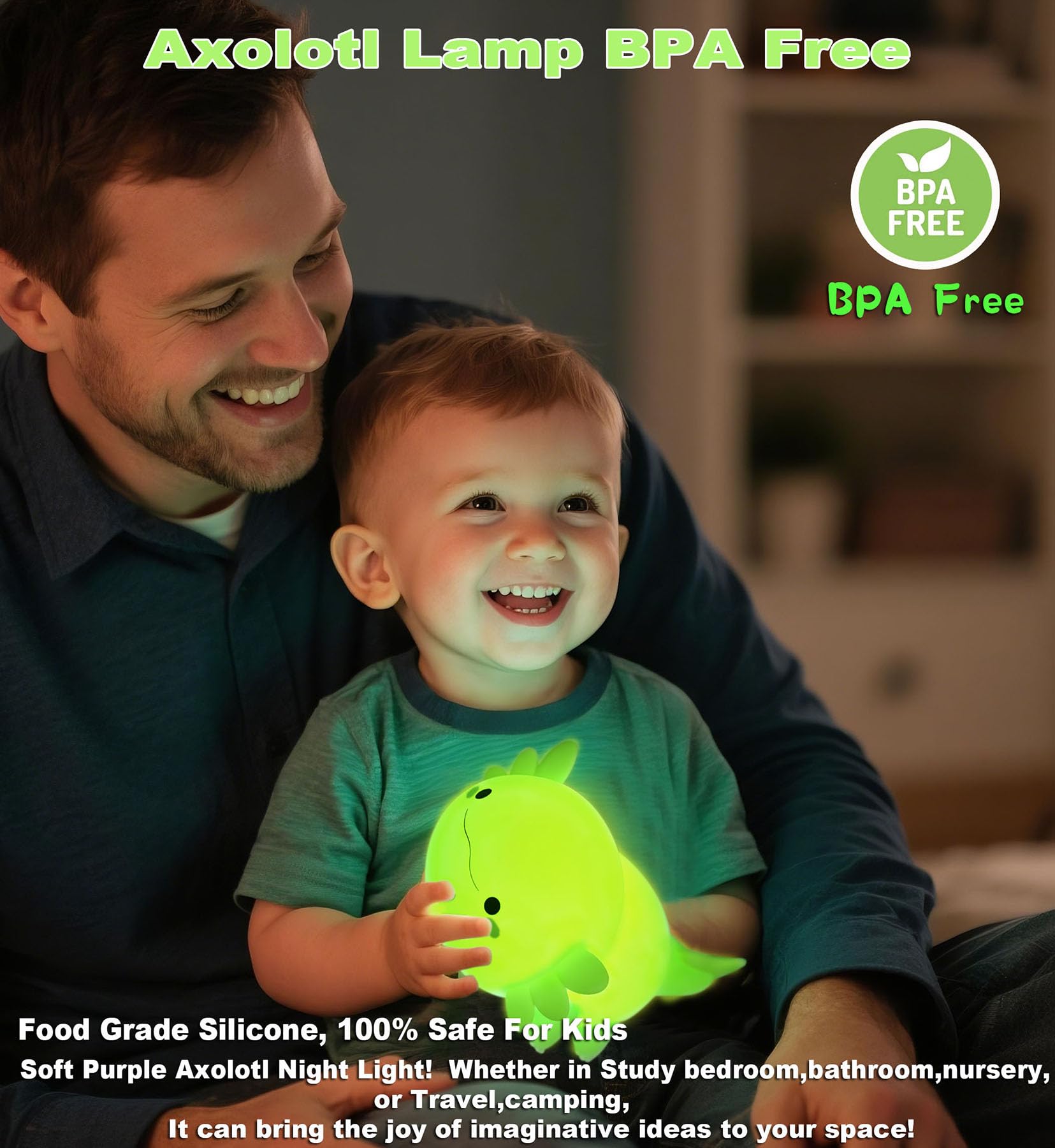 Dimmable and BPA Free:Cute Green Axolotl Night Light for Kids,Choose food grade silicone material,BPA free Soft and pinchable,that won't heat up while in use.Safe material and design suitable for everyone including babies,axolotl lamp has two brightness modes.Turn on the switch and simply tap the Axolotl light to switch brightness