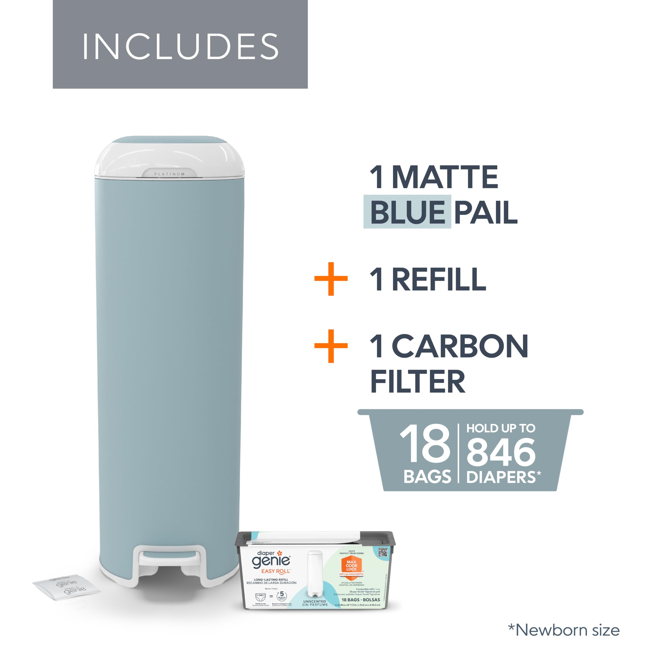 Keep your nursery fresh with our new metal pail! The new Diaper Genie Platinum pail is made of durable stainless steel and has odor-locking clamps that help prevent odors of messy diapers from escaping. With its 27" height, wide opening and foot pedal, the Diaper Genie Platinum offers true hands-free operation. Our diaper disposal system holds up to 47 newborn diapers and includes a long-lasting refill that can last up to 5 months or hold up 846 newborn diapers. The Easy Roll ™ refill bags are made from durable multi-layer film with odor-locking barrier technology. Refill includes 18 easy tear-off bags that are perforated for convenient use and disposal. The pail is available in lilly white, stone grey, cloud blue and sage green.