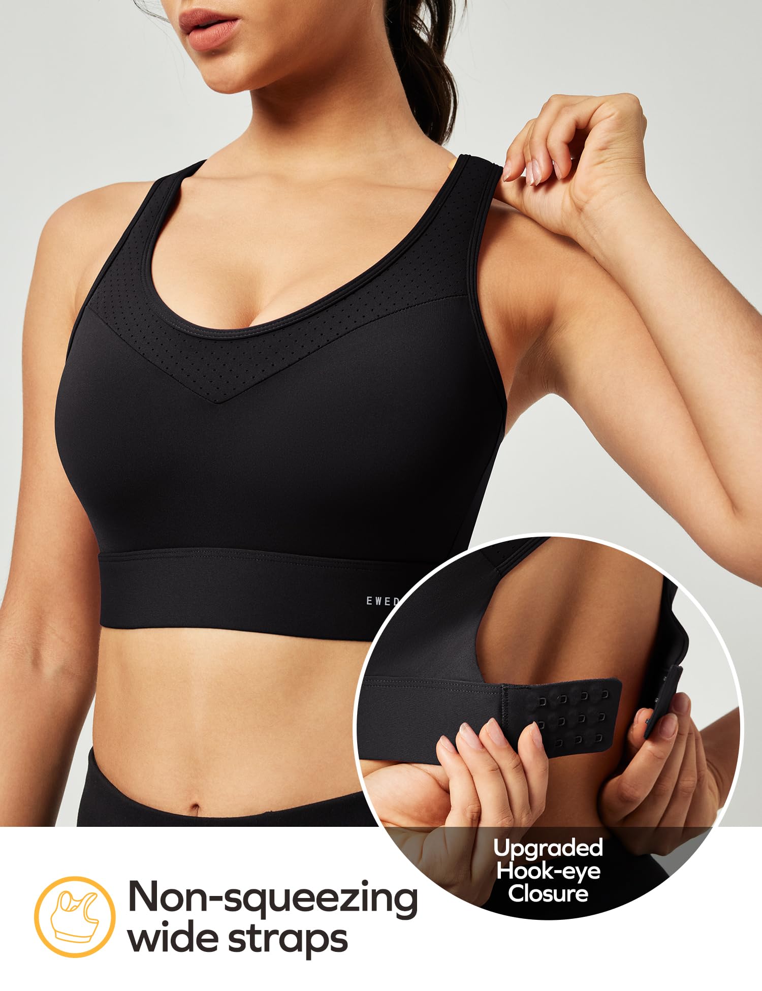 Strps Do Not Dig In: The strategically designed soft and wide straps do not dig into your shoulders, instead it gives your body the ultimate comfort. This innovative technology from Ewedoos sports bras will greatly enhance your performance in all kinds of sports activities.