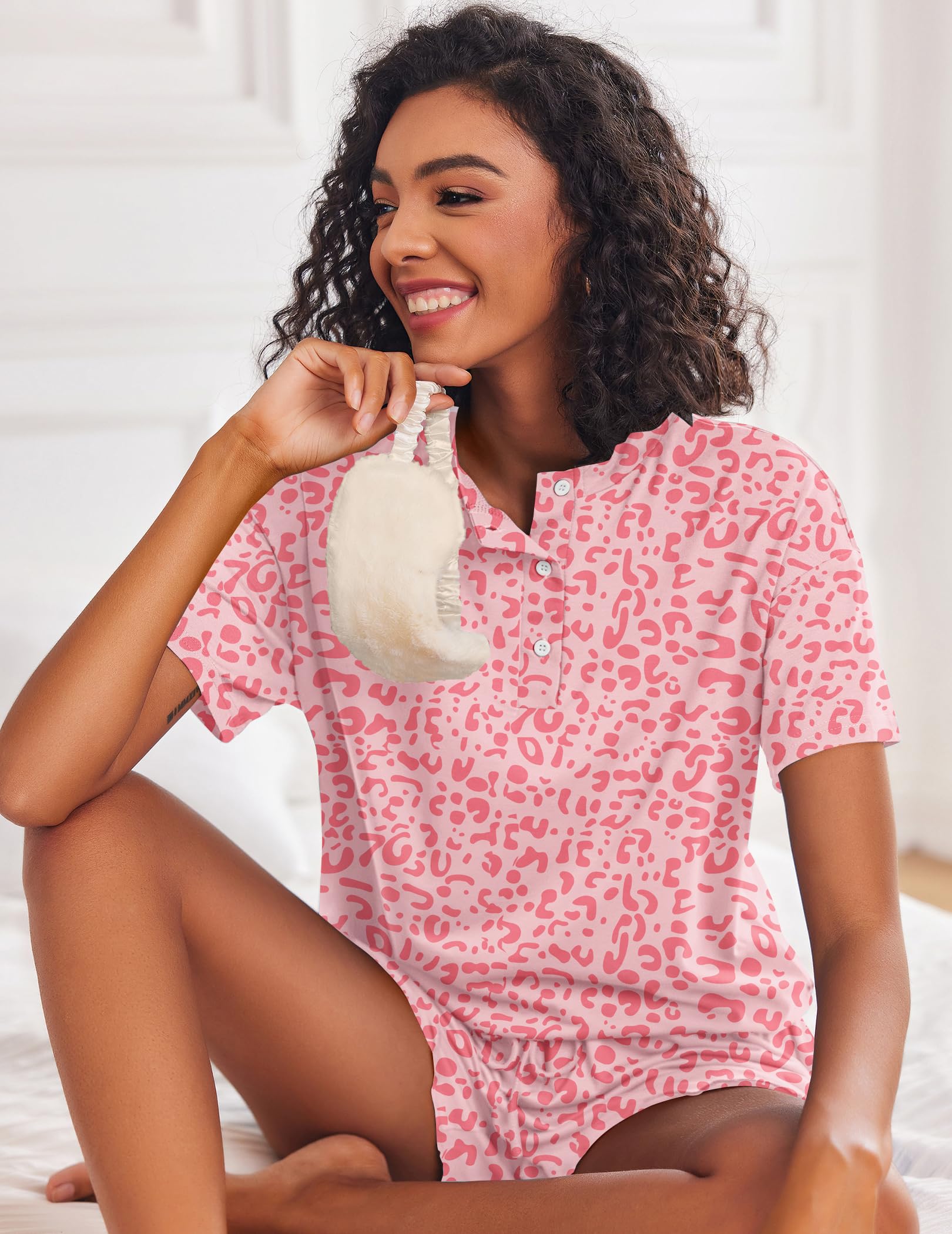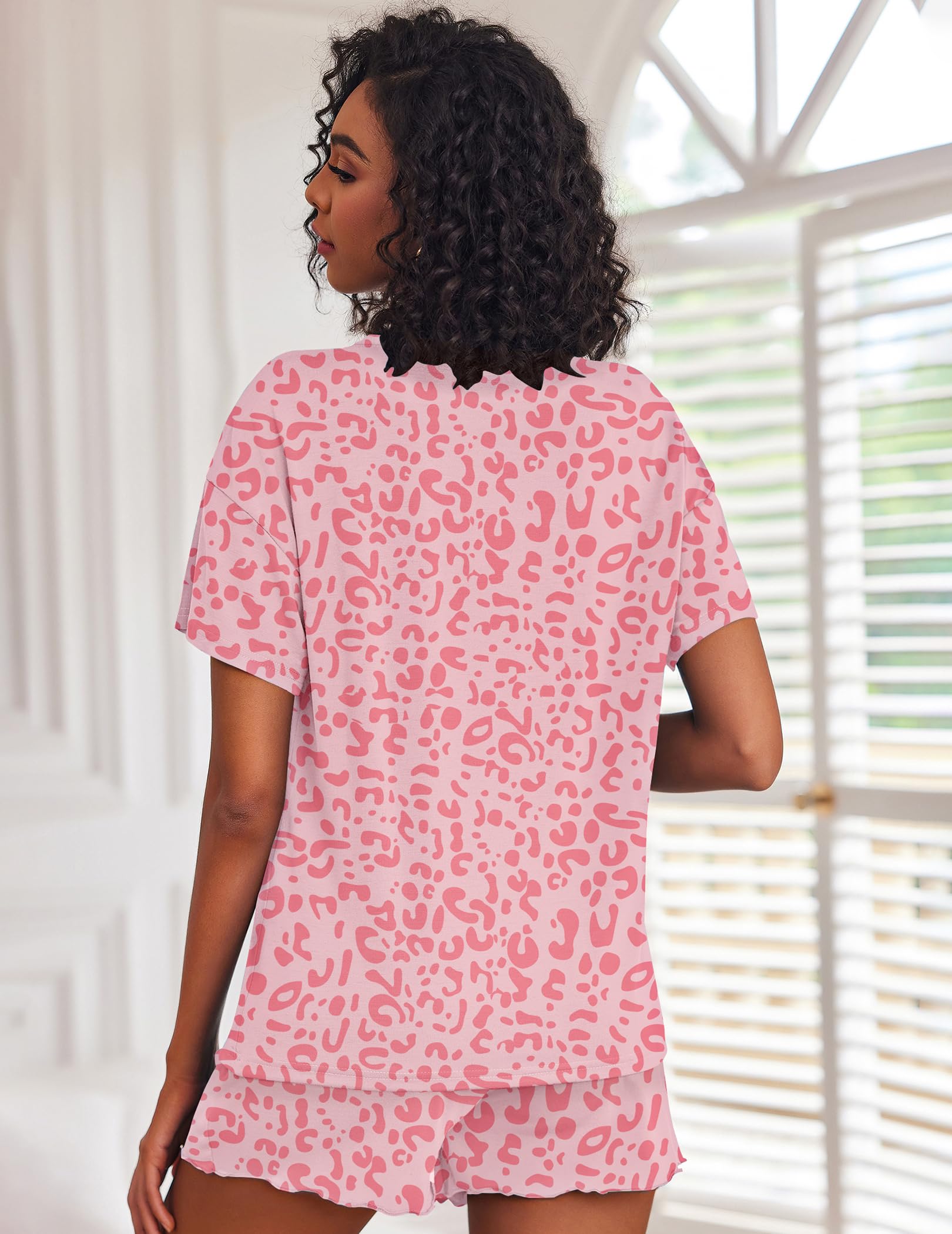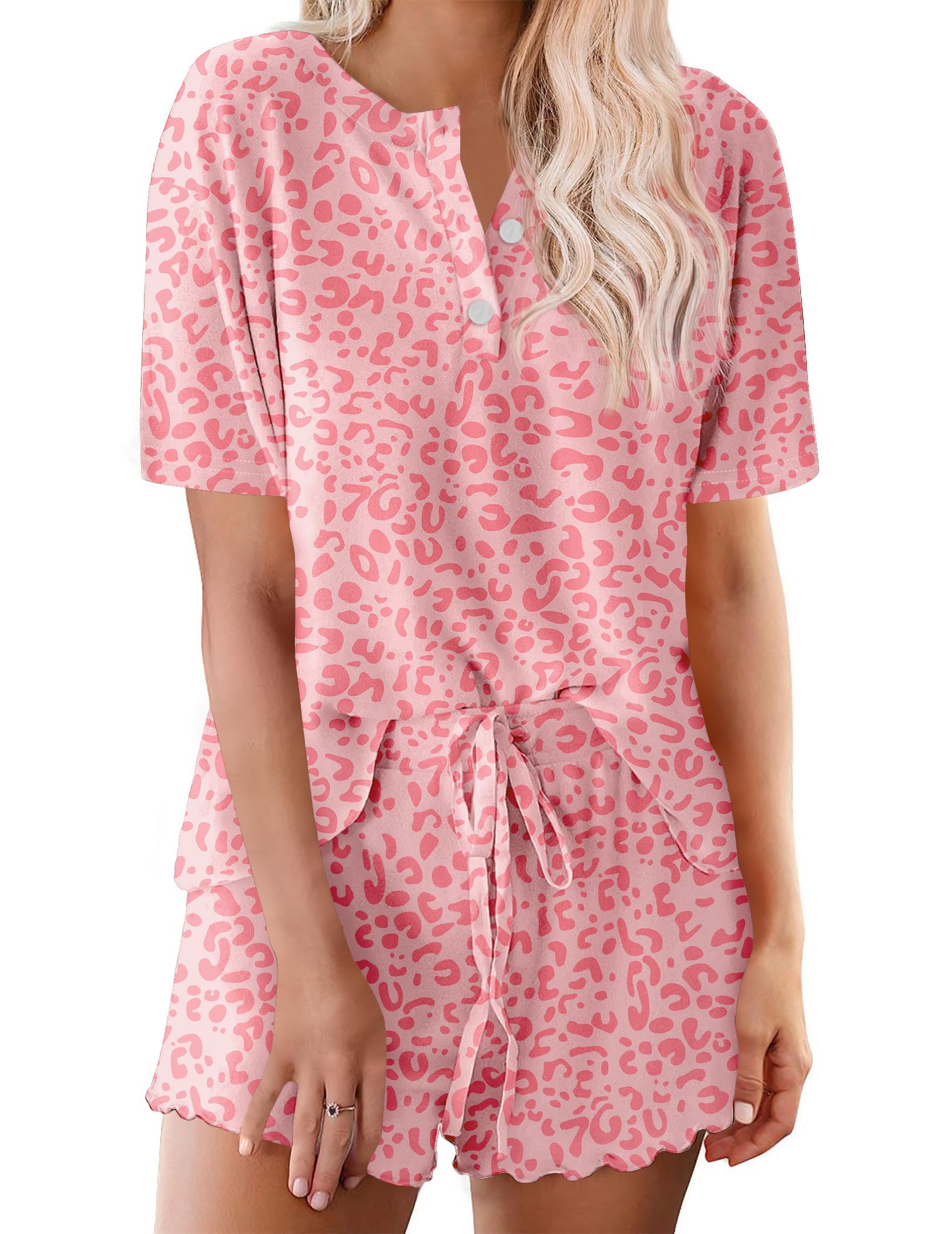 [Pajamas Features]: Henley neckline with button, short sleeve pajamas tops with ruffled pajamas shorts. Drawstring elastic waist, can be adjustabled depend on your need. This 2 piece pj sets nightwear sleepwear is perfect for women, juniors, ladies and teens