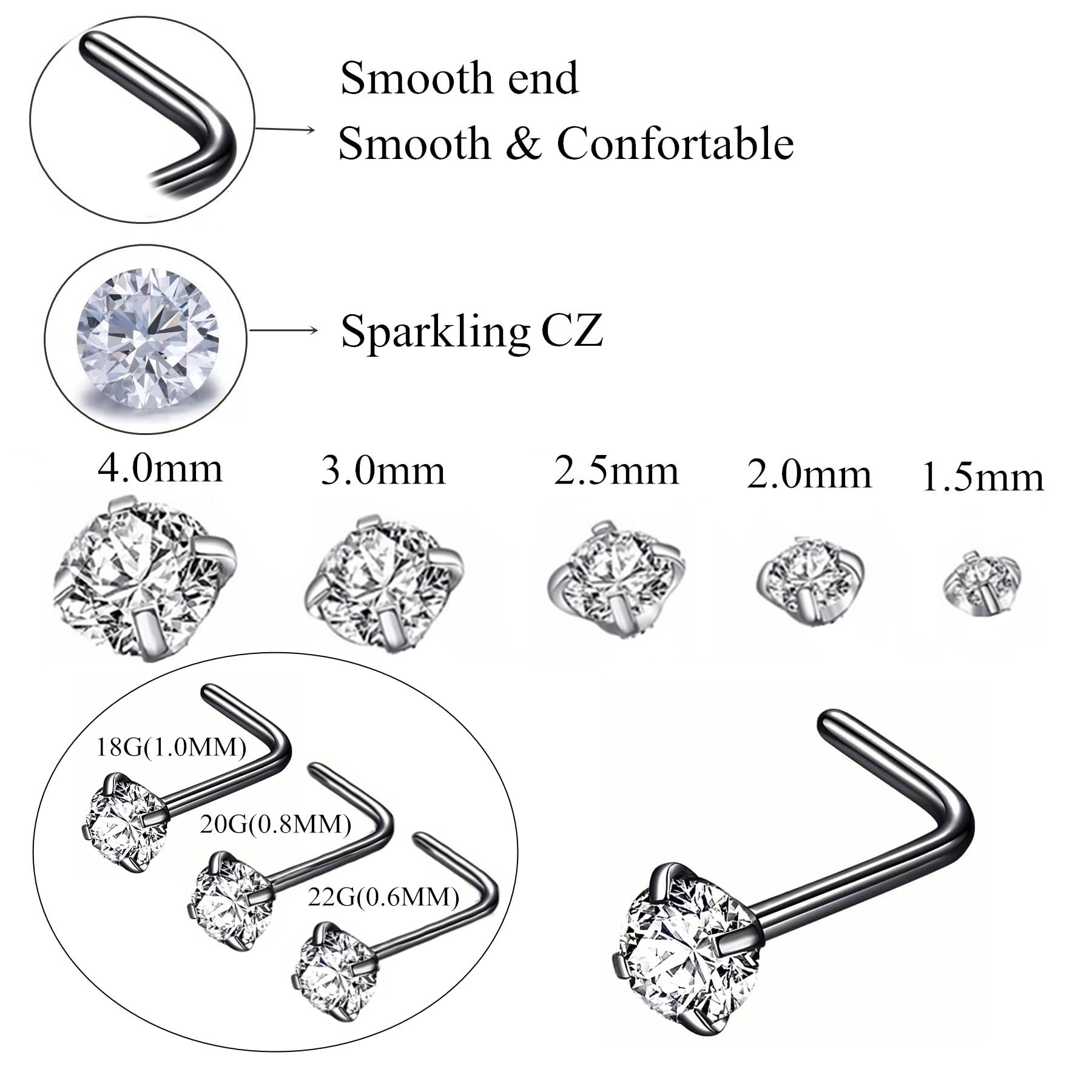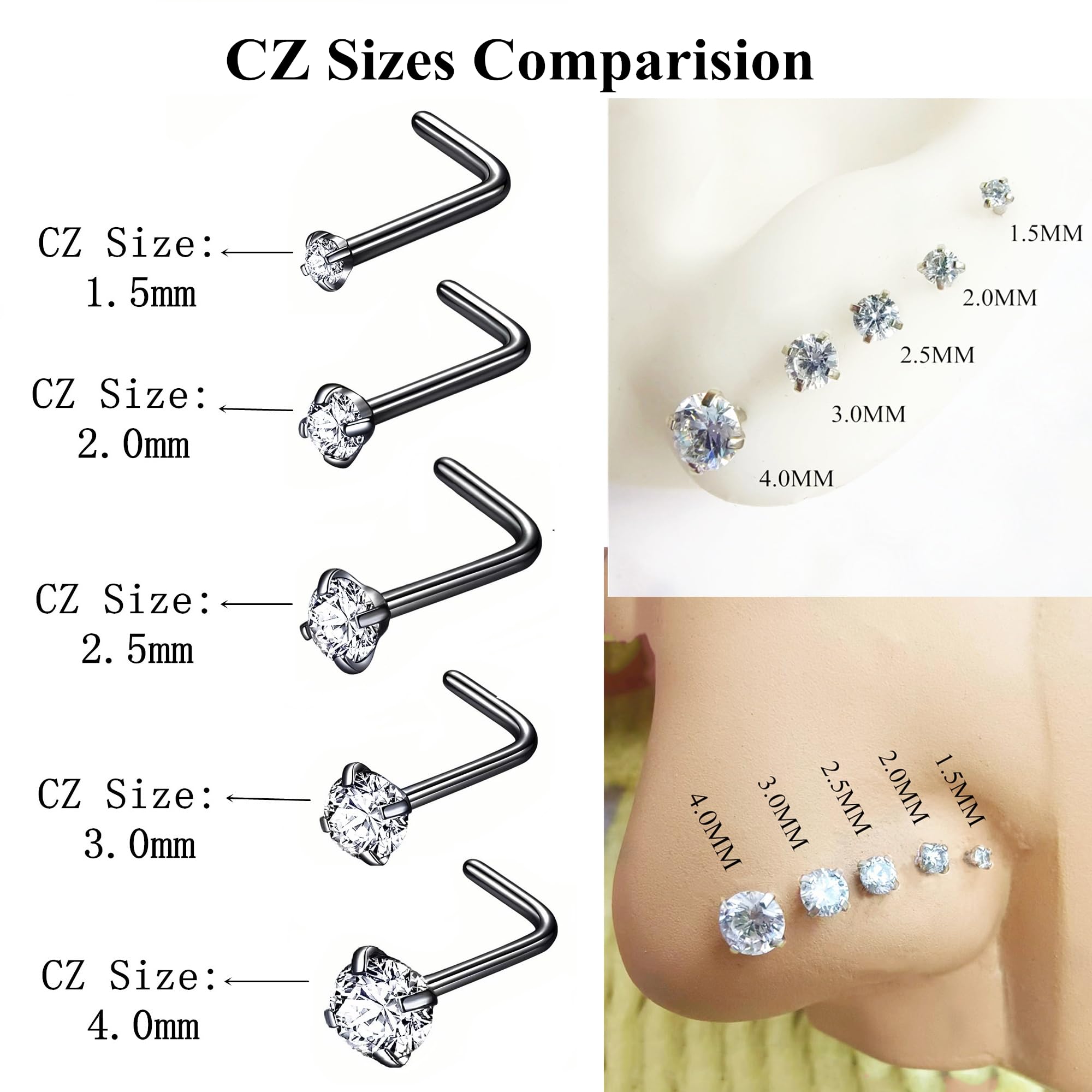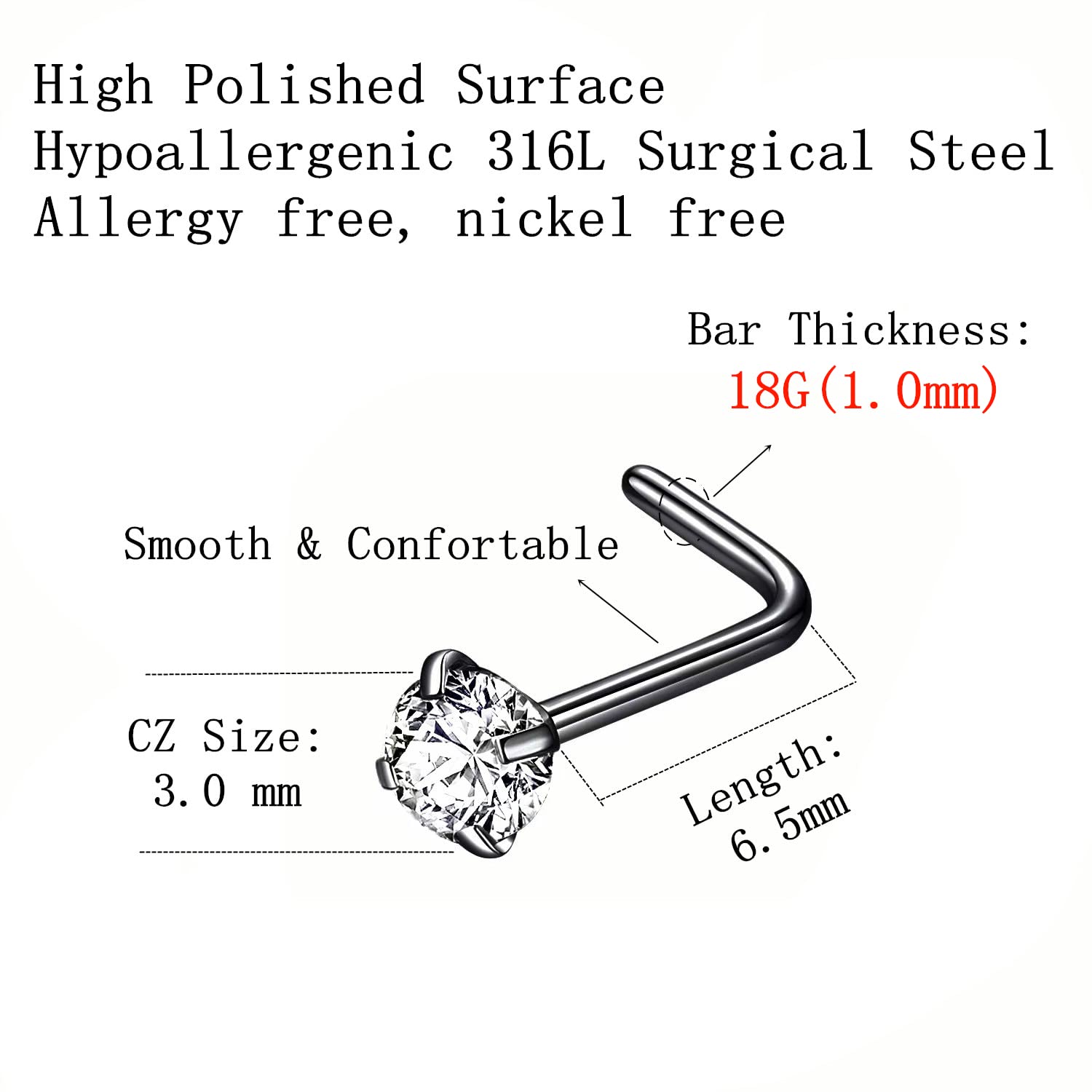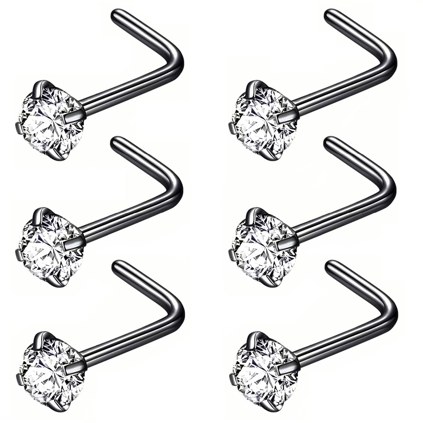 Quantity: 6pcs 3.0mm CZ nose stud. This L shaped nose studs for women size: Bar thickness: 18 gauge (1.0mm), Pin Length:6.5mm, Prong set cubic zirconia: 3.0mm, These stones a very bright and prong set by hand for accuracy.