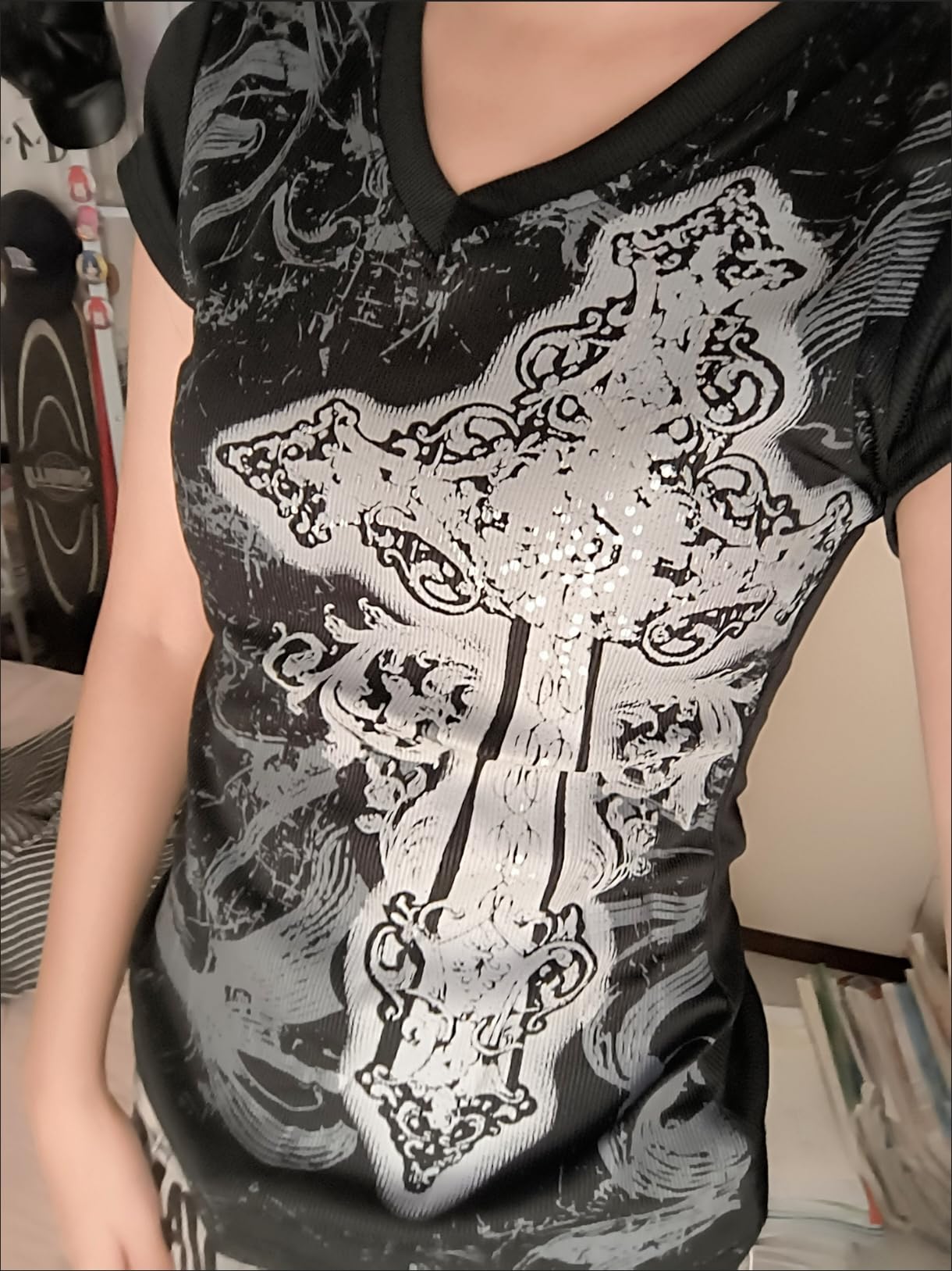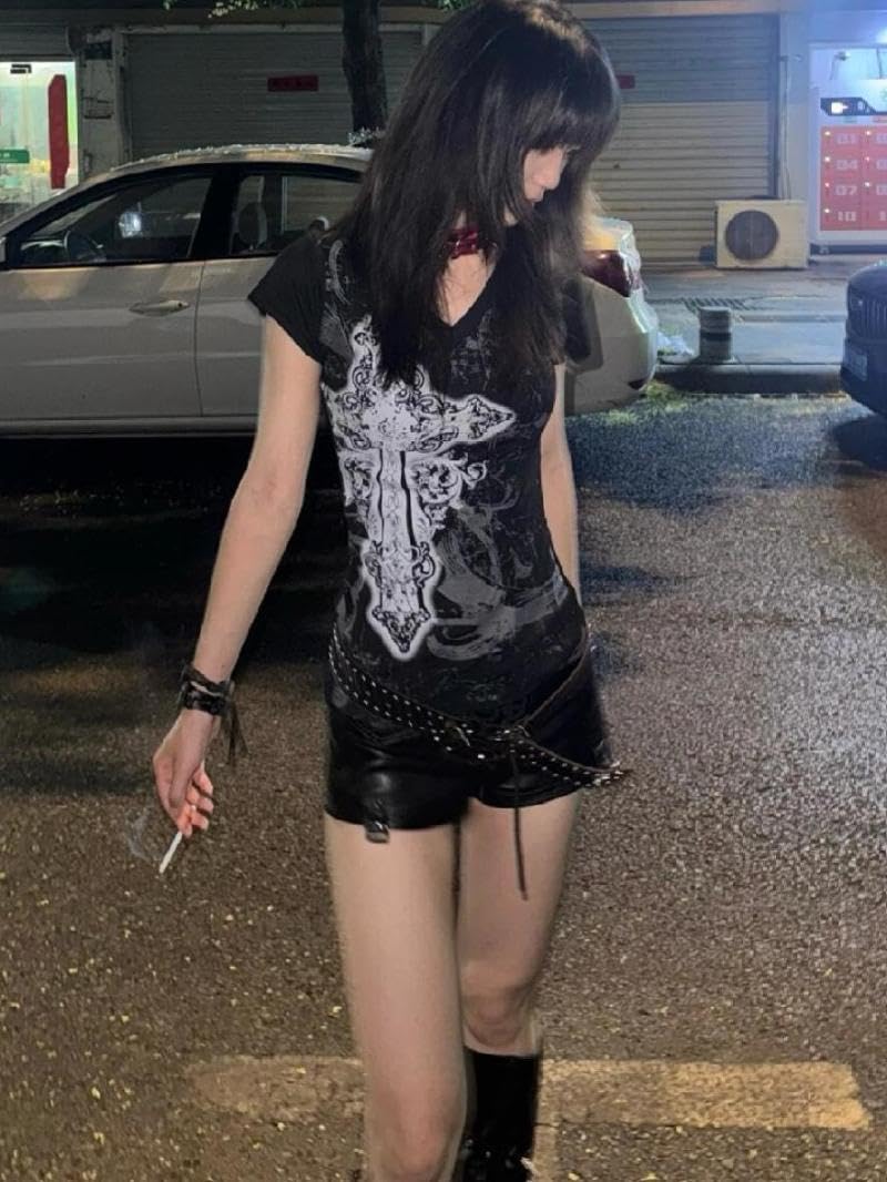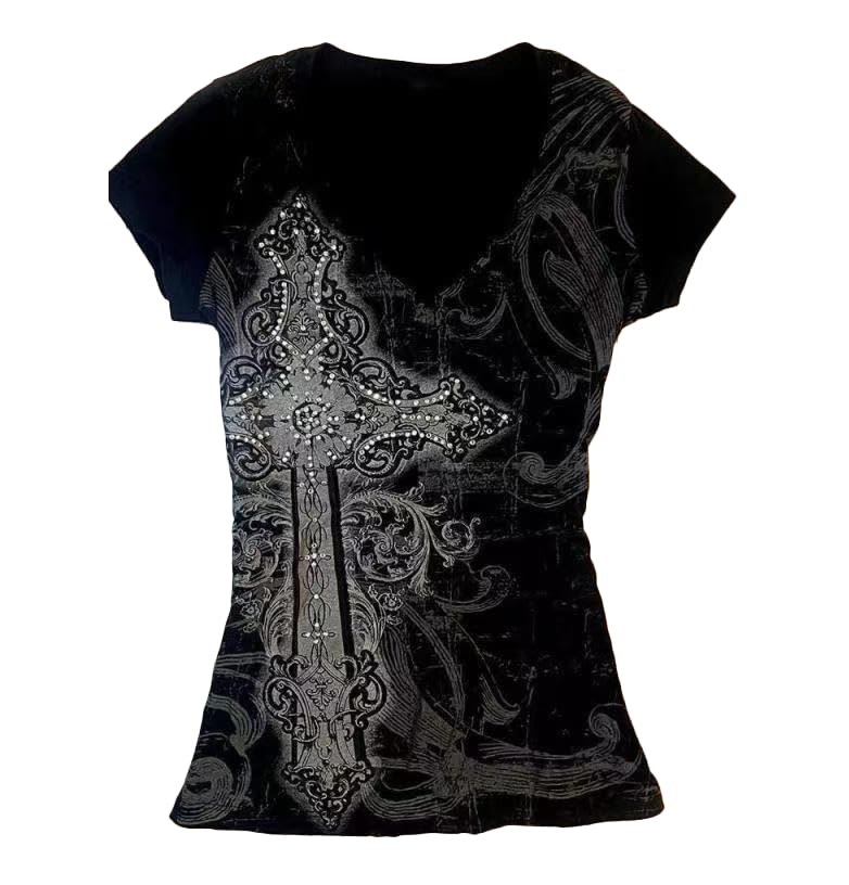 Embrace the Y2K aesthetic with our Women's Gothic V-Neck T-Shirt, featuring a slim fit design for a trendy look.