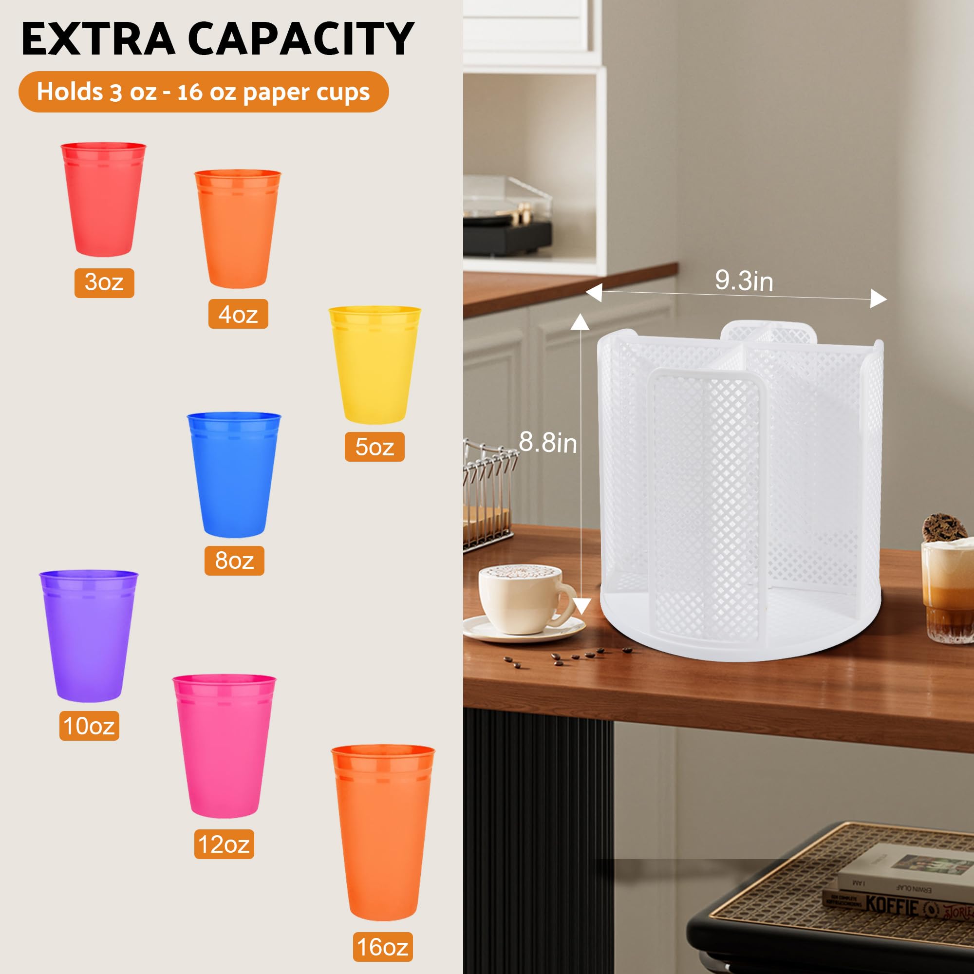 LARGE CAPACITY: Measuring 9.3x9.3x8.8inch, the multifunctional cup holder fits 3-16 oz disposable plastic & paper cups. The spacious coffee cup dispenser can accommodate 90% of cup sizes