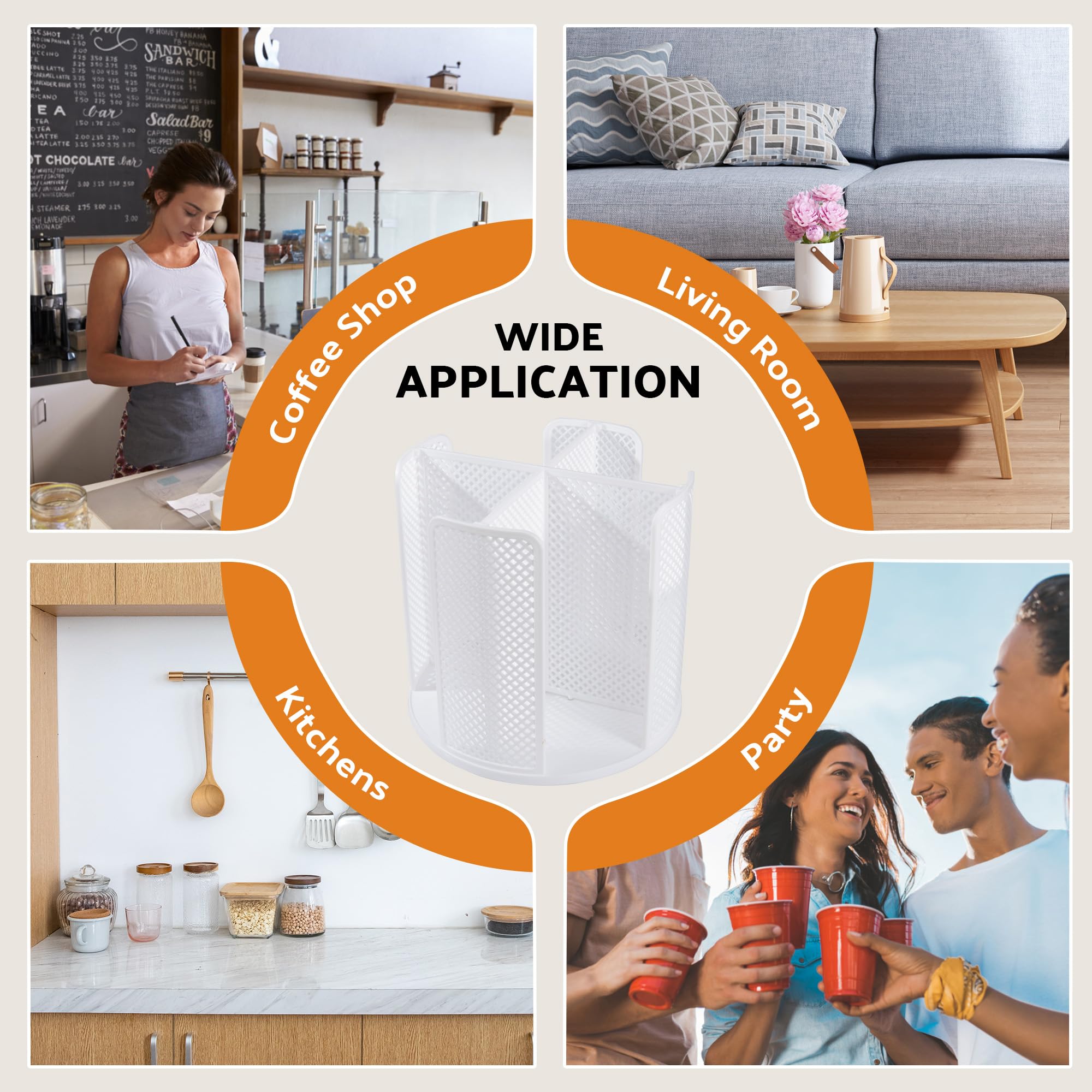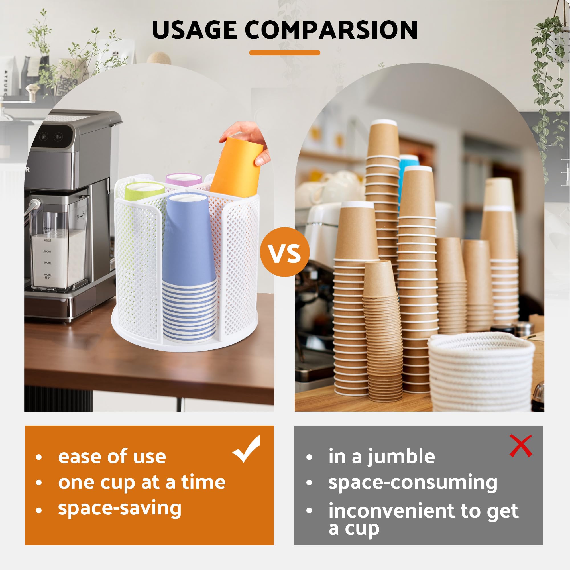 360° ROTATING TRAY: Countertop cup holder with rotatable design allows you to get the most suitable cups and lids effortlessly, and the wider caliber plastic cup dispenser saves even more time and effort