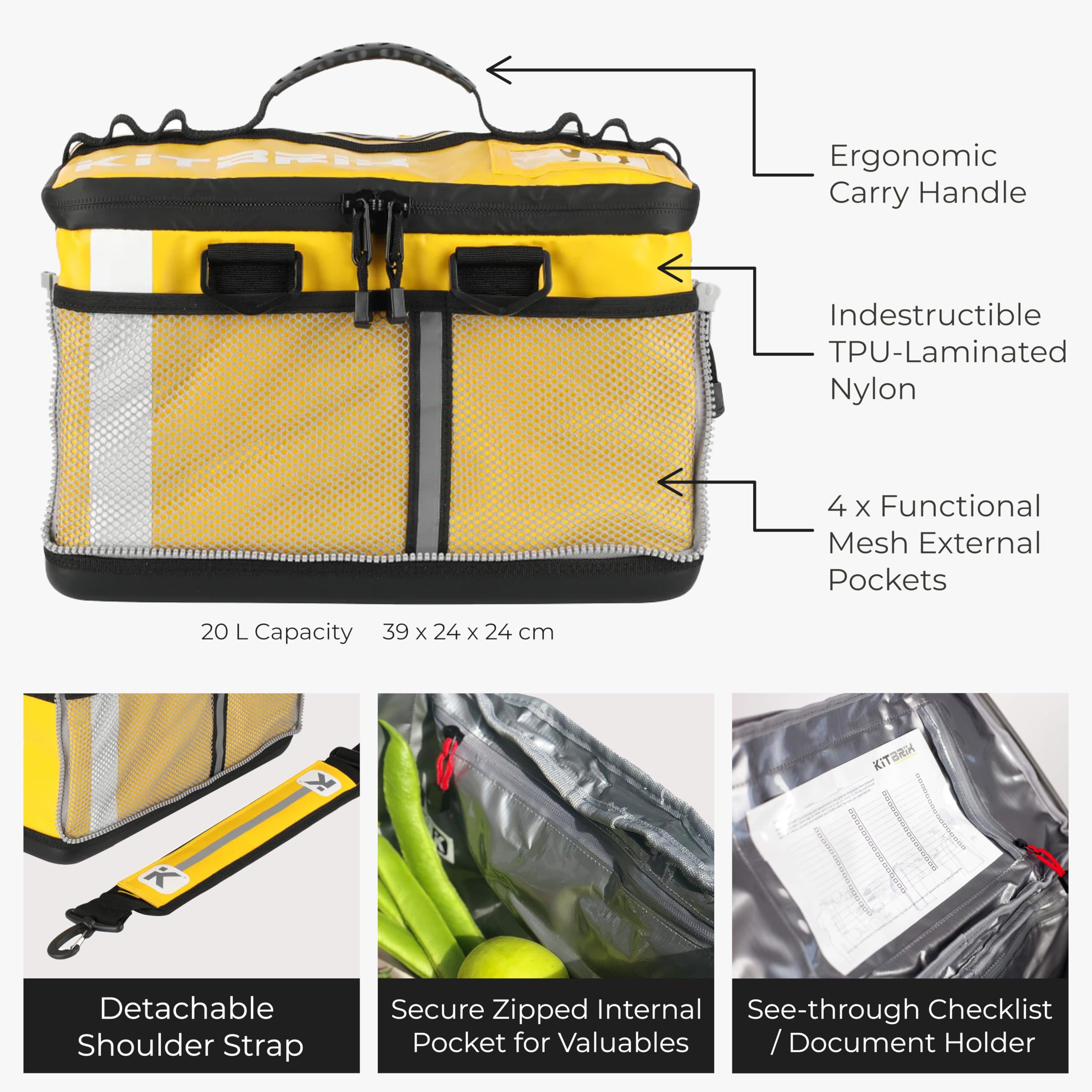MULTI-USE GEAR BAG FOR SPORTS, TRAVEL & OUTDOOR ADVENTURE - The KitBrix waterproof sports bag protects your gear in all weather conditions. Carry with the ergonomic handle or as a shoulder bag with the detachable strap. Our yellow bag is perfect as a waterproof beach bag, sailing bag, or ambulance kit bag. Also ideal as a small gym bag for men and women.