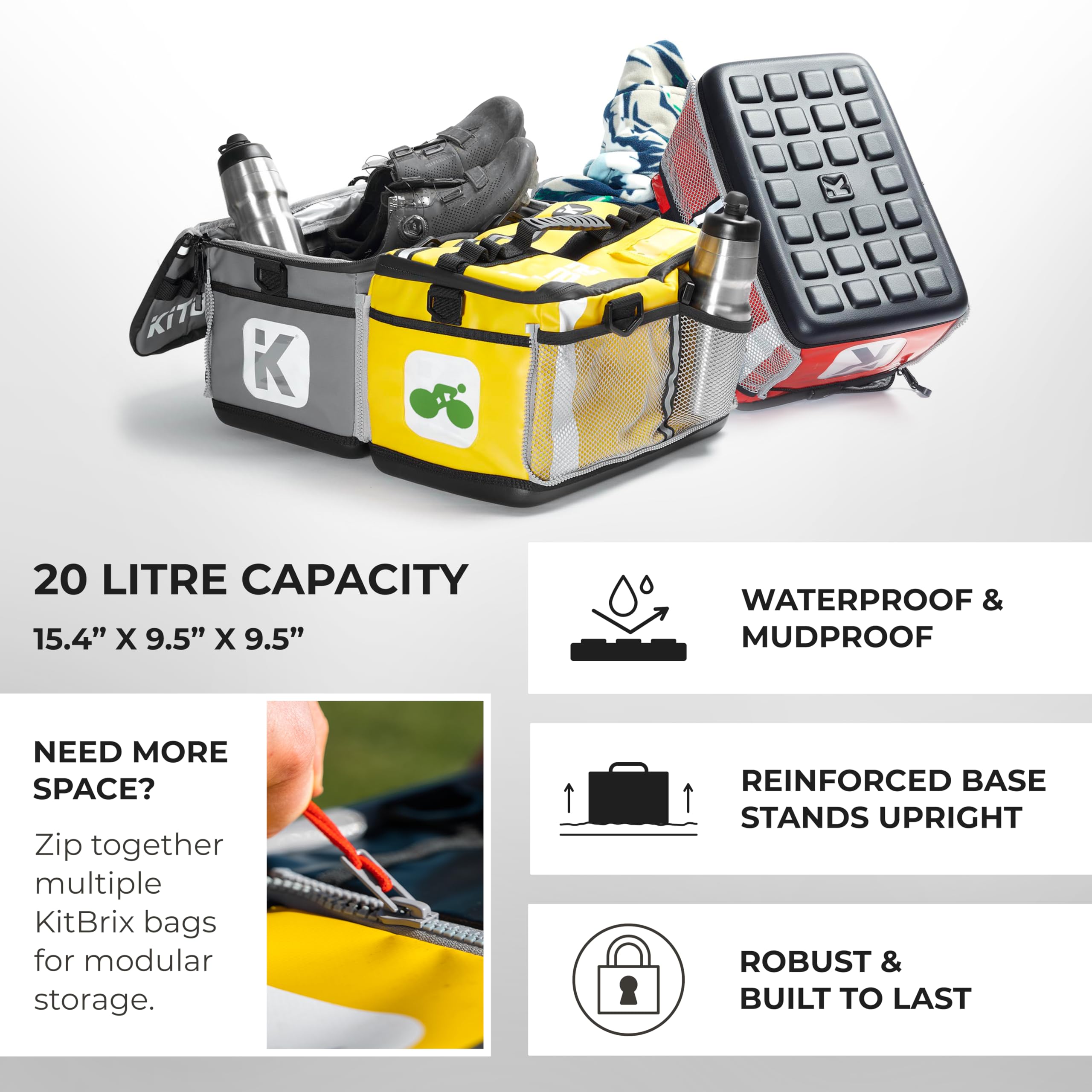 MODULAR ZIP-TOGETHER DESIGN FOR ULTIMATE ORGANIZATION – Connect multiple KitBrix bags for a modular system to organize gear by sport or separate wet and dry clothes. Join two bags to form a backpack, or connect three for the ideal triathlon transition bag. FREE ACCESS to our downloadable checklists for a range of sports events to help keep you organized and race-day-ready.