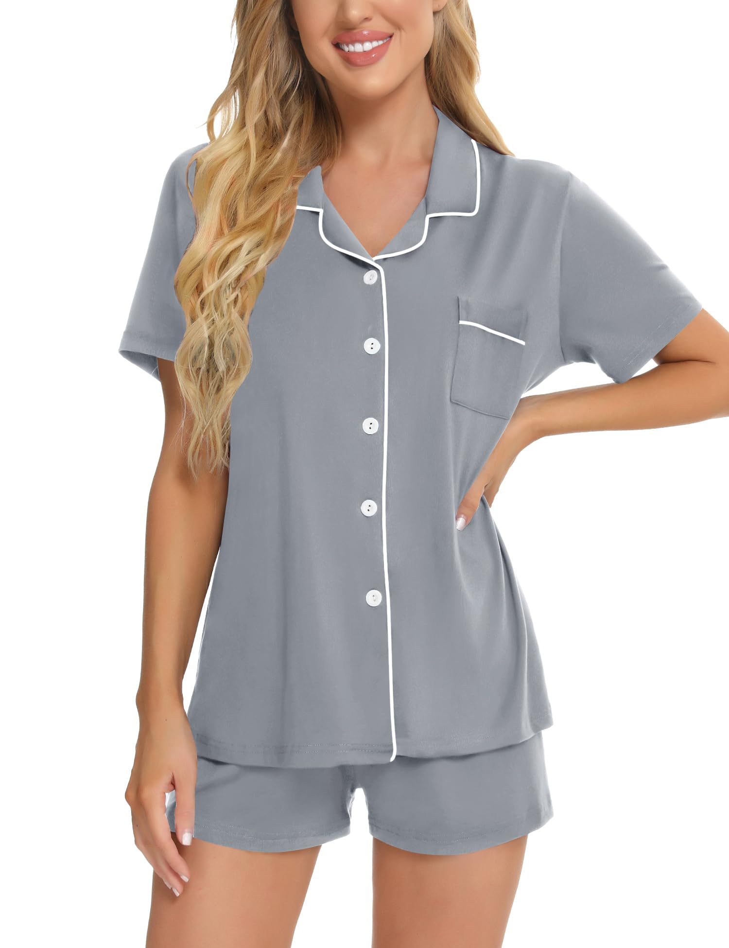 ❤【PERFECT FIT】Two-Piece Short sleeve pajama set with button front top and shorts for relaxed fit. Short sleeve pajama set features chest pocket, notch collar and contrast piping trim. It's slick and durable, bringing optimum comfort to your leisure time.