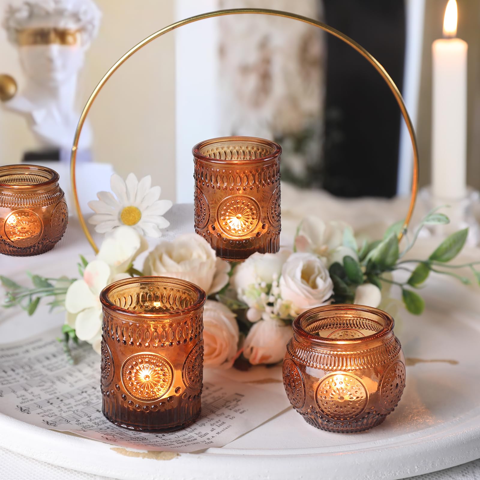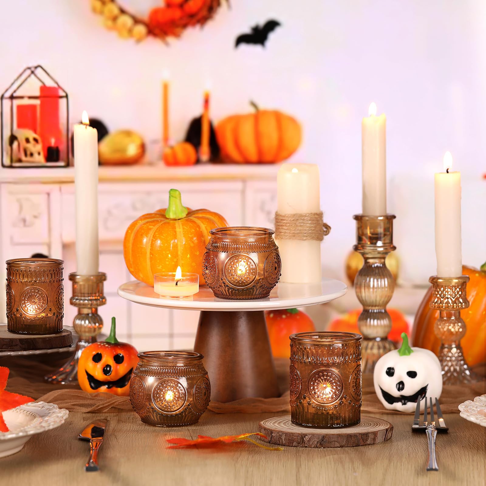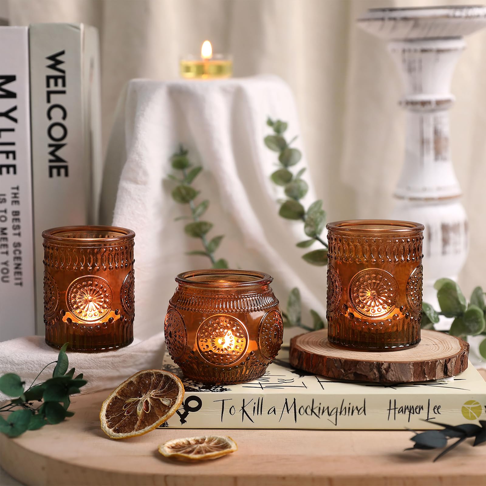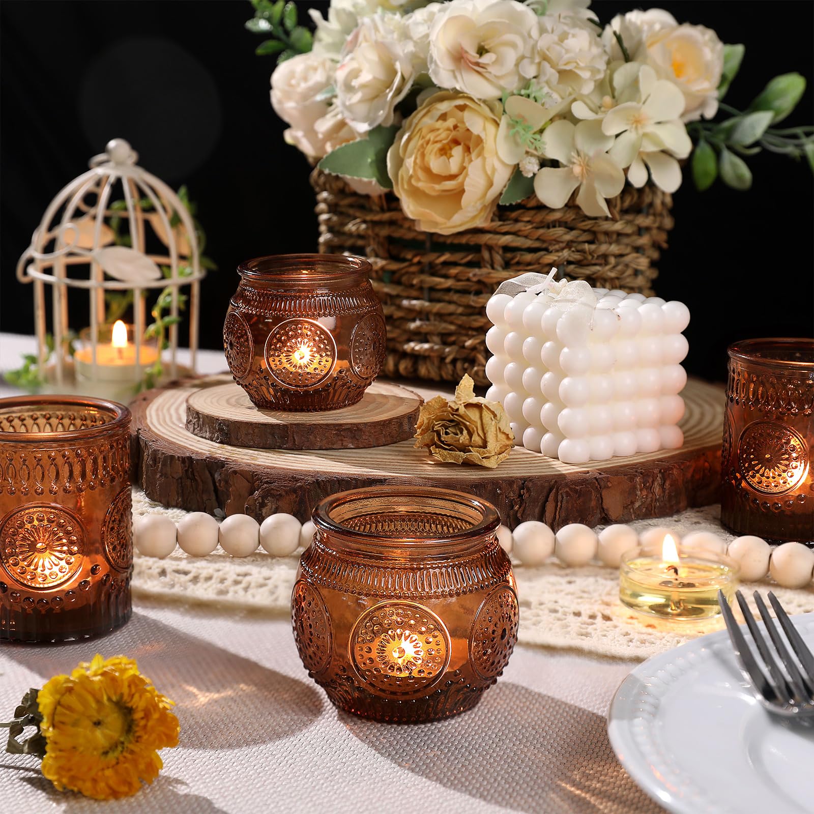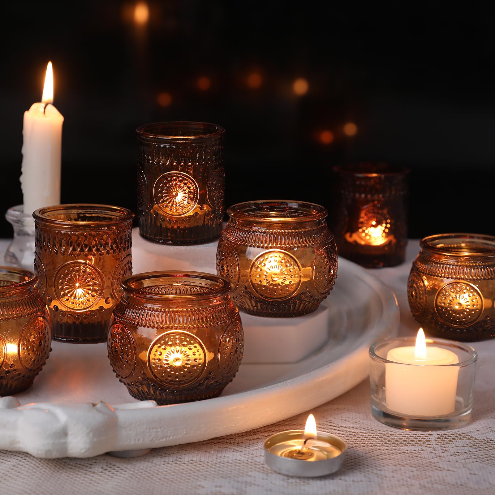 ❤️❤️[ Votive Candle Holders Set ]❤️❤️: You will get 24 pack amber votive candle holders in your package, including 12 glass votives and 12 bowl glass votives.The dimensions are 2.1ʺD x 2.56ʺH and 2.1ʺD x 2.1ʺH approximately. These glass votive candle holders are the perfect complement to any dining table, which can be used with regular votive candles, tea light candles, flameless LED tea waxes, and edible butter candles, creating a warm and inviting ambiance that enhances the dining experience.