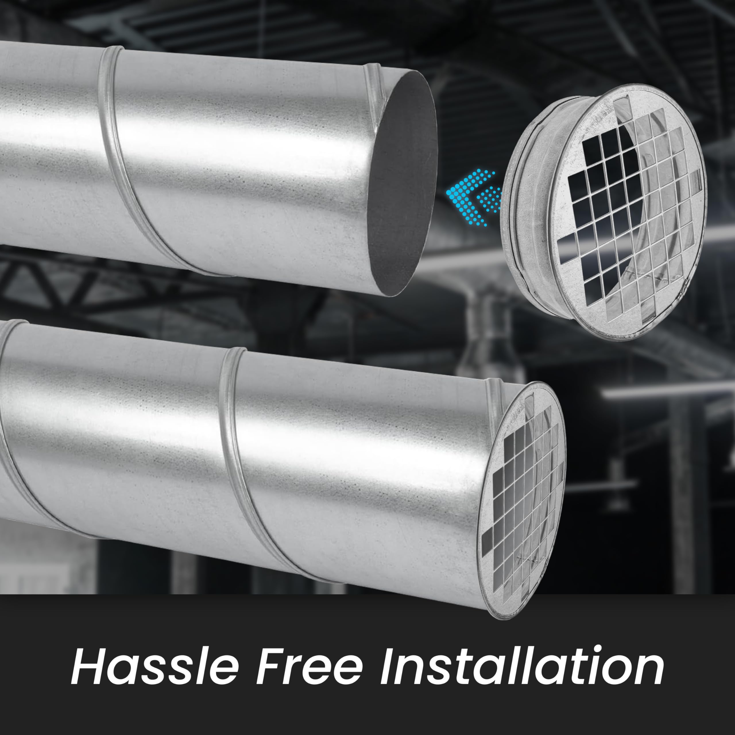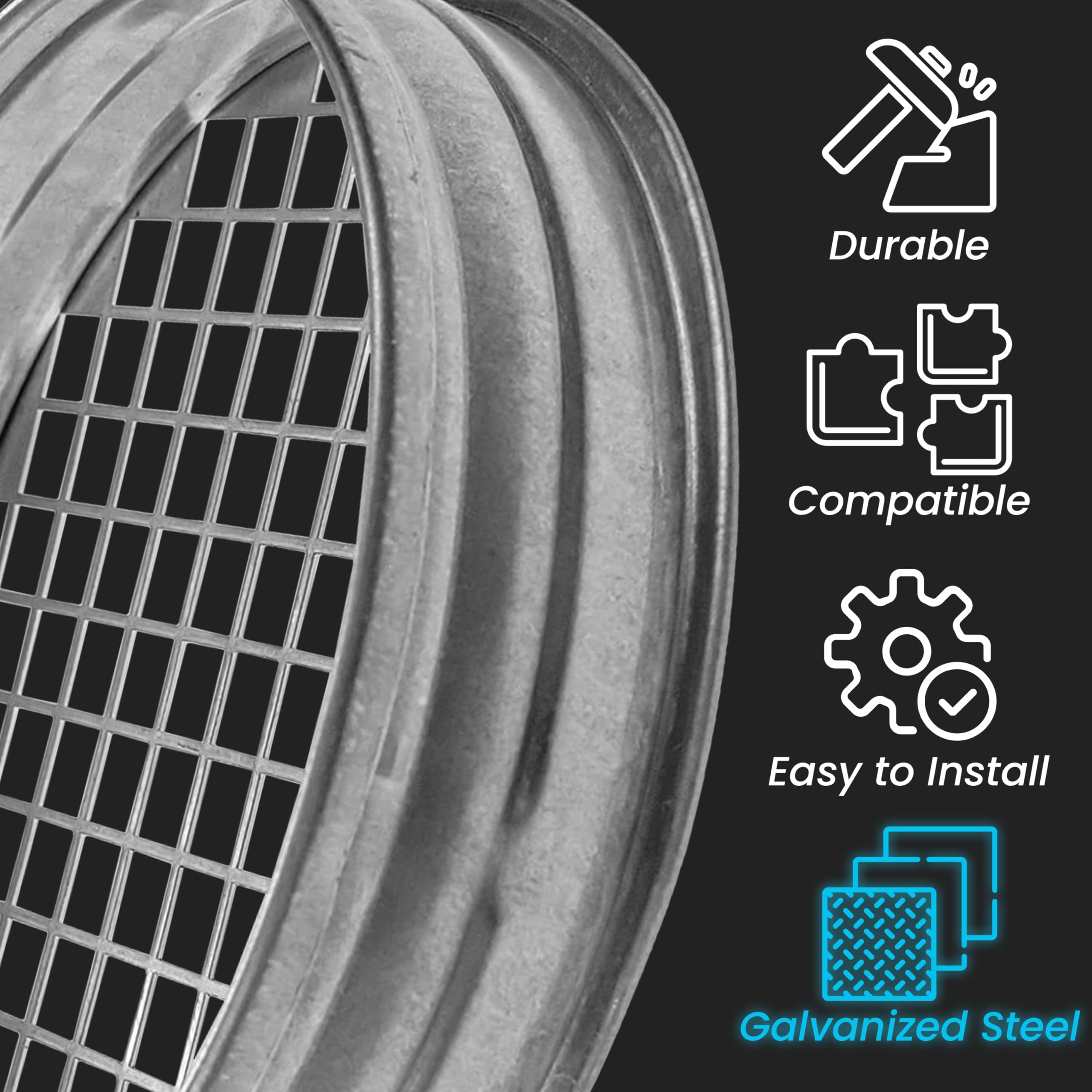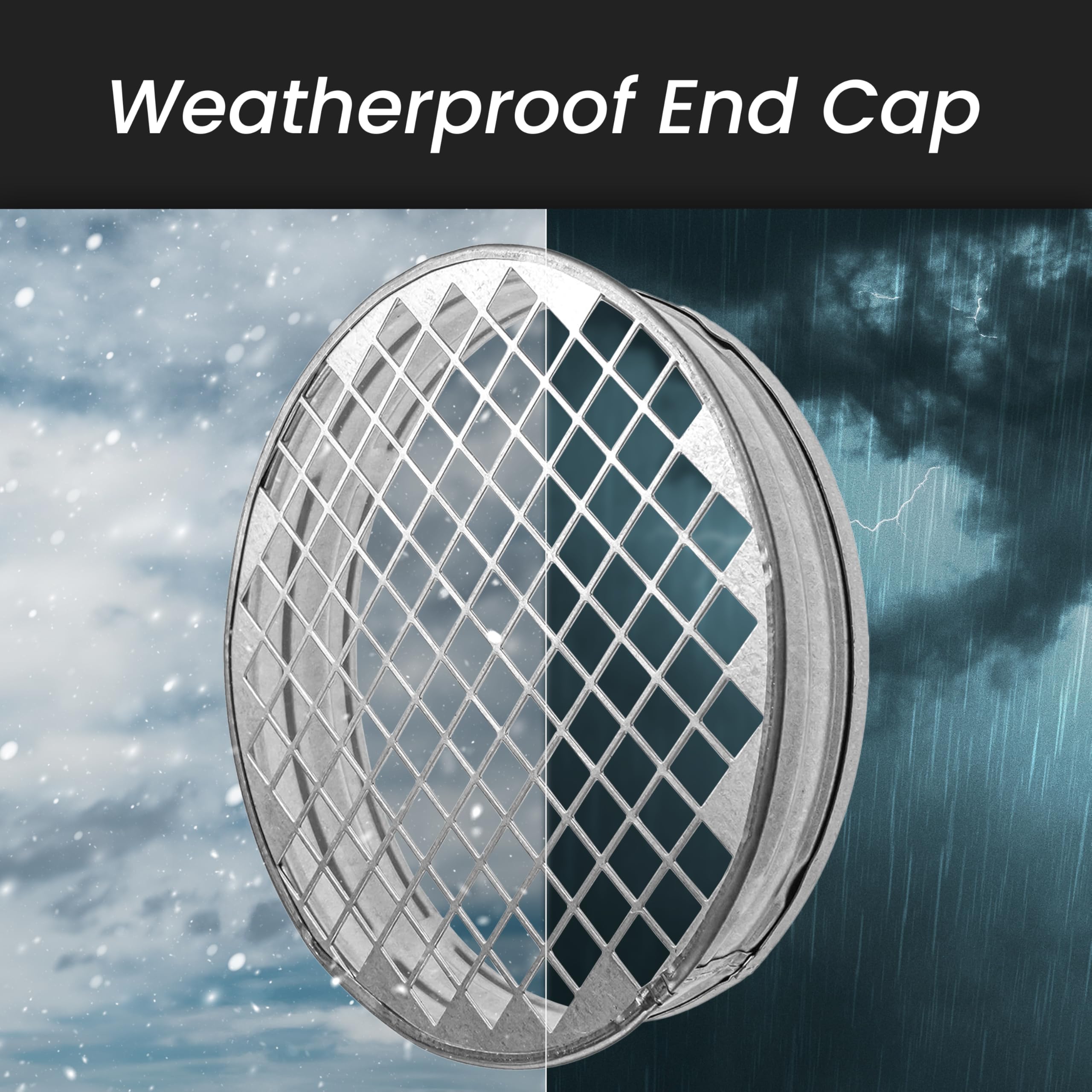 PRECISE SIZE & FIT – Ø4.92 inch galvanized steel duct end cap with 1.3 inch insertion depth and integrated 0.39 inch steel mesh grid. Designed for male-fit installation on standard HVAC ducts, dryer vents and ventilation pipes.
