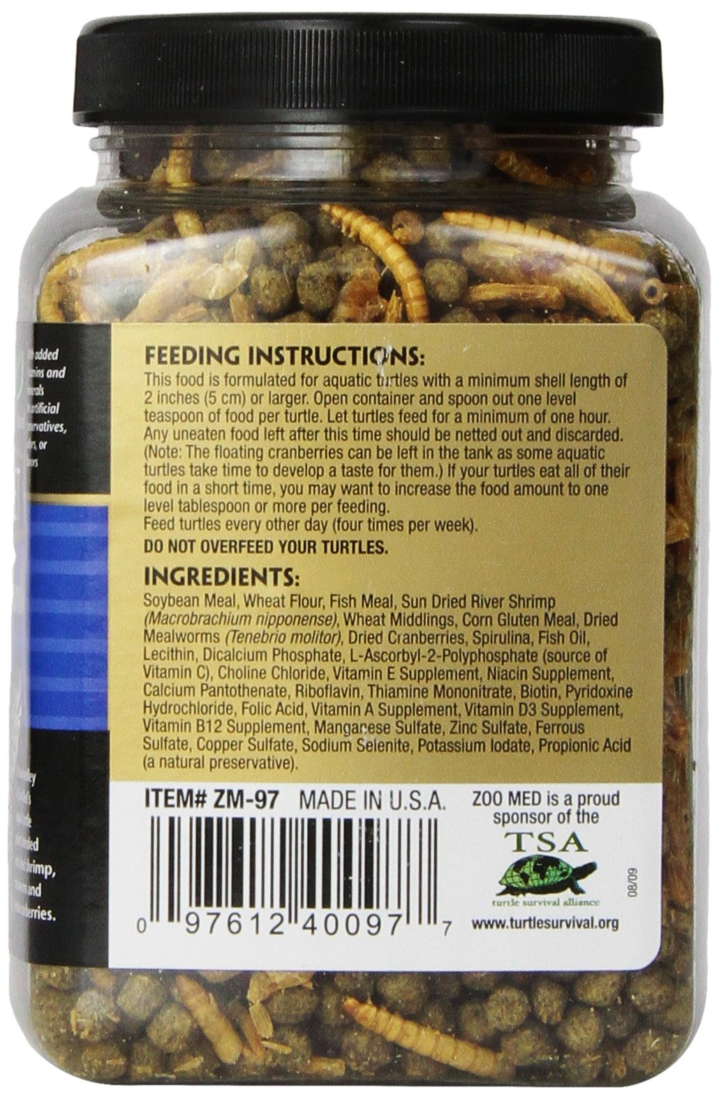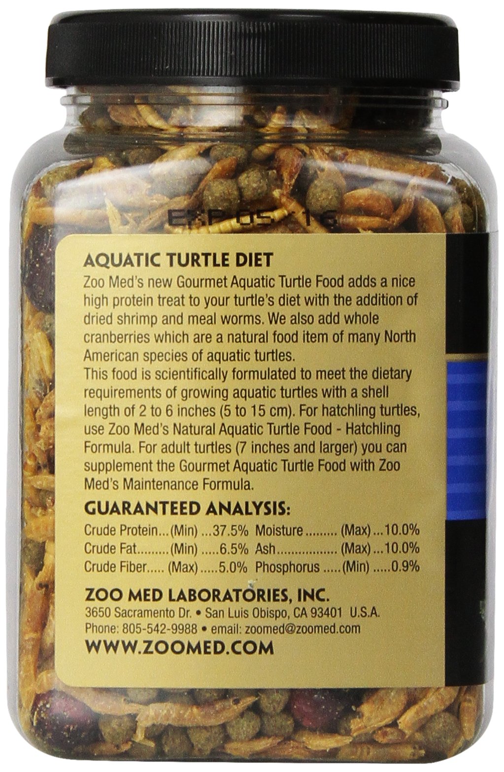 Zoo Meds new Gourmet Aquatic Turtle Food adds a nice high protein treat to your turtles diet with the addition of dried shrimp and mealworms. We also add whole cranberries which are a natural food item of many North American species of aquatic turtles. Scientifically formulated to meet the dietary needs of growing turtles with a shell length of 2 to 6 inches. With added vitamins and minerals. No artificial preservatives, colors, or flavors. For hatchling turtles, use Zoo Meds Natural Aquatic Turtle Food - Hatchling Formula. For adult turtles (7 inches and larger) you can supplement the Gourmet Aquatic Turtle Food with Zoo Meds Maintenance Formula.