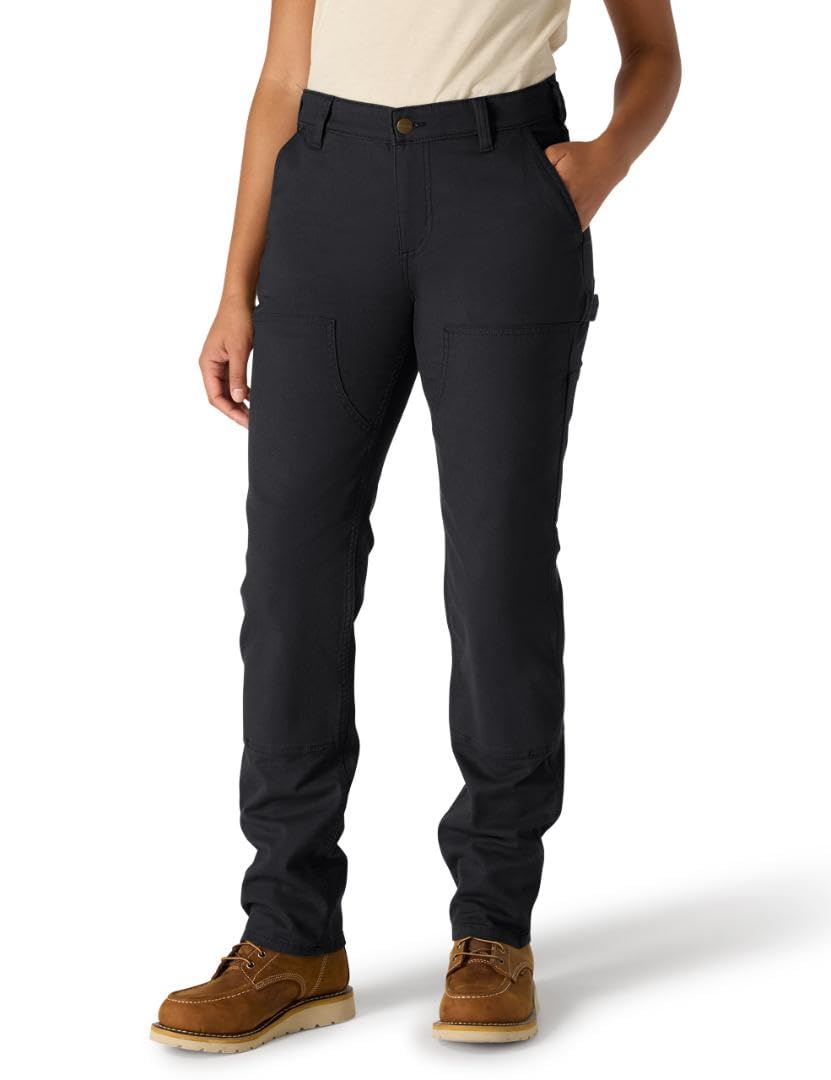 Description Built-in stretch gives these women's Carhartt canvas pants a comfortable, easy-moving feel. Midweight canvas and a stretch waistband offer everyday comfort. Their relaxed fit means a little extra room in the seat and thigh for easy movement.