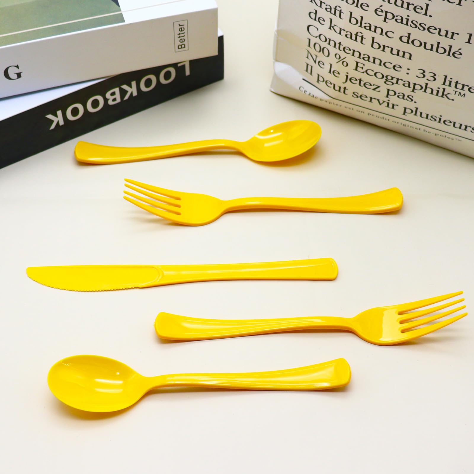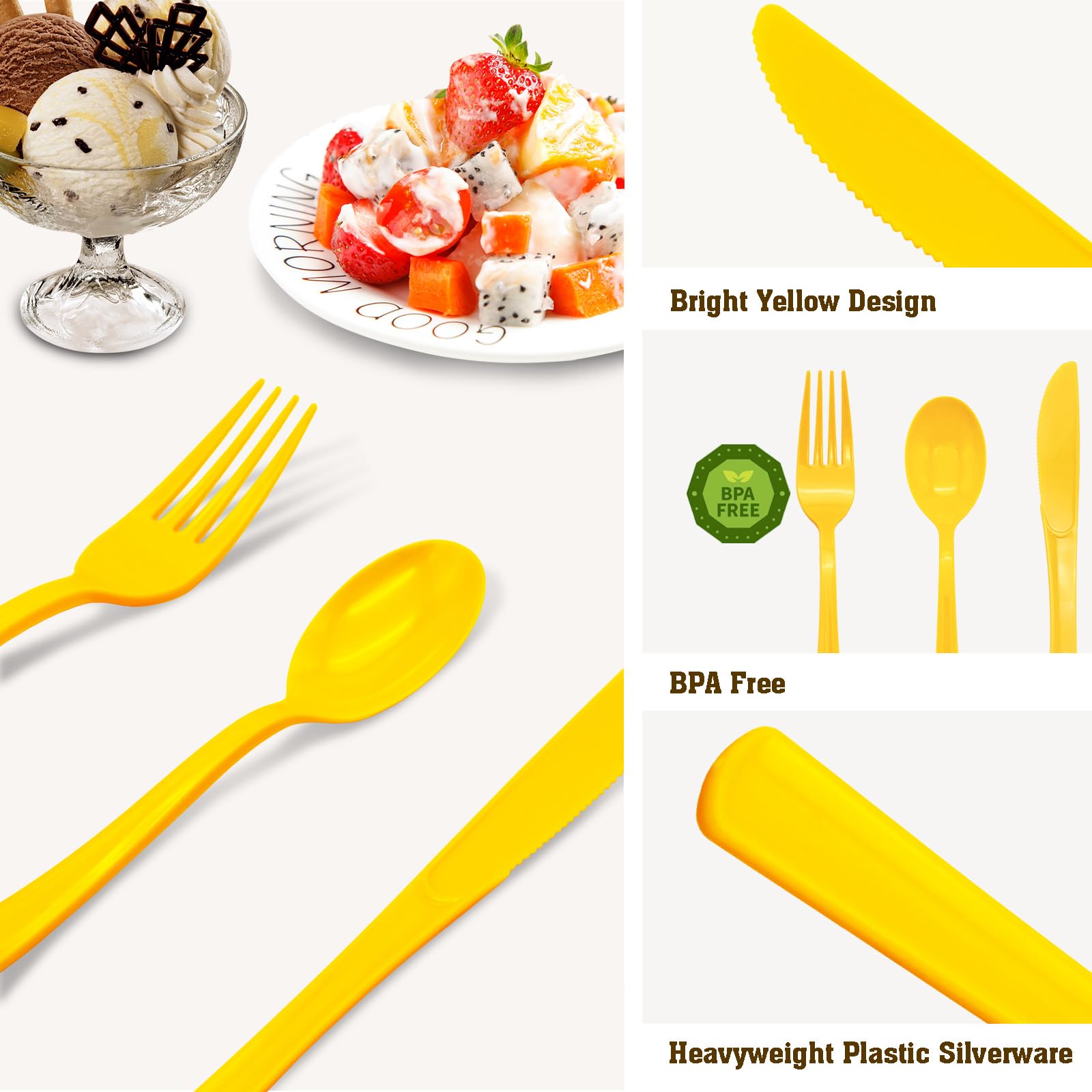 【High Quality Plastic Materials】: The plastic silverware is made of food-grade plastic material, which is non-toxic and harmless and can be in direct contact with food. High-temperature resistant and suitable for all types of food, whether cutting meat or scooping soup, the yellow plastic silverware meets customers' needs.