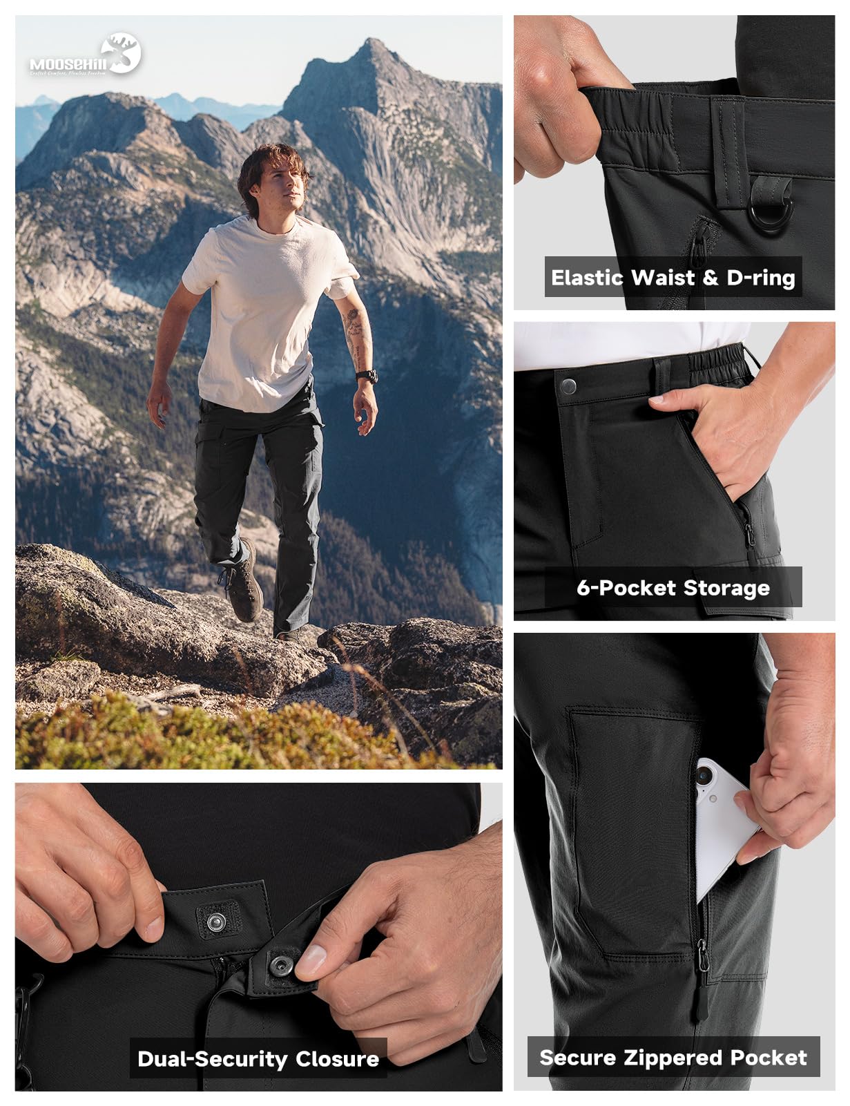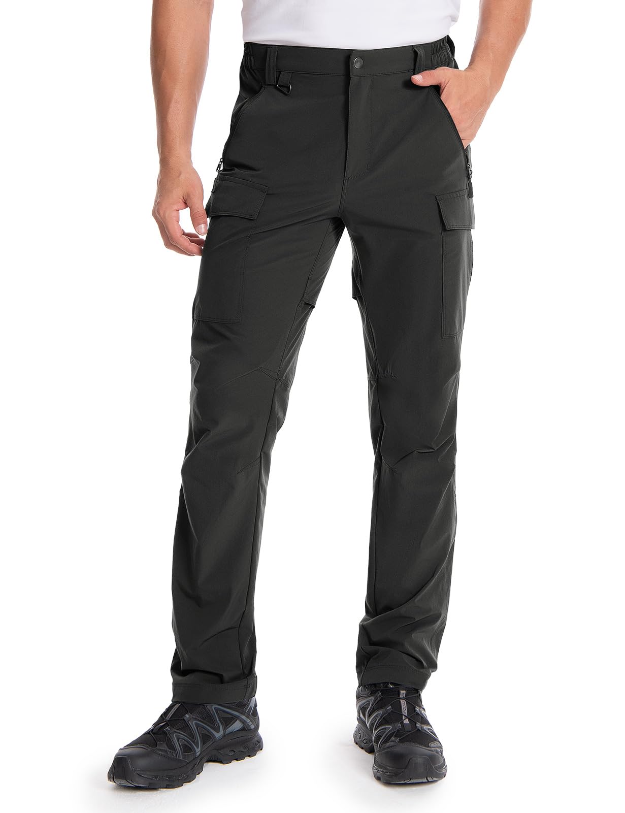 Elastic Waist & Convenient D-Ring Buckle Design: With your comfort and flexibility in mind, our tactical pants for men stretch features an elastic waistband, belt loops, and zippered closure. No more worries about discomfort or restrictions during long hikes or challenging terrains. Beneath the right belt loop, you'll find a D-ring buckle, perfect for attaching and accessing essential tools like a compass or other hiking equipment, and needn't to fumble through your backpack or pockets.