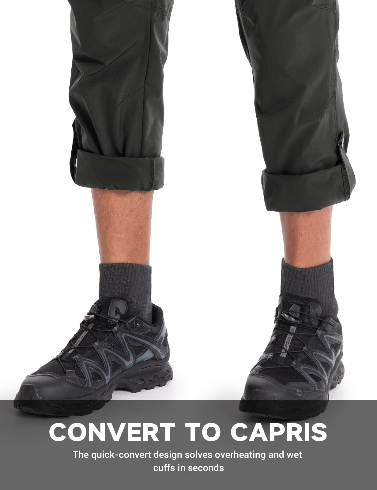 Perfect Air Vents Systems & Easily Transform to Capris Pants: Designed for outdoor enthusiasts like you, these hiking pants for men feature strategically placed breathable vents on the inner thighs, ensuring ventilation and preventing heat buildup in any environment. With the innovative button design at the hem, effortlessly transform them into 7/8 length pants, allowing for easy adaptability to tackle unexpected weather changes or muddy trails with ease.