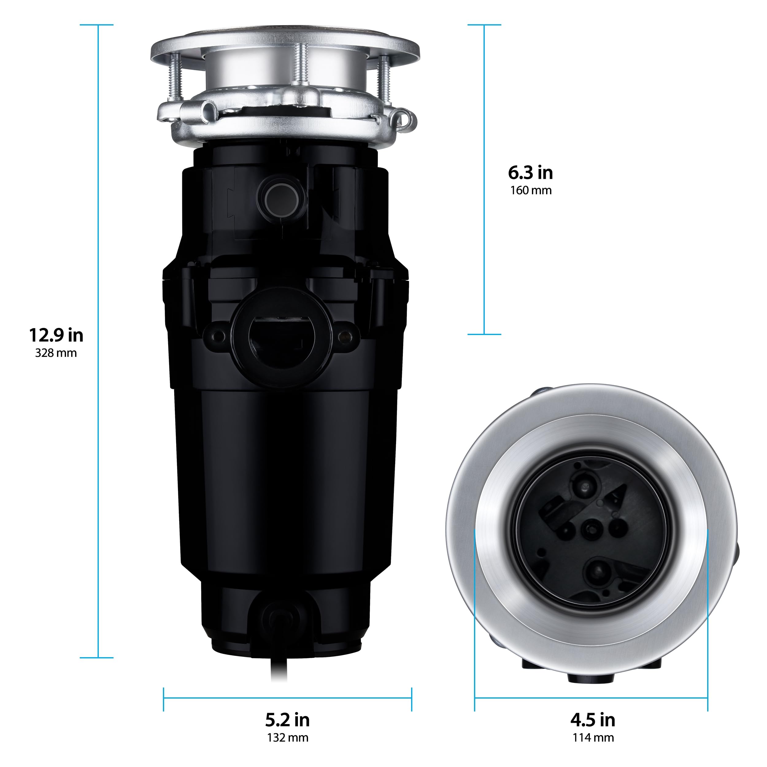 1/2 HP COMPACT GARBAGE DISPOSAL: The Waste Maid Economy Series garbage disposer features a 1/2 horsepower 2600 RPM permanent magnet motor; Horsepower claimed on package does not indicate motor output or motor power applied for processing