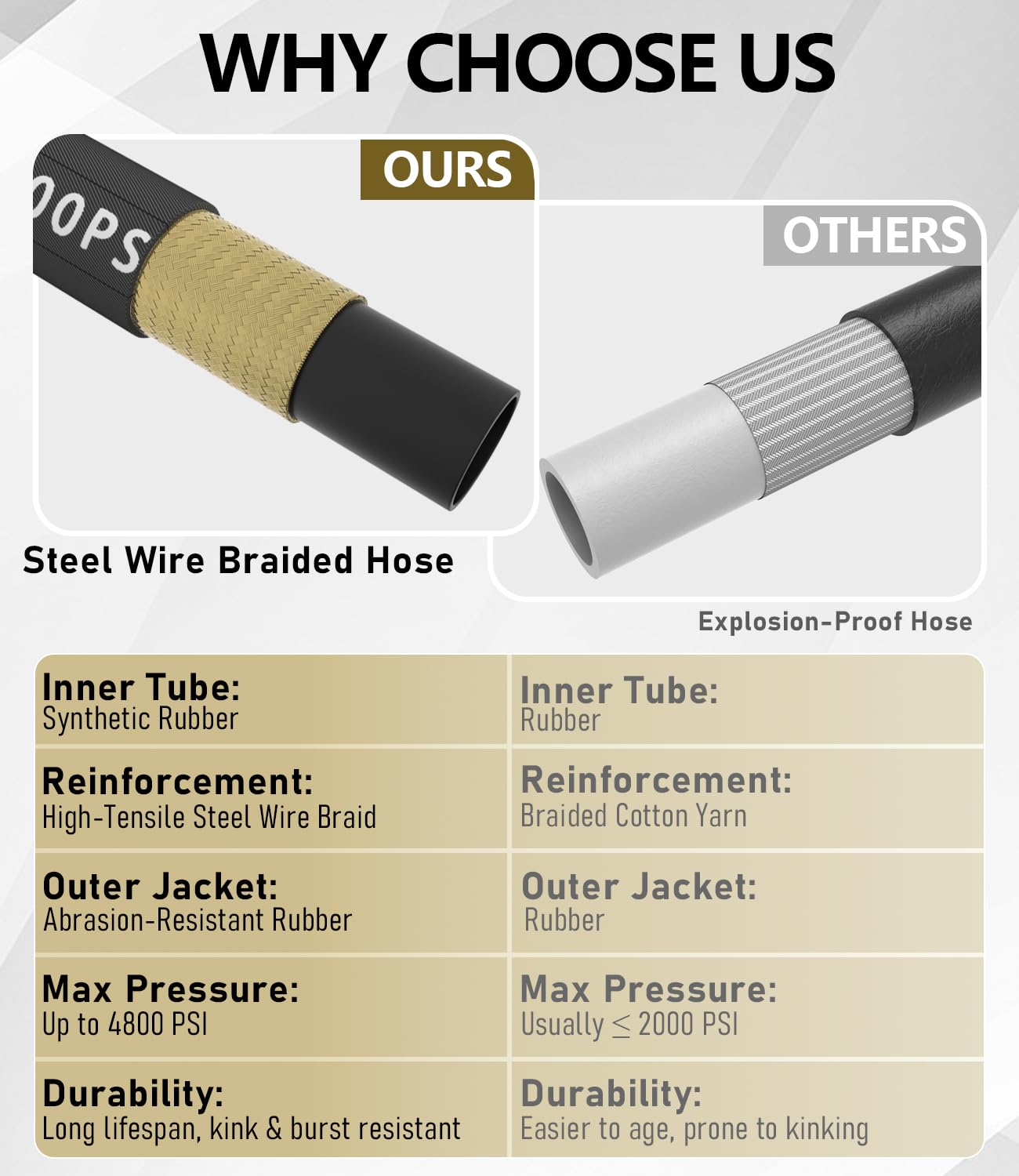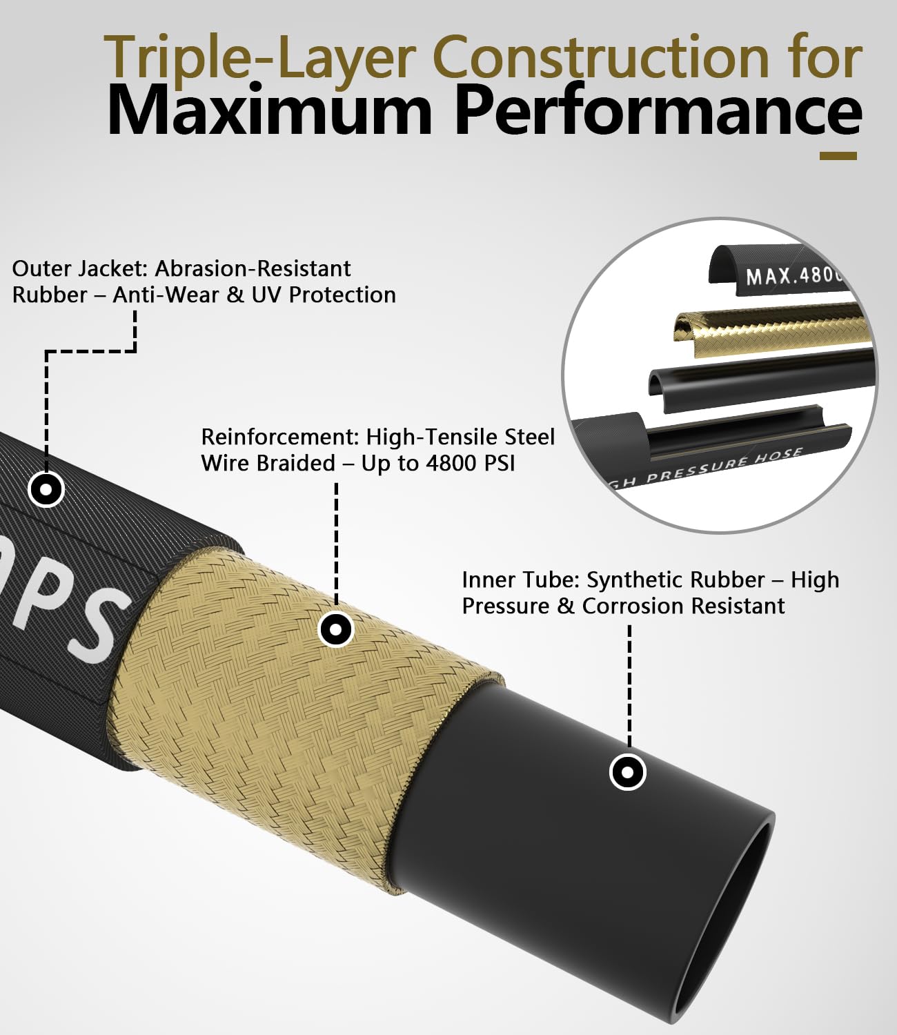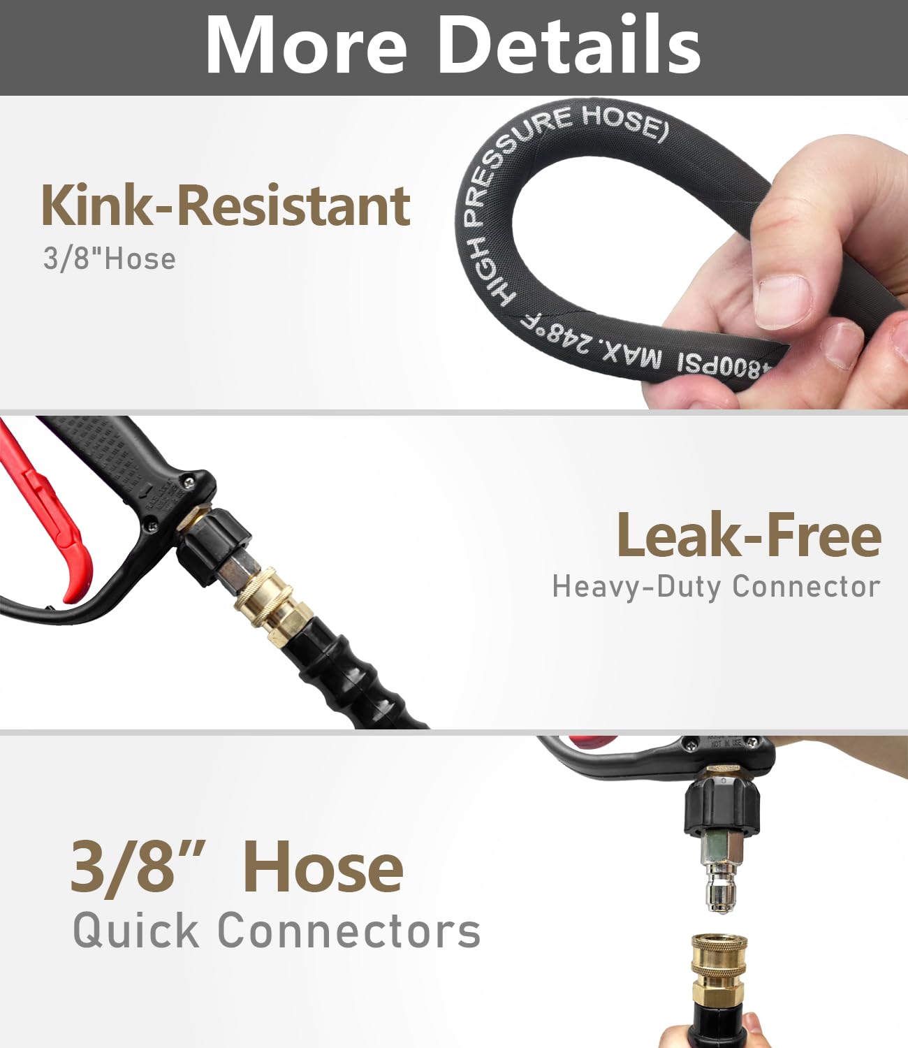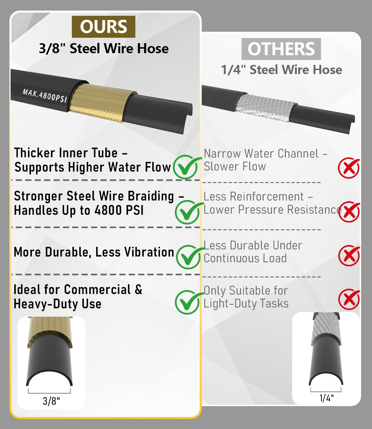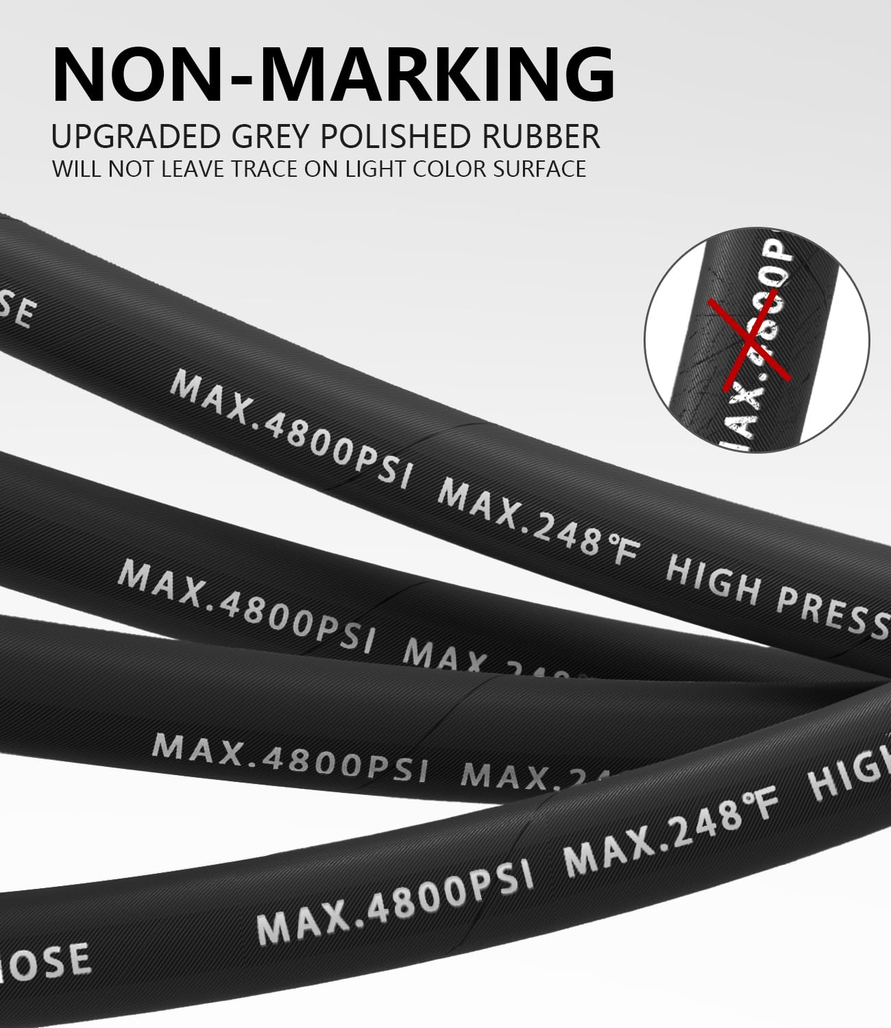 【3/8" Industrial Hose – More Flow. More Muscle.】This 3/8" power washer hose delivers higher flow and pressure than 1/4" hoses. Made of premium synthetic rubber and steel wire braid for top durability and flexibility. Rated 4800 PSI working, 16,000 PSI burst. Heat-resistant to 120°C (248°F), ideal for hot or cold water. Perfect for commercial, industrial, and residential cleaning. Built tough for heavy-duty jobs.