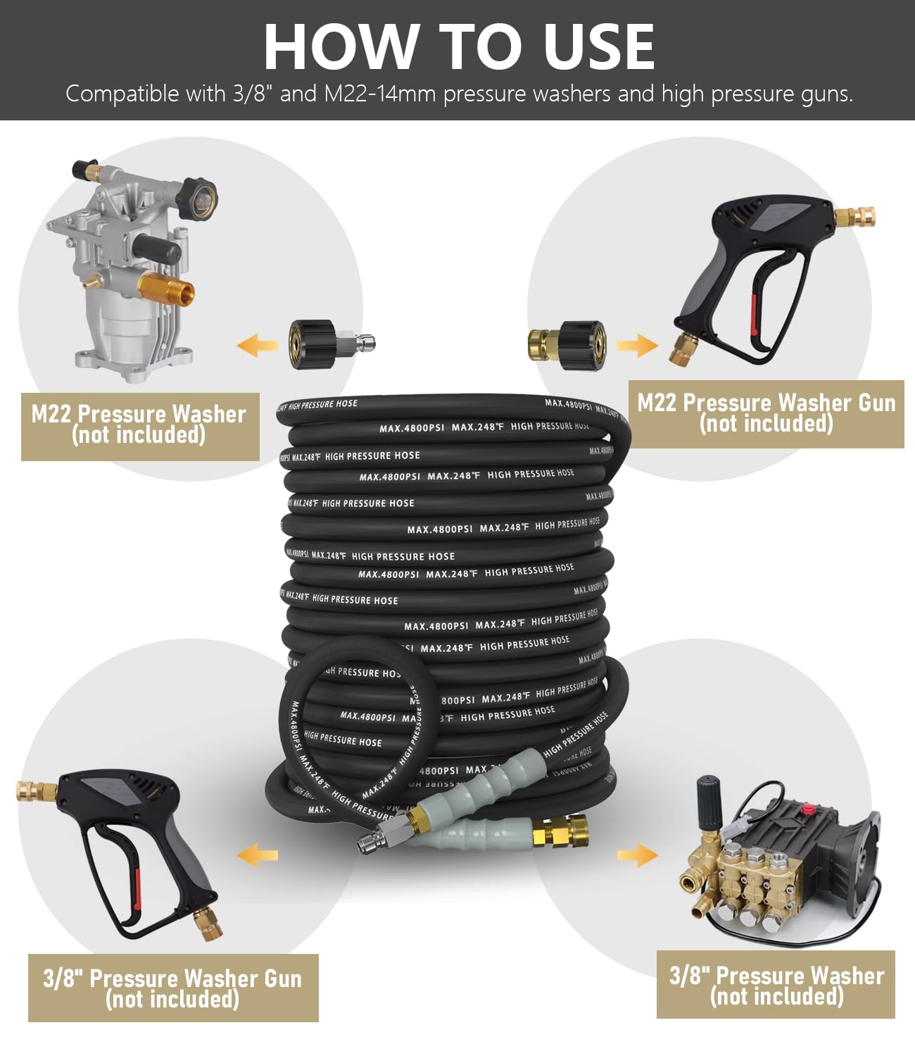 【Compatible with Most Major Brands】Equipped with 3/8" quick connectors and 3/8" to M22-14mm couplers, this high-pressure hose fits most pressure washers—including Honda, Simpson, Troy-Bilt, Generac, Champion, Westinghouse, Husqvarna, Craftsman, Subaru, and more. Built for heavy-duty cleaning performance.