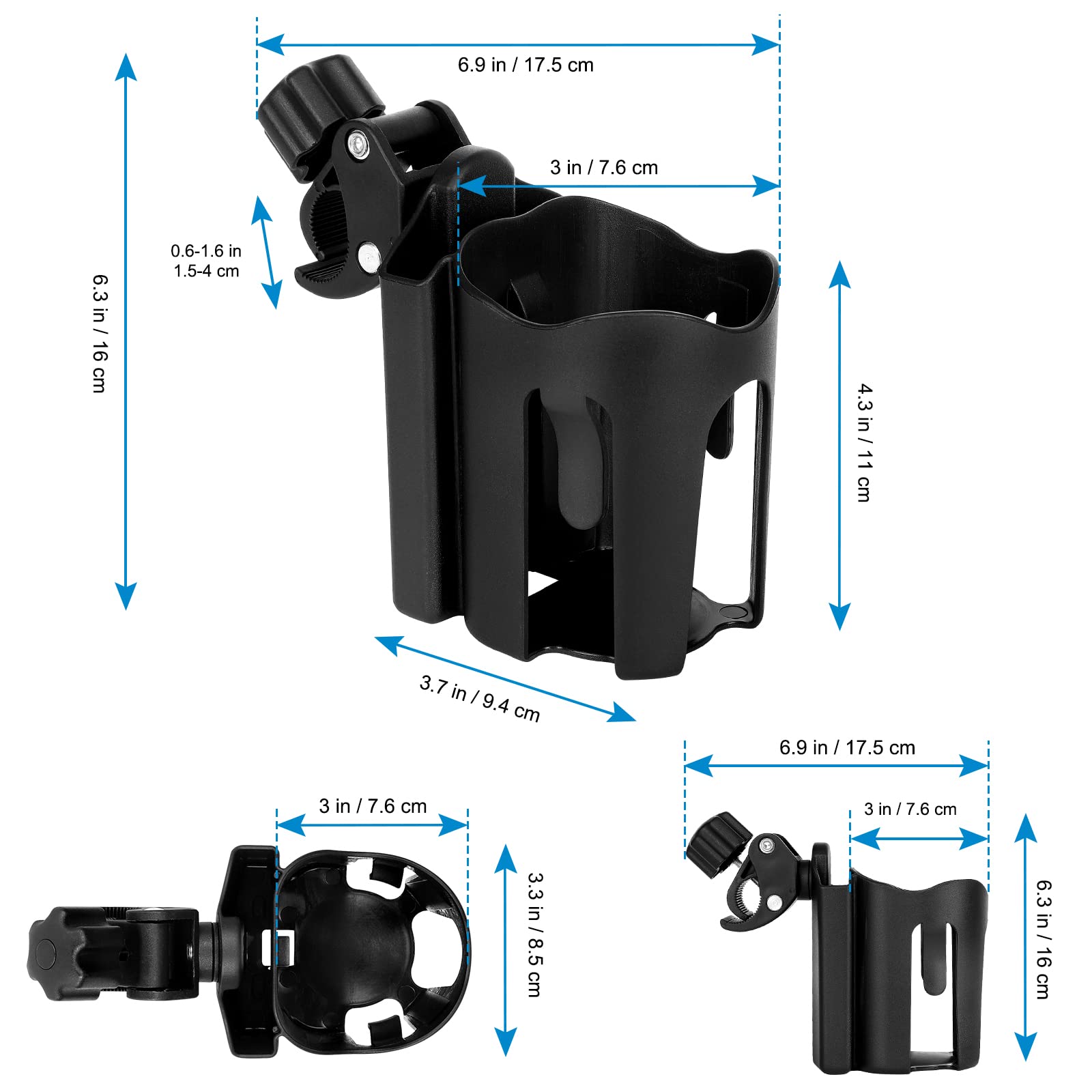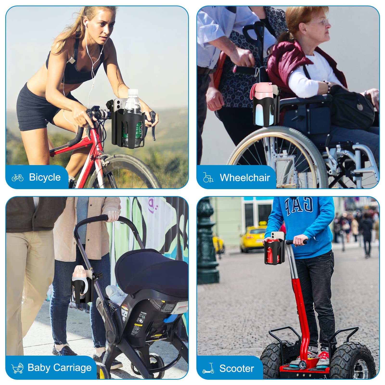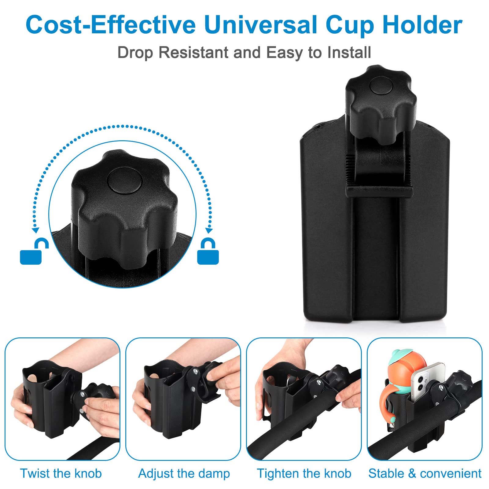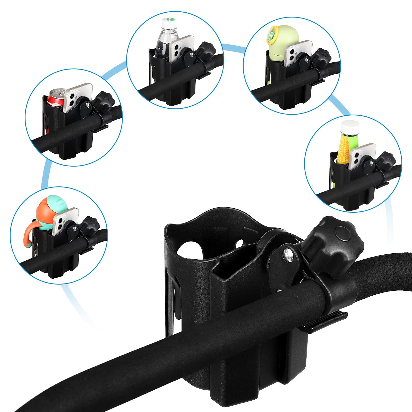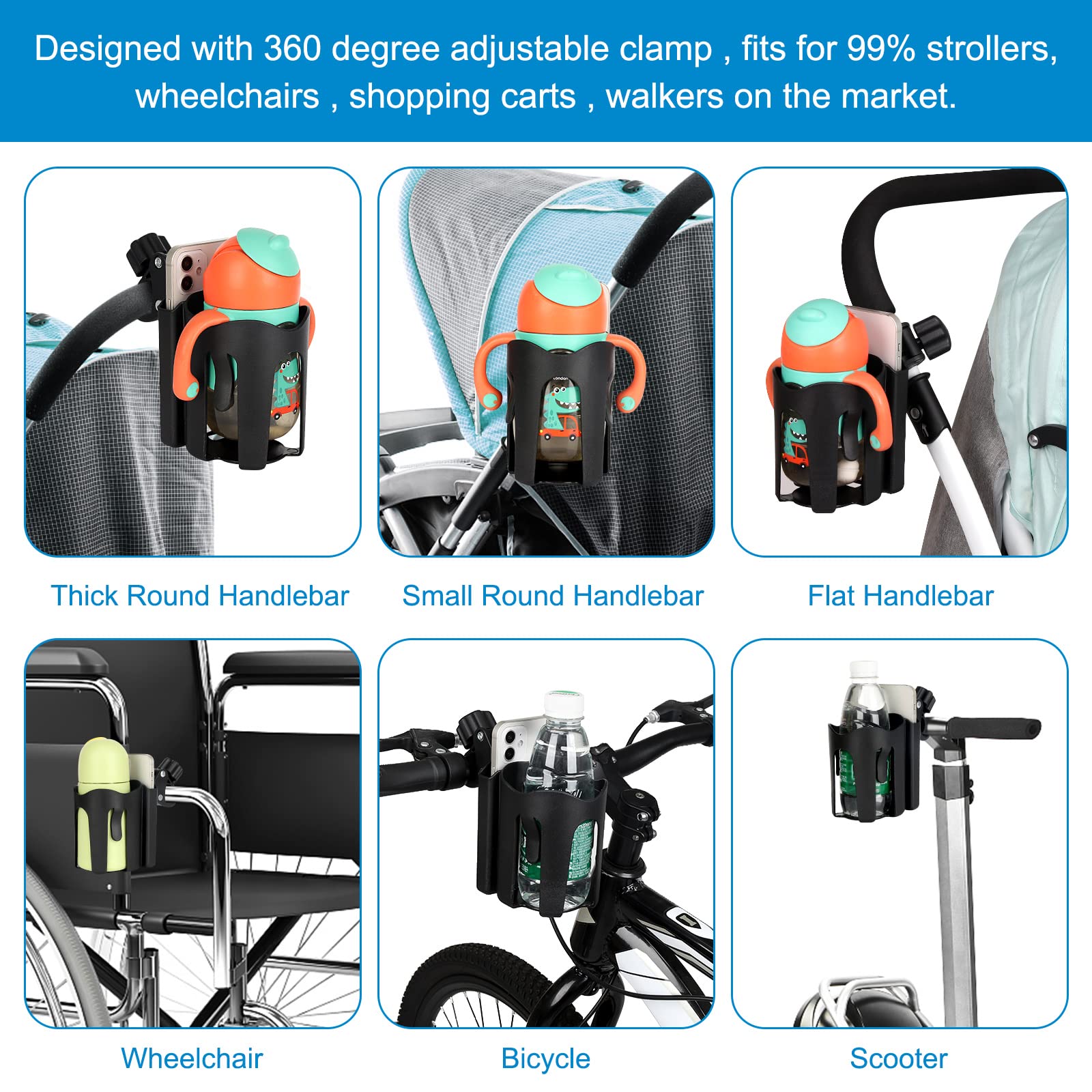 This 2 in 1 universal cup holder fits for most baby strollers, walker, wheelchair, bicycle, scooter, boat handle bar, shopping cart, kayak, ATV, lawnmowers, motorcycle, treadmill etc.