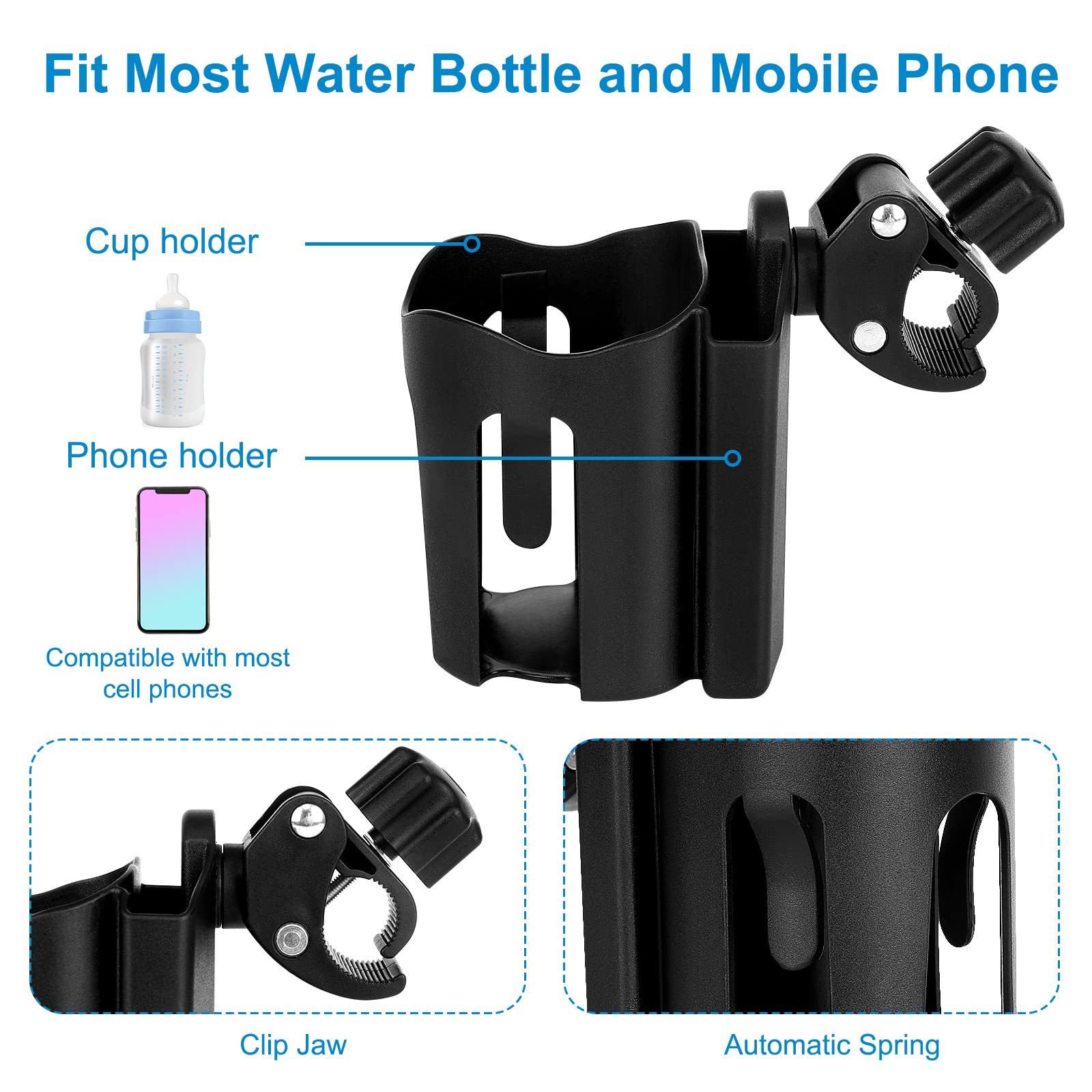 The cup holder is made with phone holder, it can load drink bottles and mobile phones at the same time. You can see new messages, incoming calls in the first time, when you are pushing a stroller or running on a treadmill etc. It fits for phones under 6.2 inches.