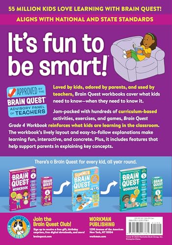From hundreds of curriculum-based activities, exercises, and games in every subject to a new technology section, progress map, and stickers, discover the ultimate fourth grade workbook from America's #1 educational bestseller. Loved by kids, teacher approved, and trusted by parents, Brain Quest Grade 4 Workbook reviews and reinforces what children are learning in the classroom in an instantly engaging, entertaining way. Each page is jam packed with fun activities, practice exercises, and games covering vocabulary, language arts, math word problems, multiplication and division, fractions and decimals, geometry and measurement social studies, science, and much more. What’s New? Technology section Introduces children to computer science, coding, and logic Updated content Activities and illustrations are revised to reflect the diversity of children, their families, and experiences Support for parents and children Section openers preview upcoming content and provide directions and suggestions to help make learning stick A fun progress sticker mapwith stickers Helps children celebrate their accomplishments as they complete each section of the workbook Comes with A completion certificate Mini Smart Card question-and-answer deck Aligned with national and state standards and reviewed by award-winning teachers, this workbook appeals to children’s natural curiosity, with interactive layouts and easy-to-follow explanations that take the intimidation out of learning. Plus, it’s written to help support parents with explanations of key concepts for homework help!