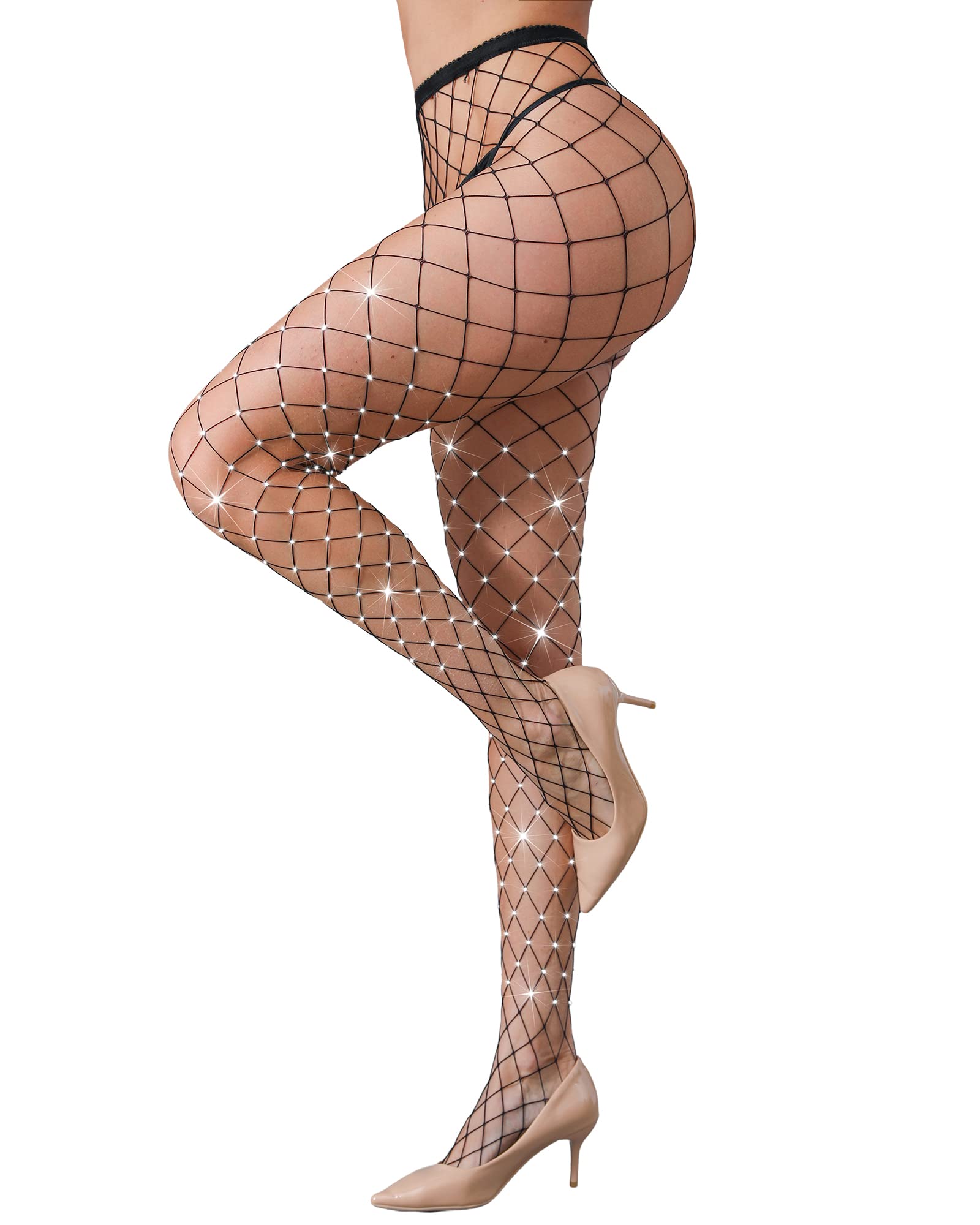 【ELASTICITY MATERIAL】Material : 90% Polyester, 10% Spandex, Soft, comfortable, breathable. Fishnet tights has a good elastic, very comfortable to wear in the legs. CHRLEISURE's stockings upgraded fabric, than most of the fishnet stockings on the market more solid, not easy to hook broken. Rhinestones are all over the fishnets and securely glued on. The Sparkly fishnets stockings bring gorgeous visual effect, and makes you more charming and sexy