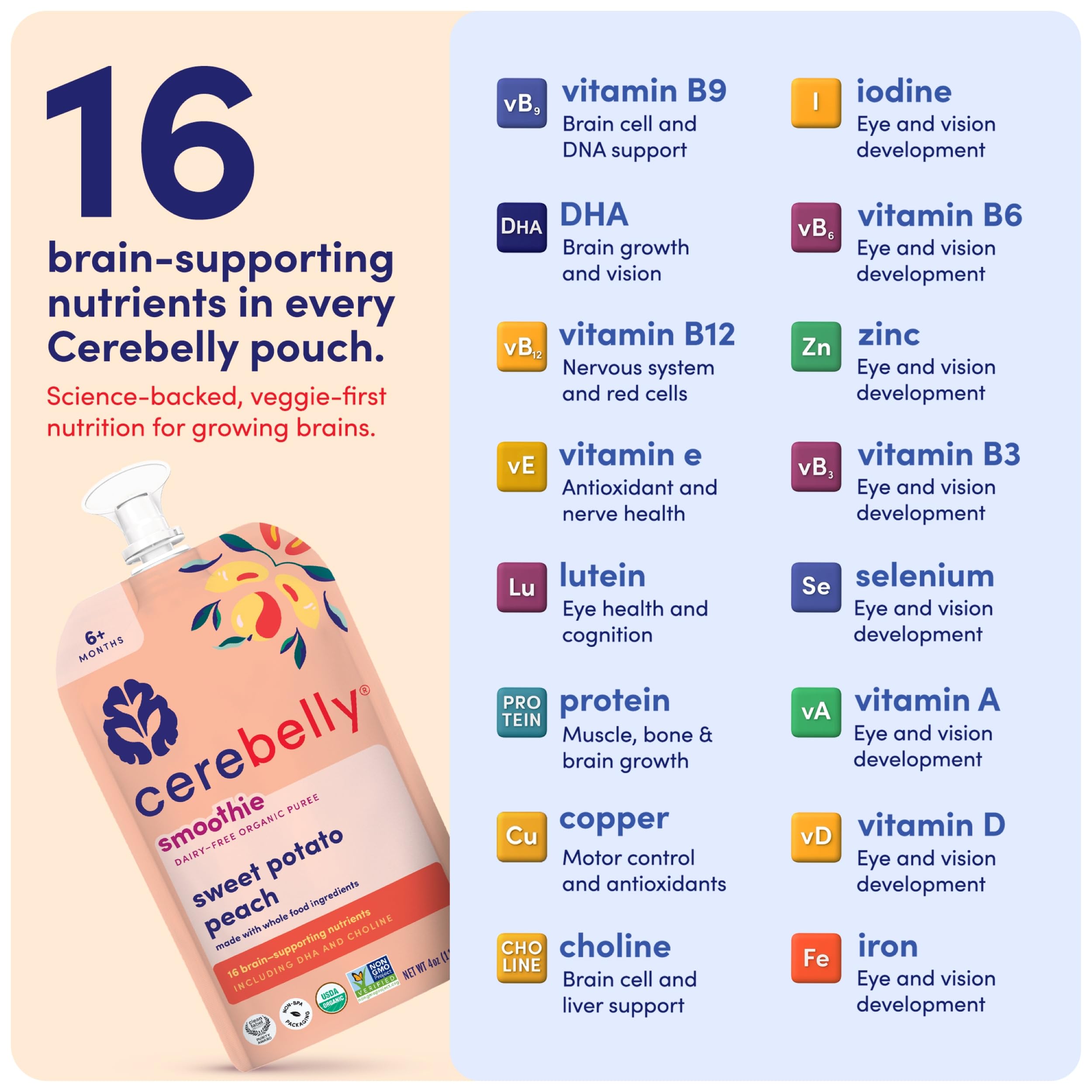 16 BRAIN-SUPPORTING NUTRIENTS β Baby smoothie pouches with vitamin A, iron & vitamin D to fuel healthy brain and body development