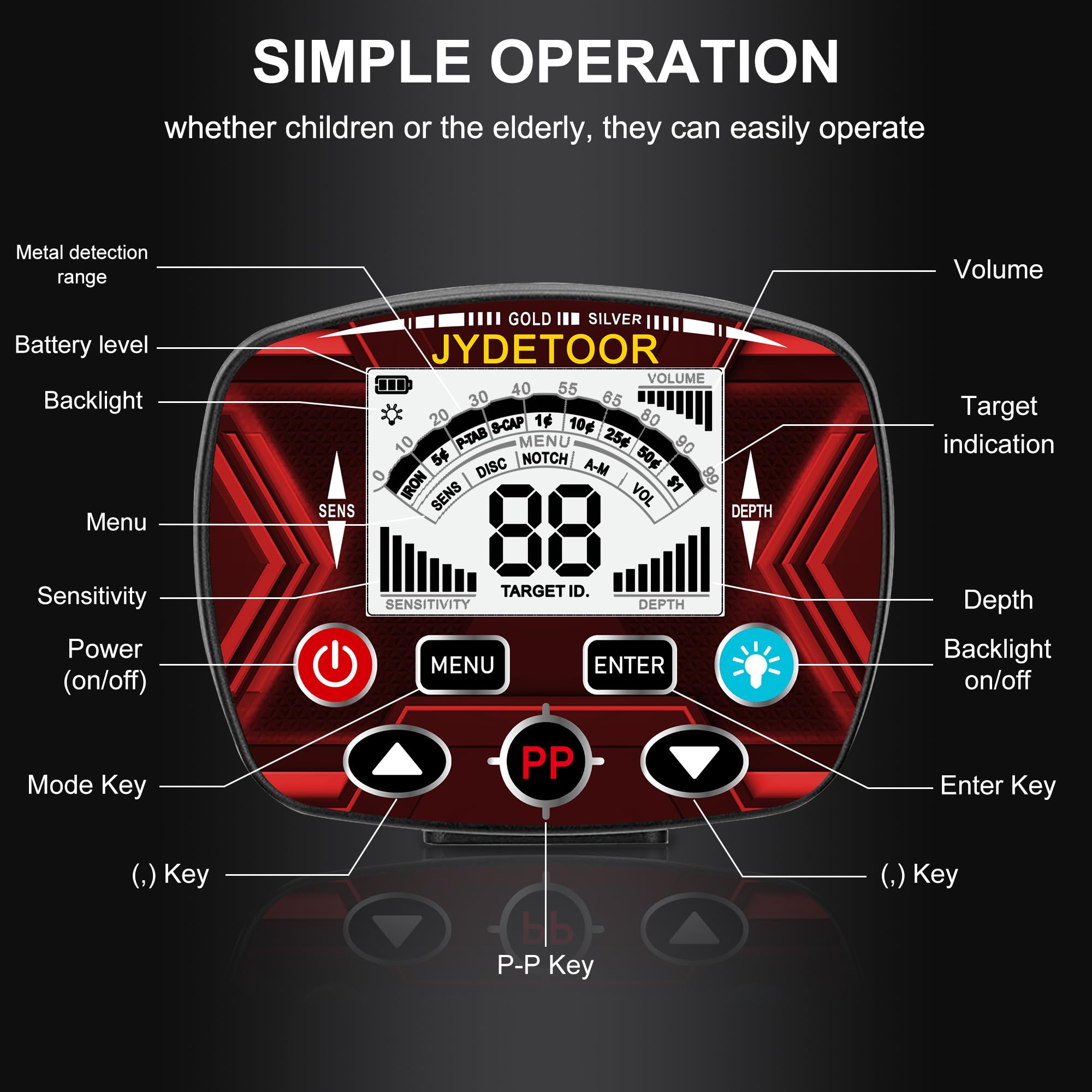 Intuitive LCD Display: Exclusively displaying a backlit screen allows you to get the detection dynamics right away. It's convenient for you to get the type of metal target, depth, sensitivity level, operating mode, and battery indication, which let you detect more efficiently and is time-saving.