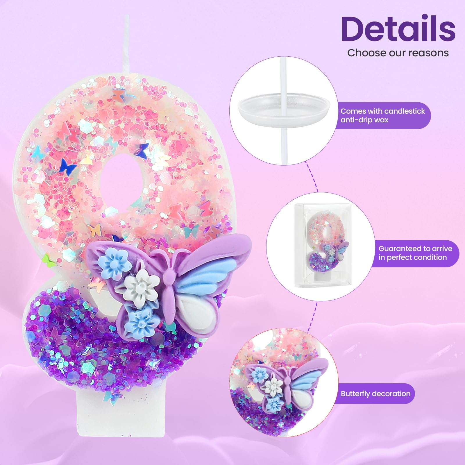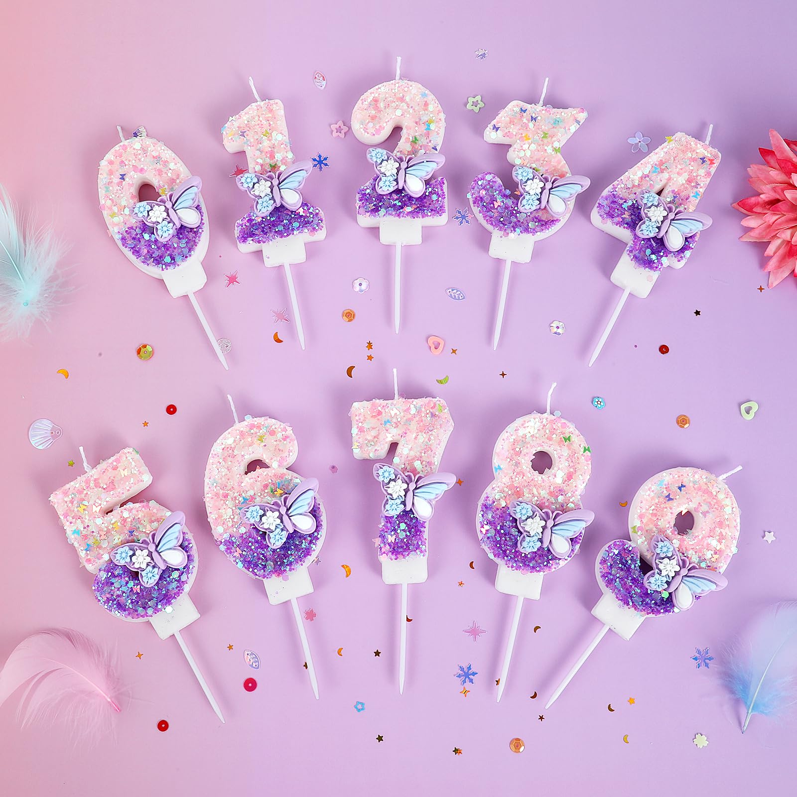 Beautifully crafted pink and purple number candles with sparkling sequins and butterflies.