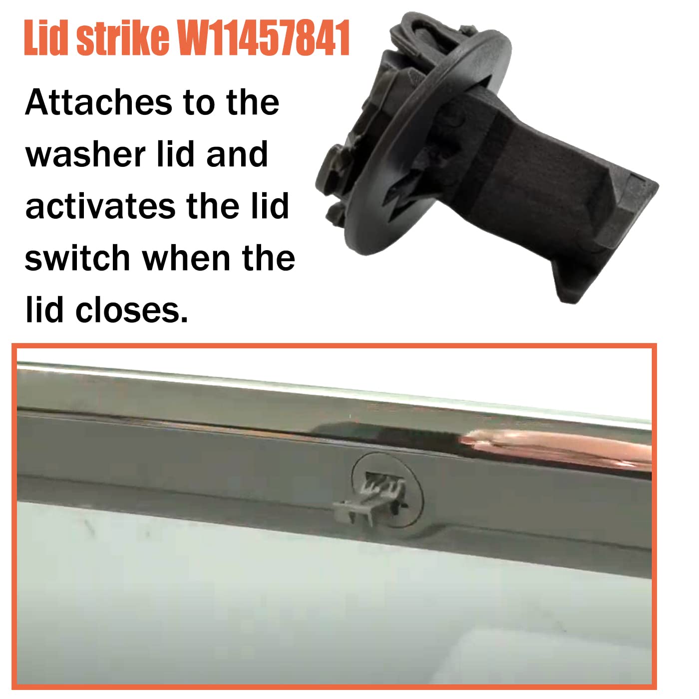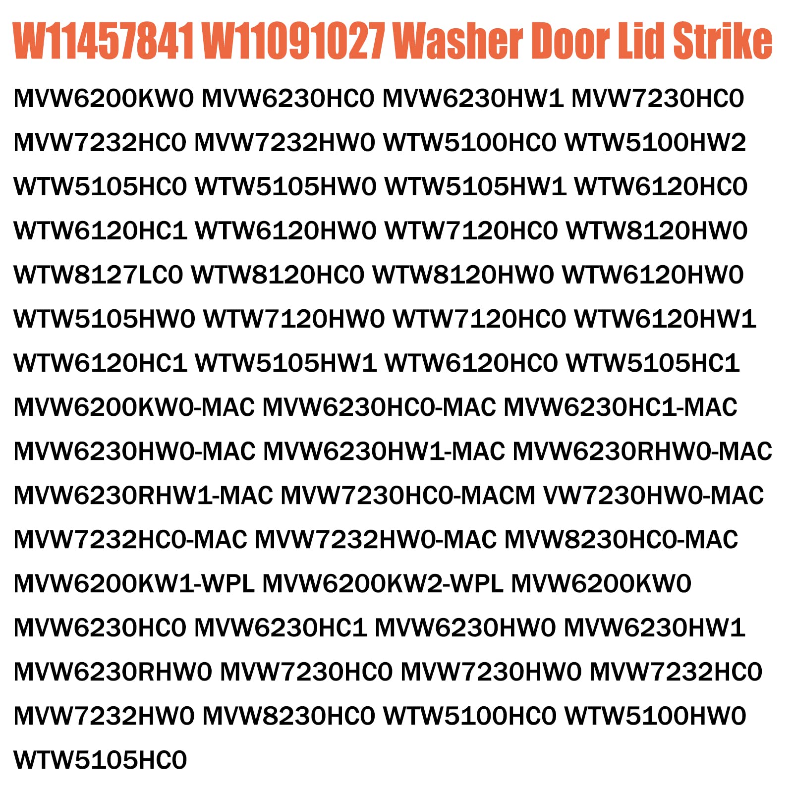 【W11457841 washer lid strike】 【W11457841 washer lid strike】Compatible with: Whirlpool,Kenmore,Maytag KitchenAid,Magic Chef,Jenn-Air, Amana,Roper, Admiral,Norge, washing machine. Replacement : W11091027, 4959179, AP6987306, PS16218028, EAP16218028, PD00061788. 【W11091027 Washer Lid Strike】 Fits washing machine models :MVW6200KW0 MVW6230HC0 MVW6230HW1 MVW7230HC0 MVW7232HC0 MVW7232HW0 WTW5100HC0 WTW5100HW2 WTW5105HC0 WTW5105HW0 WTW5105HW1 WTW6120HC0 WTW6120HC1 WTW6120HW0 WTW7120HC0 WTW8120HW0 WTW8127LC0 WTW8120HC0 WTW8120HW0 WTW6120HW0 WTW5105HW0 WTW7120HW0 WTW7120HC0 WTW6120HW1 WTW6120HC1. 【Replacement Washer Lid Strike】 Fits washing machine models :MVW6200KW0-MAC MVW6230HC0-MAC MVW6230HC1-MAC MVW6230HW0-MAC MVW6230HW1-MAC MVW6230RHW0-MAC MVW6230RHW1-MAC MVW7230HC0-MACM VW7230HW0-MAC MVW7232HC0-MAC MVW7232HW0-MAC MVW8230HC0-MAC MVW6200KW1-WPL MVW6200KW2-WPL MVW6200KW0 MVW6230HC0 MVW6230HC1 MVW6230HW0 MVW6230HW1 MVW6230RHW0 MVW7230HC0 MVW7230HW0 MVW7232HC0 MVW7232HW0 MVW8230HC0 WTW5100HC0 WTW5100HW0 WTW5105HC0 WTW5105HC1 WTW5105HW1 WTW6120HC0. 【Premium Quality】 Washer Door Strike It has a durable plastic construction for reliable use.Lid strike W11457841 attaches to the washer lid and activates the lid switch when the lid closes. If your washer lid or door won't close, or won't start at all, you likely have a faulty door strike. 【Easy to Install】 Installation is simpler than you'd expect. To replace, rotate counter-clockwise to break the retaining tab and pull back.To install, rotate clockwise until you hear the retainer tab click into place.