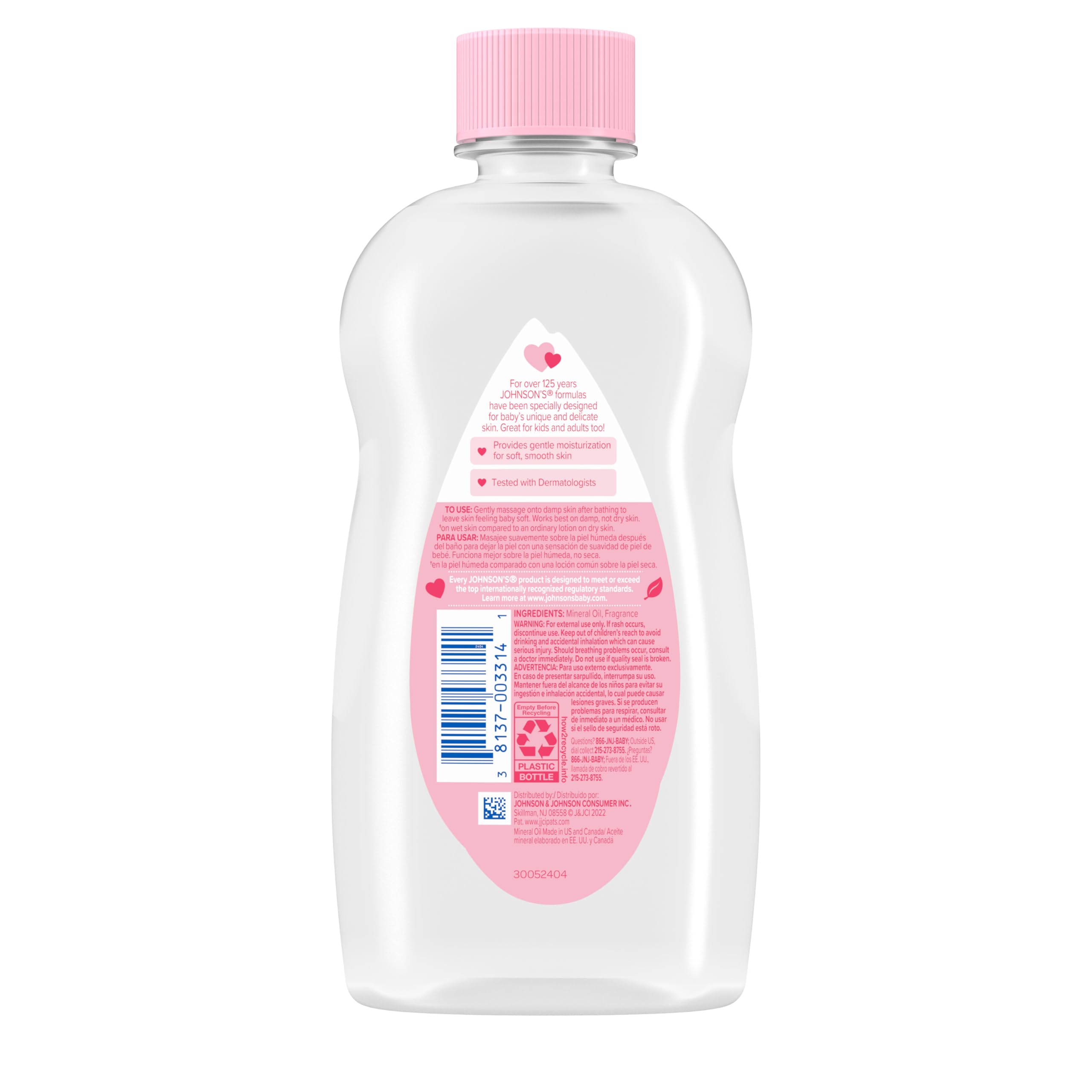 Our Johnson's baby oil locks in up to 10 times more moisture *on wet skin than an ordinary lotion can on dry skin, leaving your baby's skin soft and smooth. It is clinically proven to help prevent excess moisture loss. This gentle baby mineral oil is easy to spread, so it's great for baby massage. Formulated to help moisturize babies' delicate skin and great for relieving your dry, rough patches, this baby oil is a clinically proven mild and gentle formula for your baby's skin. Allergy- and dermatologist -tested, this gentle, lightly scented oil leaves skin feeling soft and smooth, and is easy to spread, so it's ideal for baby massage. Use after bath when you want to help seal in moisture and refresh dry skin. Baby massage can be a relaxing, bonding experience for you and your baby.