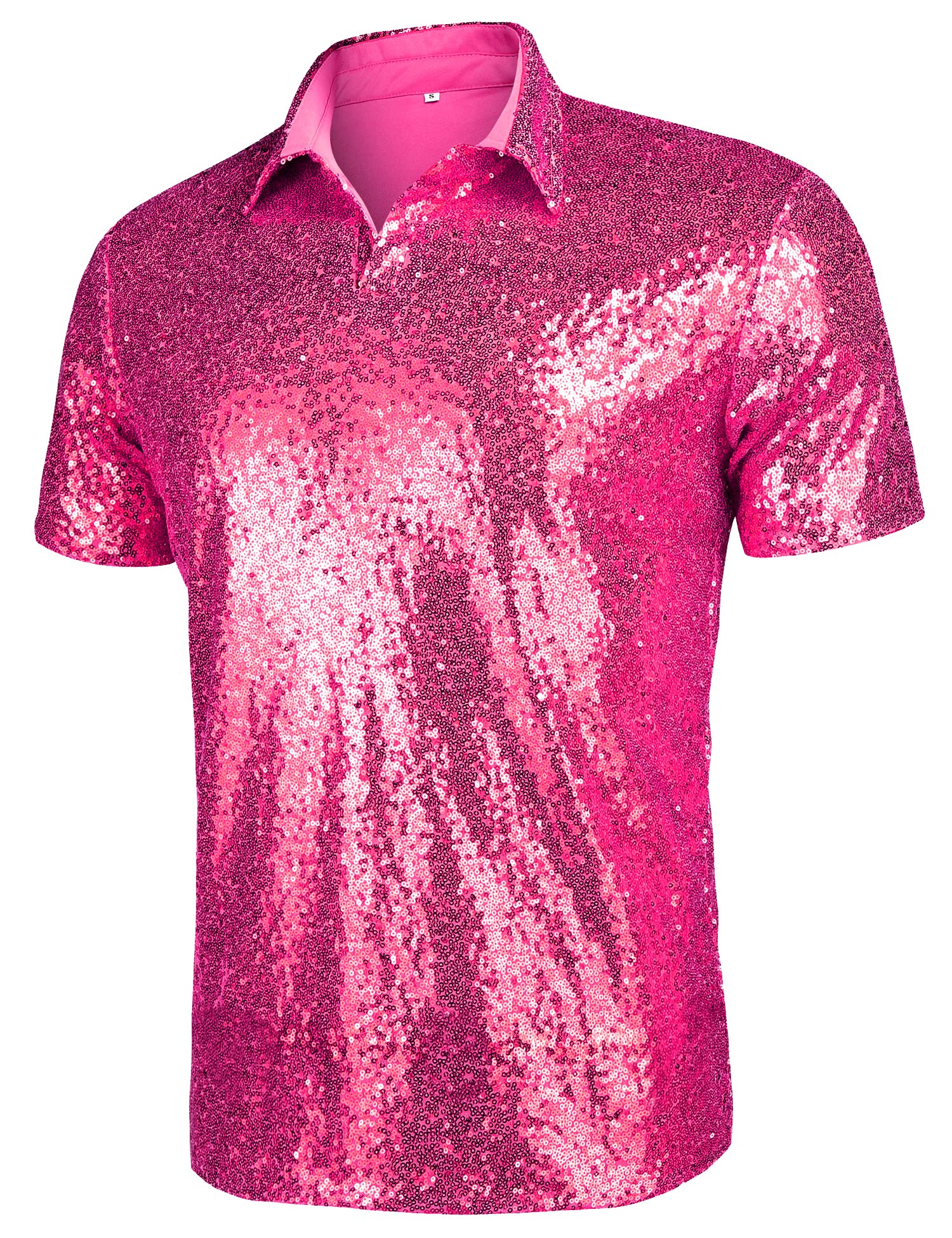 Unique Design: Our sequin disco polo shirt features a double-layered design that includes a sequin-covered outer layer and a full mesh-lined inner layer. The mesh layer provides added comfort and protects the skin from scratching, while the full sequin layer decoration adds a sparkling and shimmering effect
