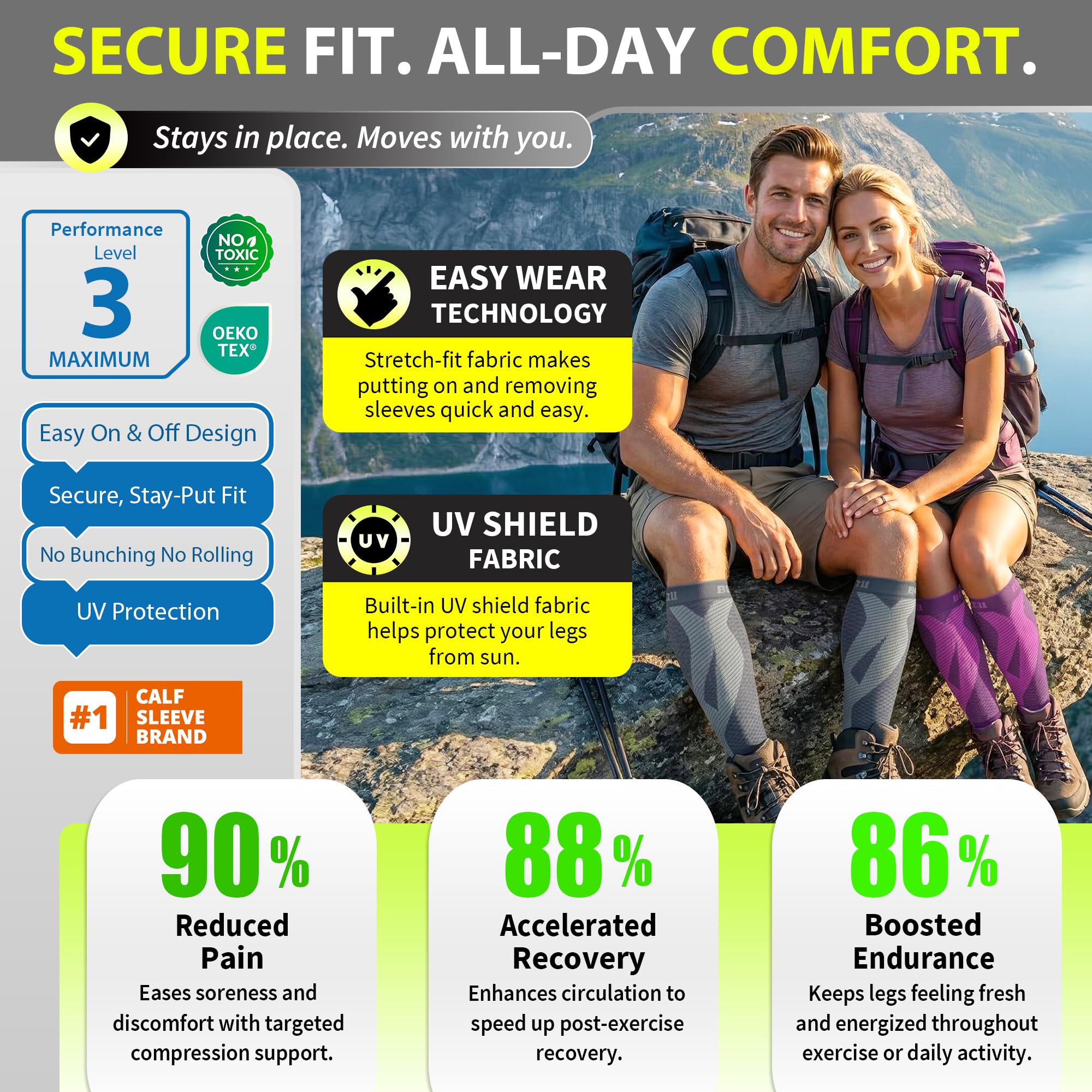 Patented Kinesiology Strips for Targeted Pain Relief: Developed and patented in New York, our calf compression sleeves incorporate advanced kinesiology strips that provide superior support, stability, and pain reduction. Designed using the renowned kinesiology technique, these strips promote natural pain relief and accelerate recovery by improving muscle function and reducing fatigue.