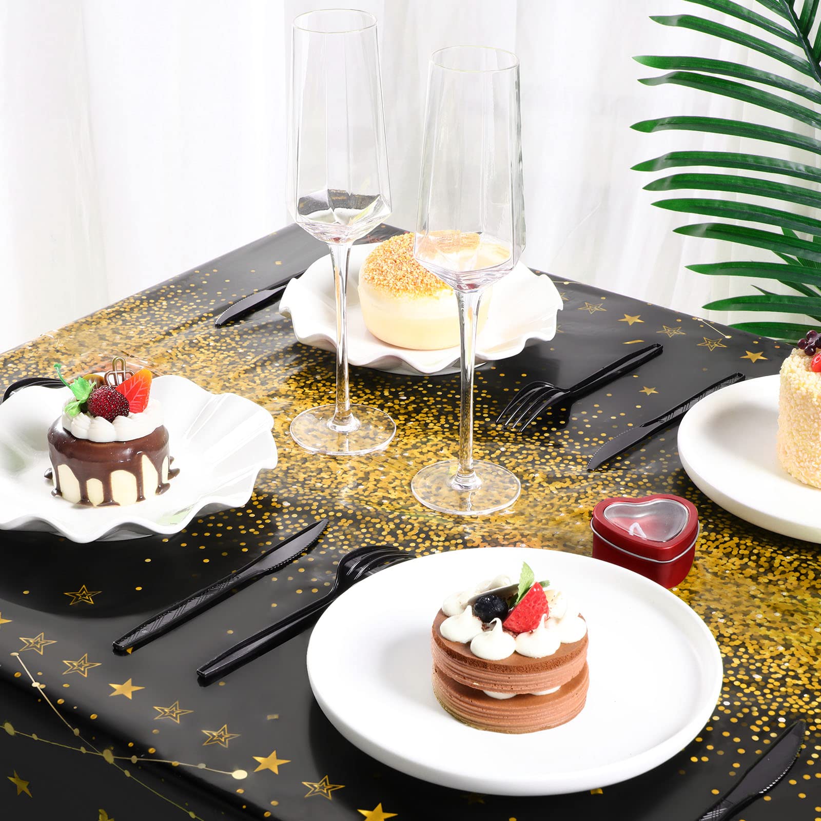 Reliable Material: these gold and black table cloths are made of quality plastic, sturdy and reliable, not easy to break, tear or fade, waterproof and disposable, keeping your tables away from spilled beverages, oil stains and crumbs and saving your cleaning time after parties