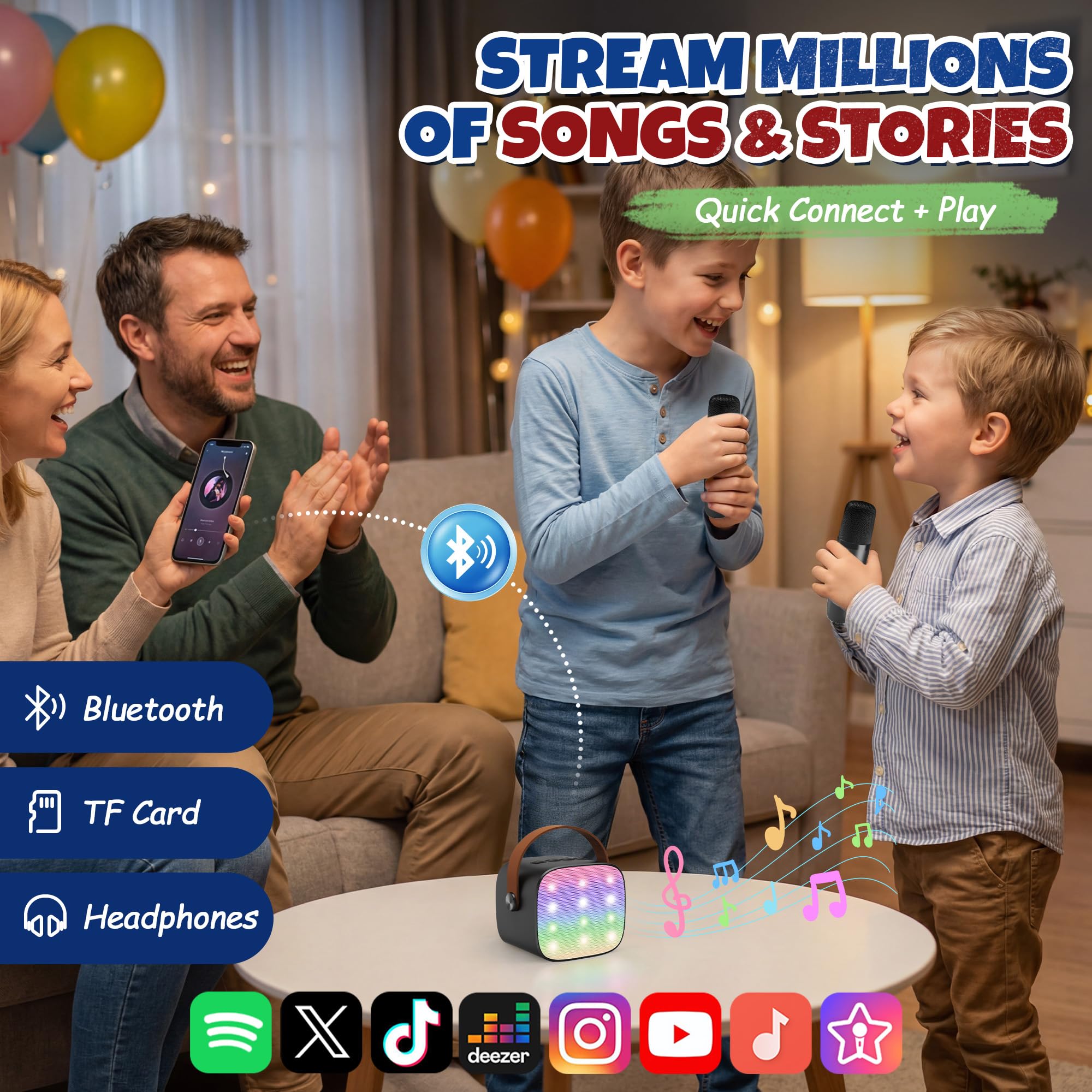 PLAY ANY SONG: Instant Bluetoothed to your Smartphones and tablets with great stability, and play all your favorite songs. Also support TF card (not included)playing. At the same time, plug in your headphones, sing and listen to your own singing voice, good helper for singing practice. Moreover, one key to reduce or restore vocals from Bluetooth music, sing along with the rhythm and have fun
