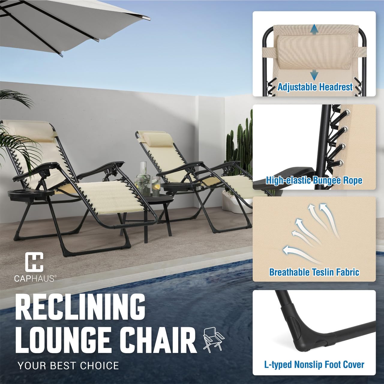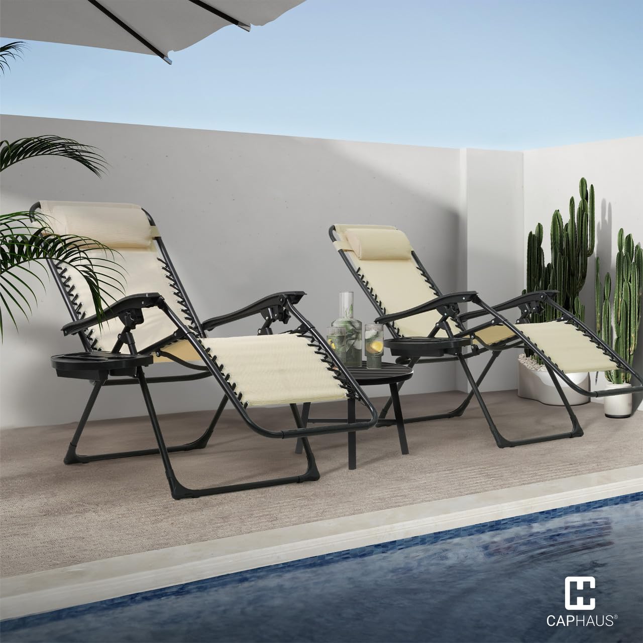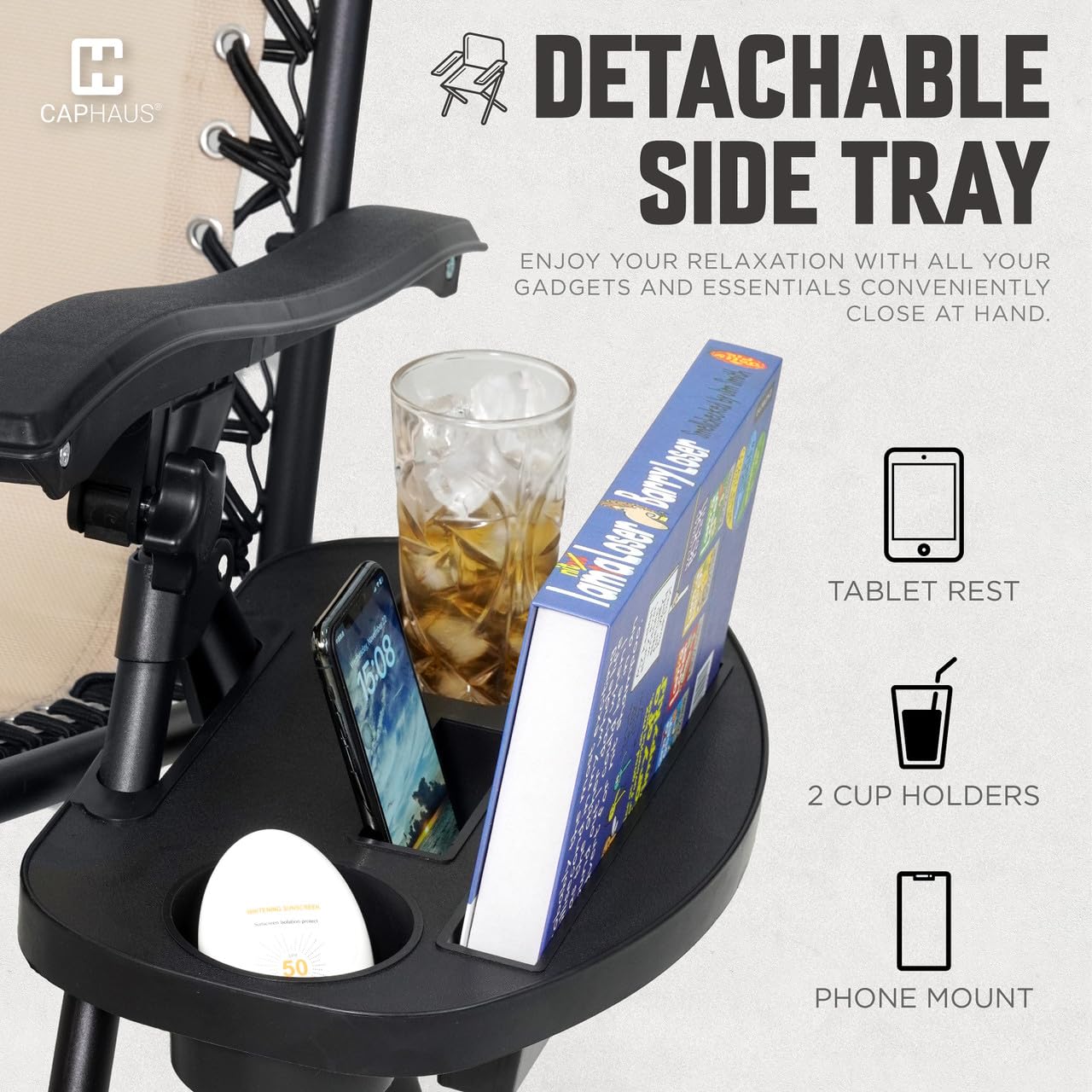 🪑 Detachable Side Trays - Each reclining chair in this set is thoughtfully equipped with a detachable side tray. The tray (15.2"W x 9.4"D x 2.6"H), which includes 2 cup holders, a phone holder and a tablet holder, gives you a convenient and accessible surface to place your drinks, snacks, books or even your favorite gadgets, ensuring you have everything you need within arm's reach as you sunbathe in comfort.