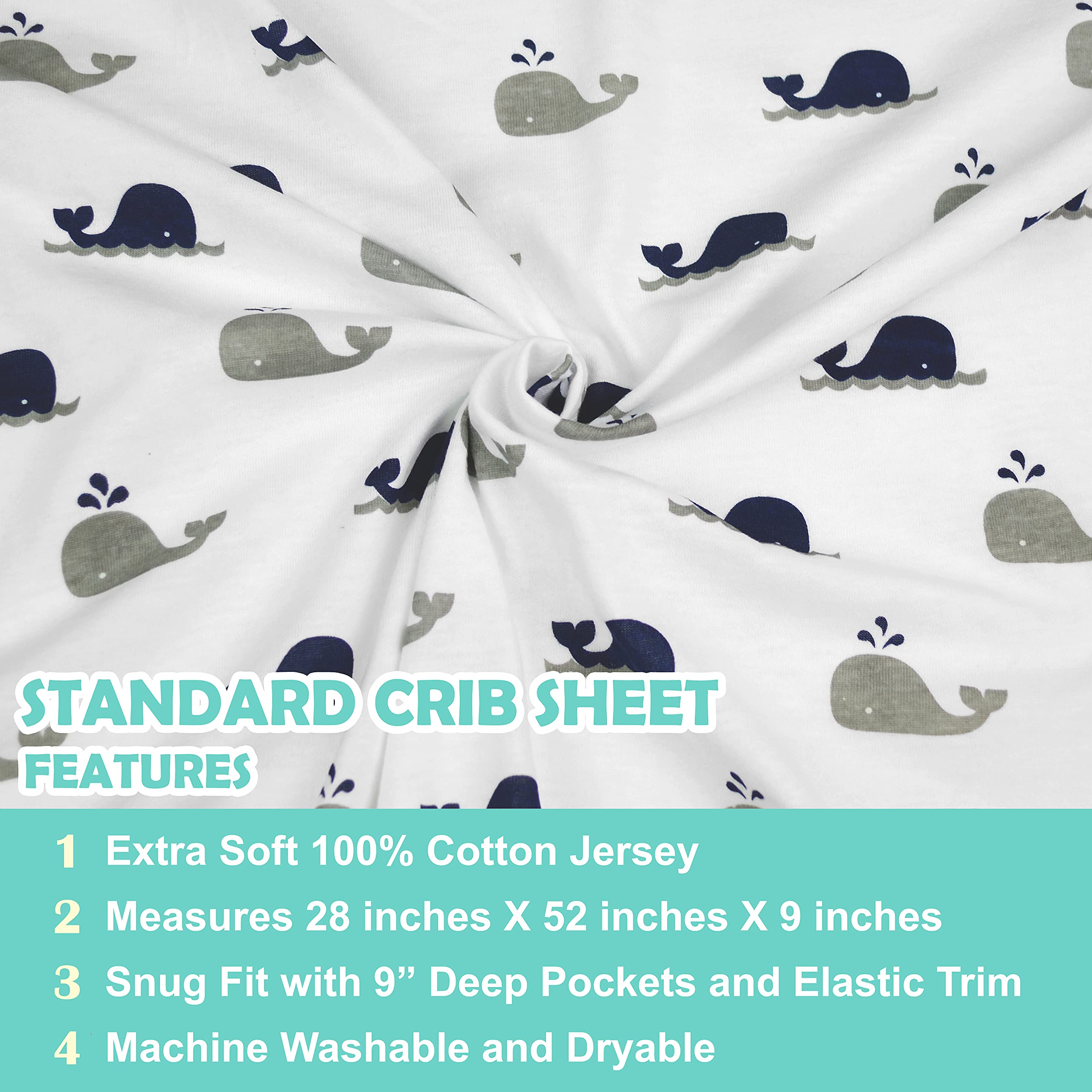 Perfect Fit & Secure Coverage: Made from 100% Cotton Jersey and measuring 28” x 52” with a depth of 9 inches, our crib sheets snugly fit most standard crib mattresses and toddler bed mattresses.