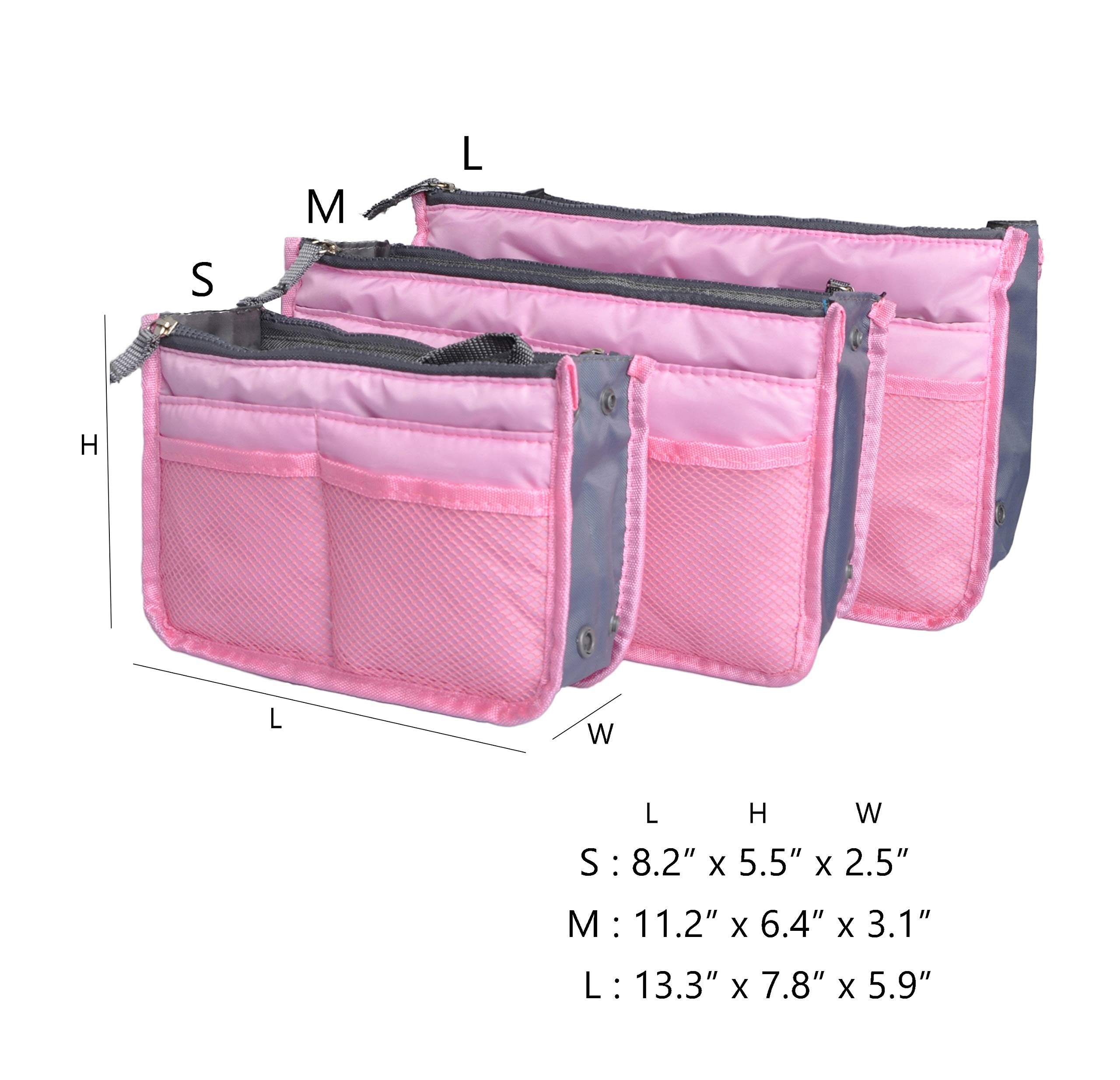 Dimension (Length*Width*Height), Small: 8.2"*2.5"*5.5"; Medium: 11.2"*3.1"*6.4"; Large: 13.3"*5.9"*7.8". Measure your handbags' interior first to make sure you get the fit one.