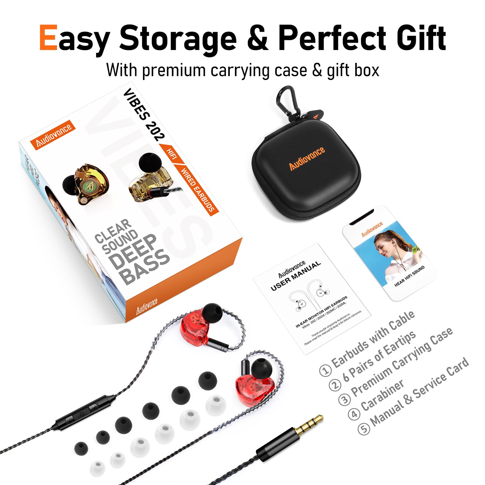What's in the Box: Vibes 202M clear (transparent white) HiFi wired earbuds with silver-plated cable, 6 pairs of eartips, carrying case, carabiner & user manual.