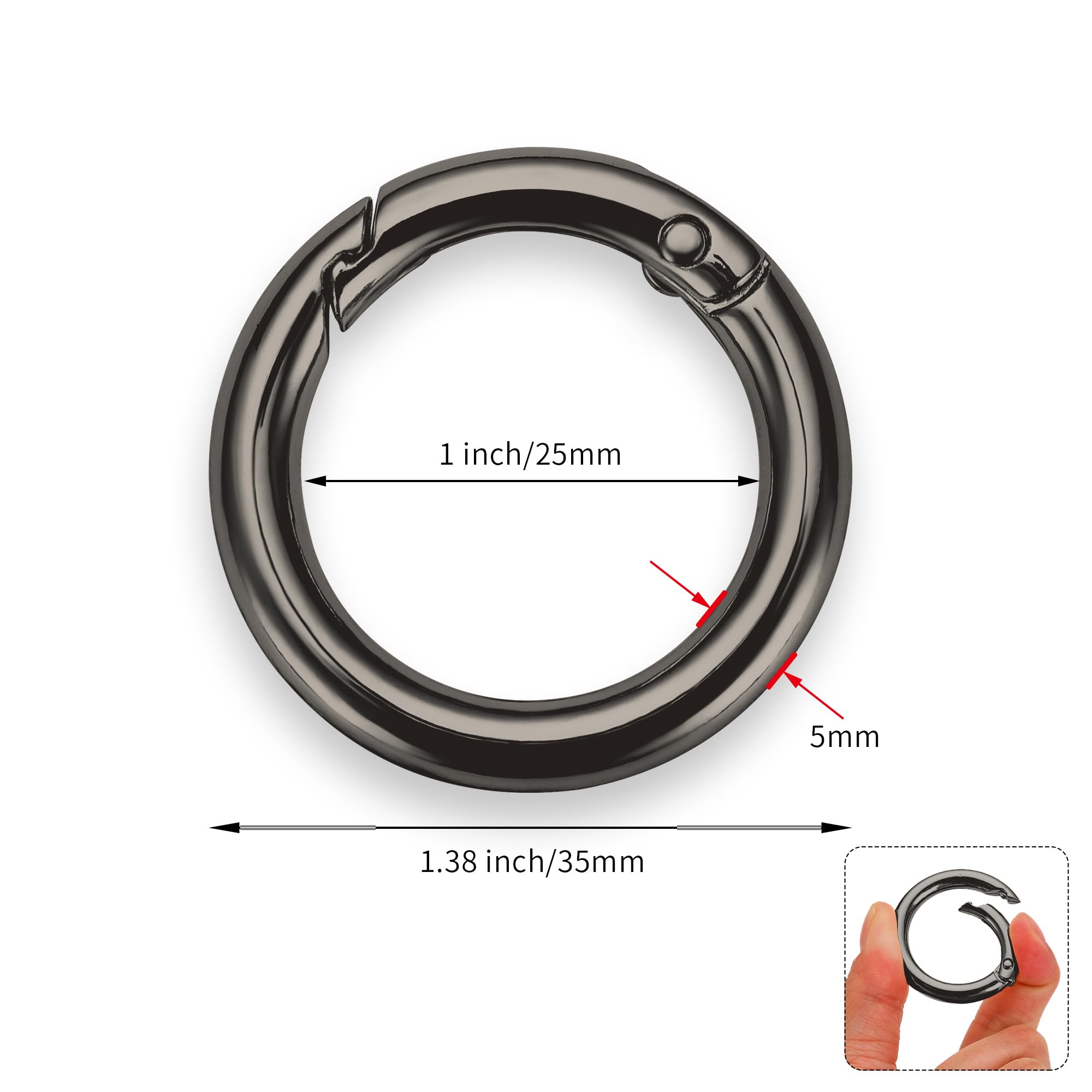 Spring Clasp Carabiner Details: Receive a set of 8 heavy duty key ring. The outer diameter of the round snap ring clip is approximately 1-1/4" (32mm), with an inner diameter of 1" (25mm) and a snap ring thickness of 4mm. The manual measurements may vary by up to ±1mm.