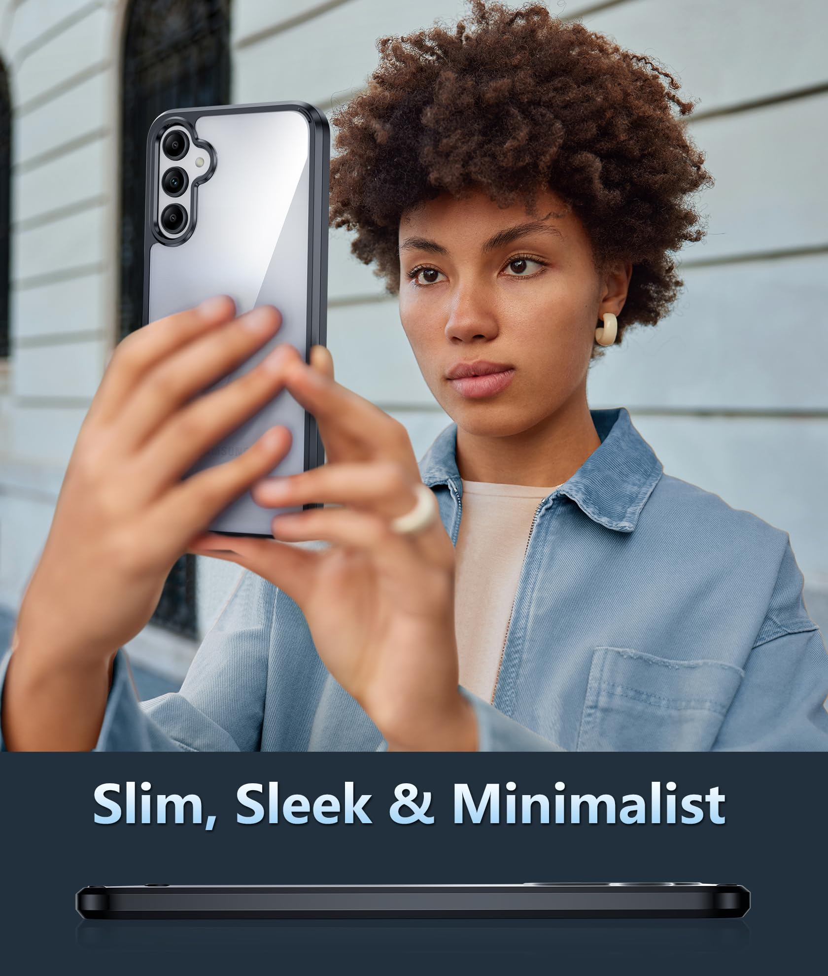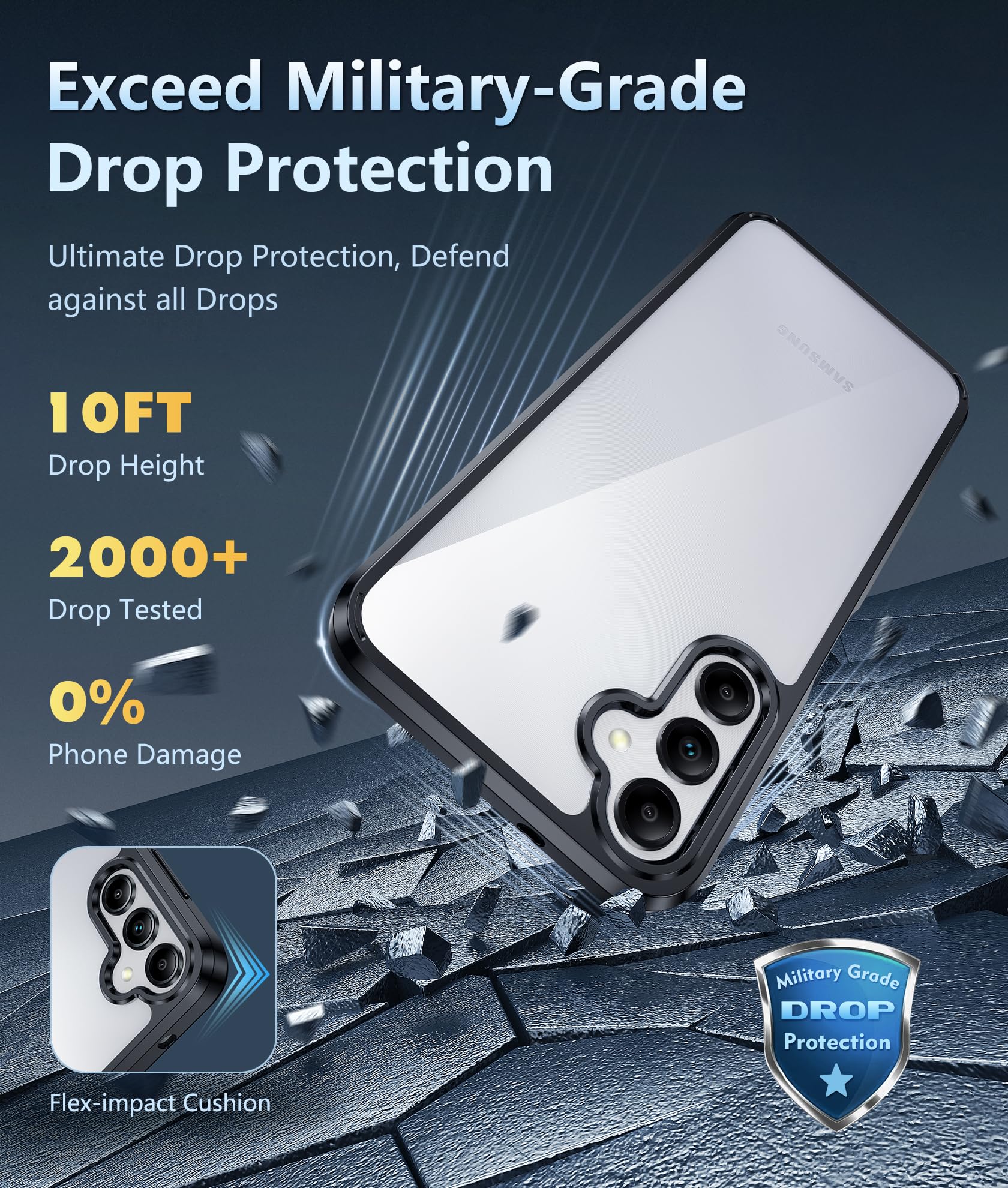 10FT Military Grade Protection: Passed Military Drop Tested up to 10 FT. This Galaxy A14 clear case backplane is made with rigid polycarbonate and flexible shockproof TPU bumpers around the edge and features 4 built-in corner Airbags to absorb impact